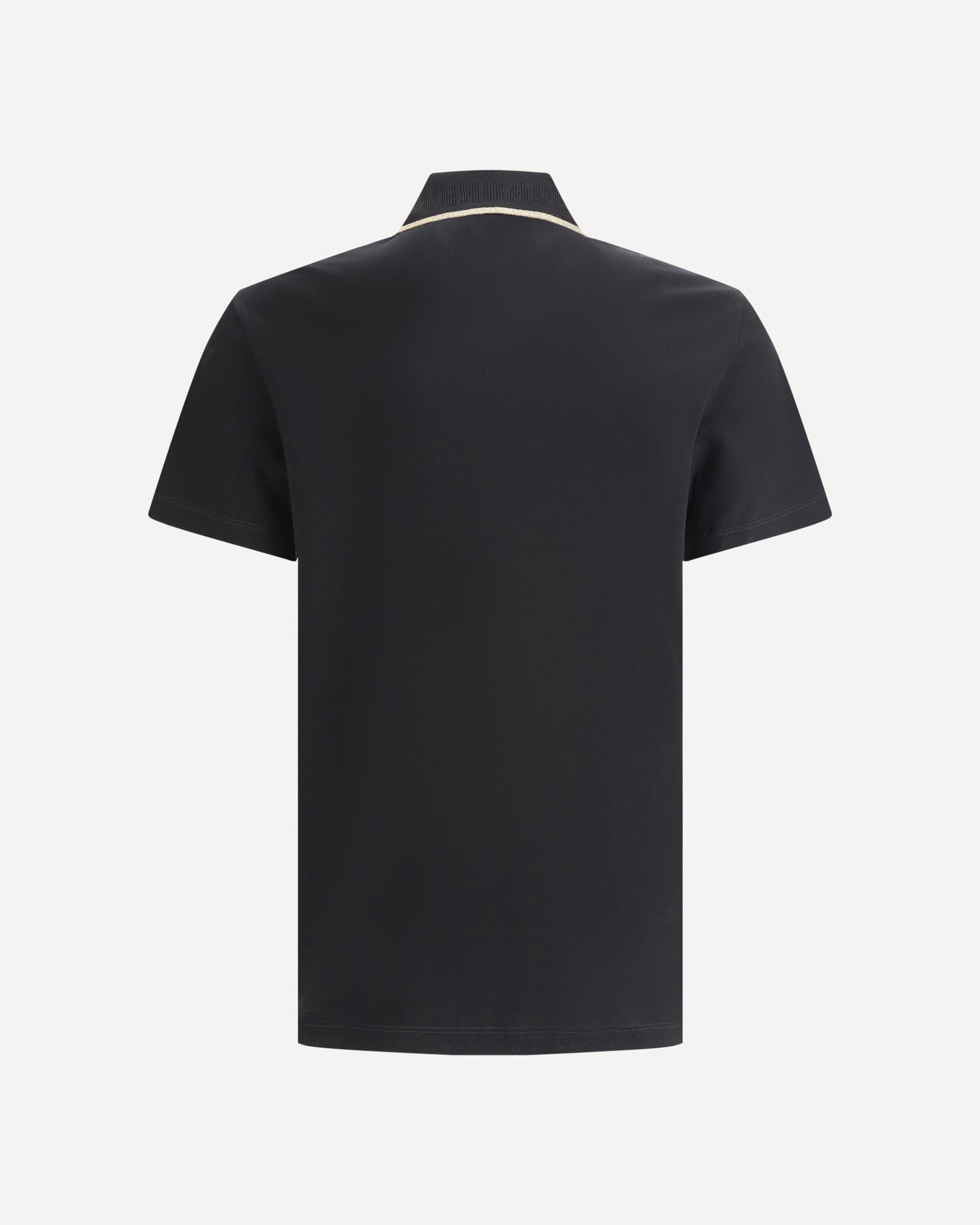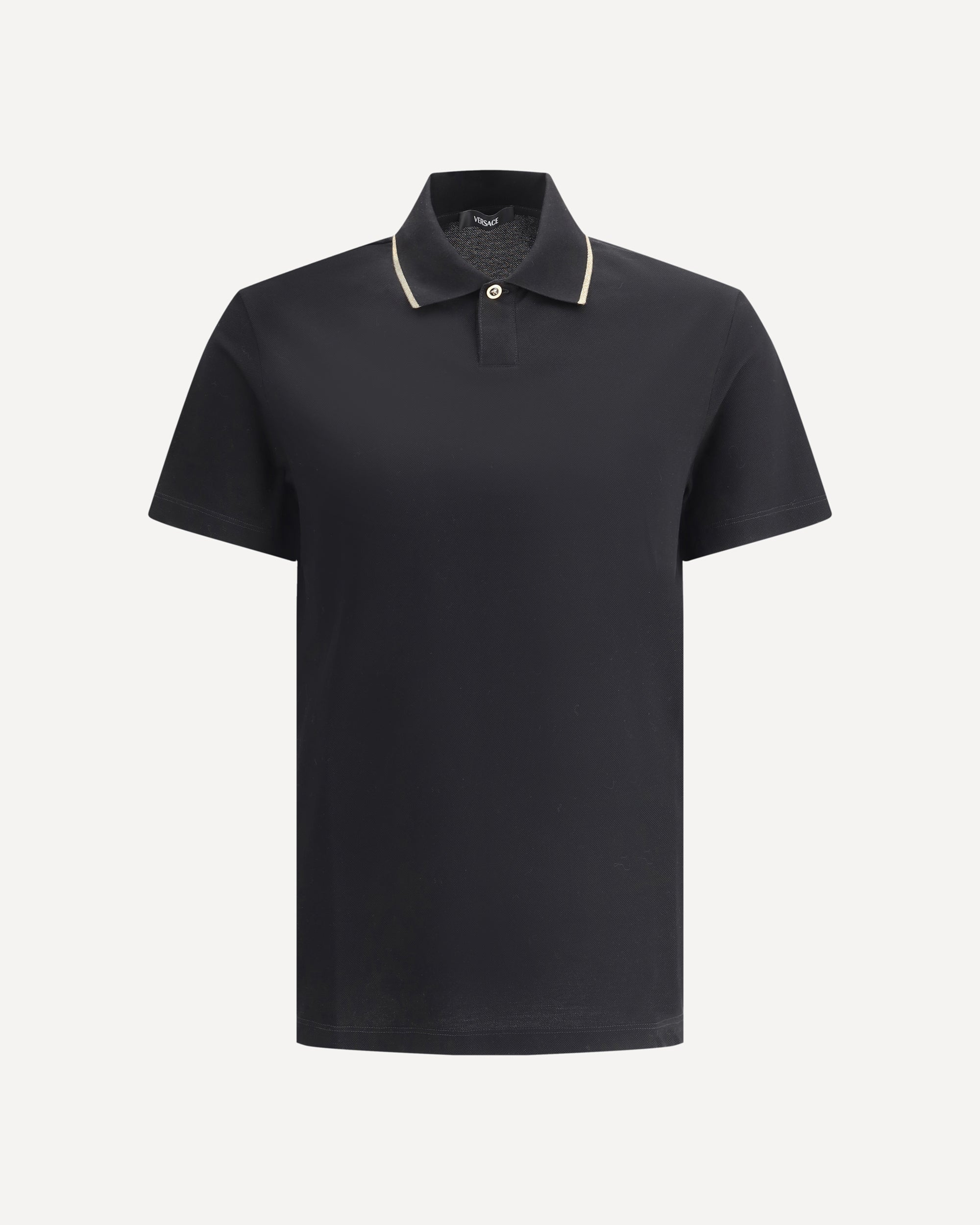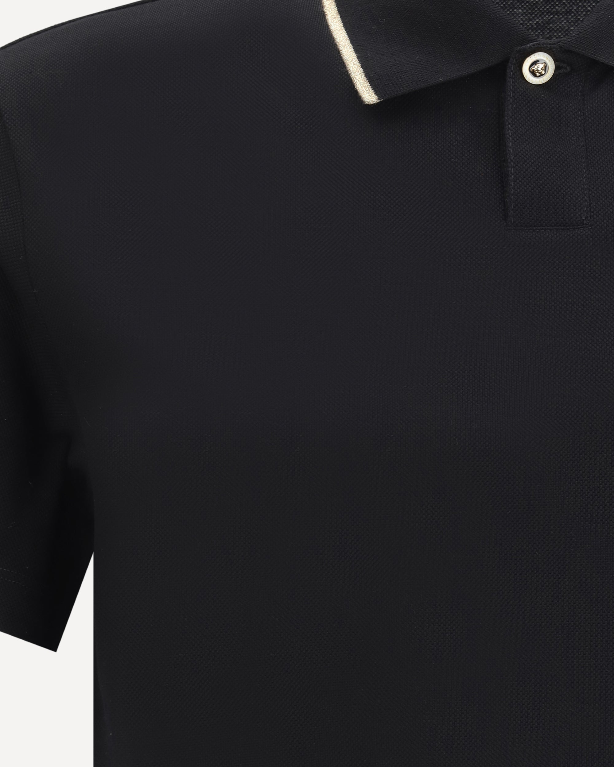 Cotton Polo Shirt by Versace featuring classic ribbed collar, contrasting button front, monochrome pattern, regular fit.
