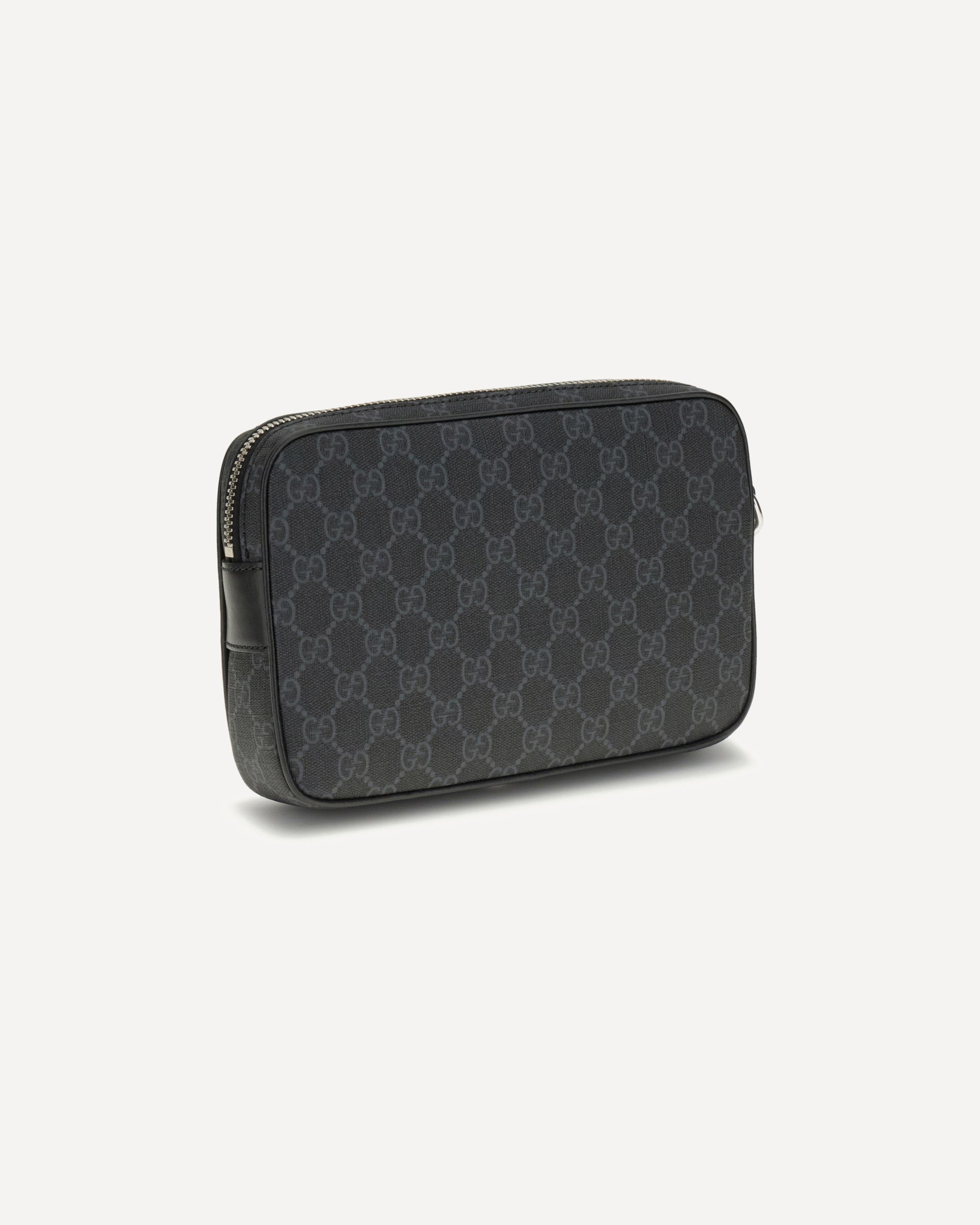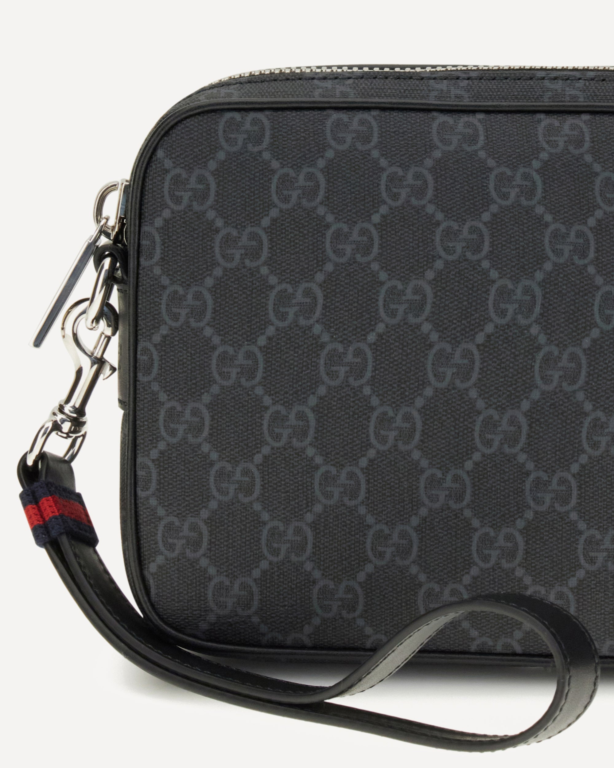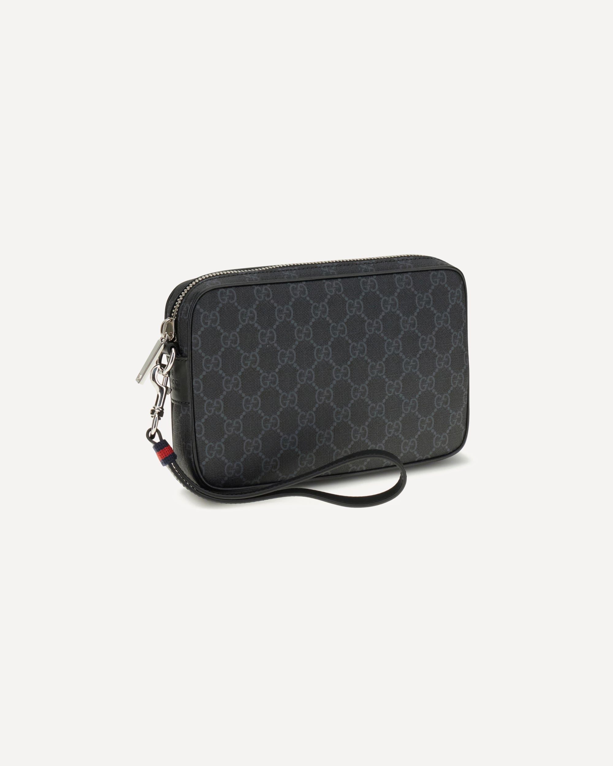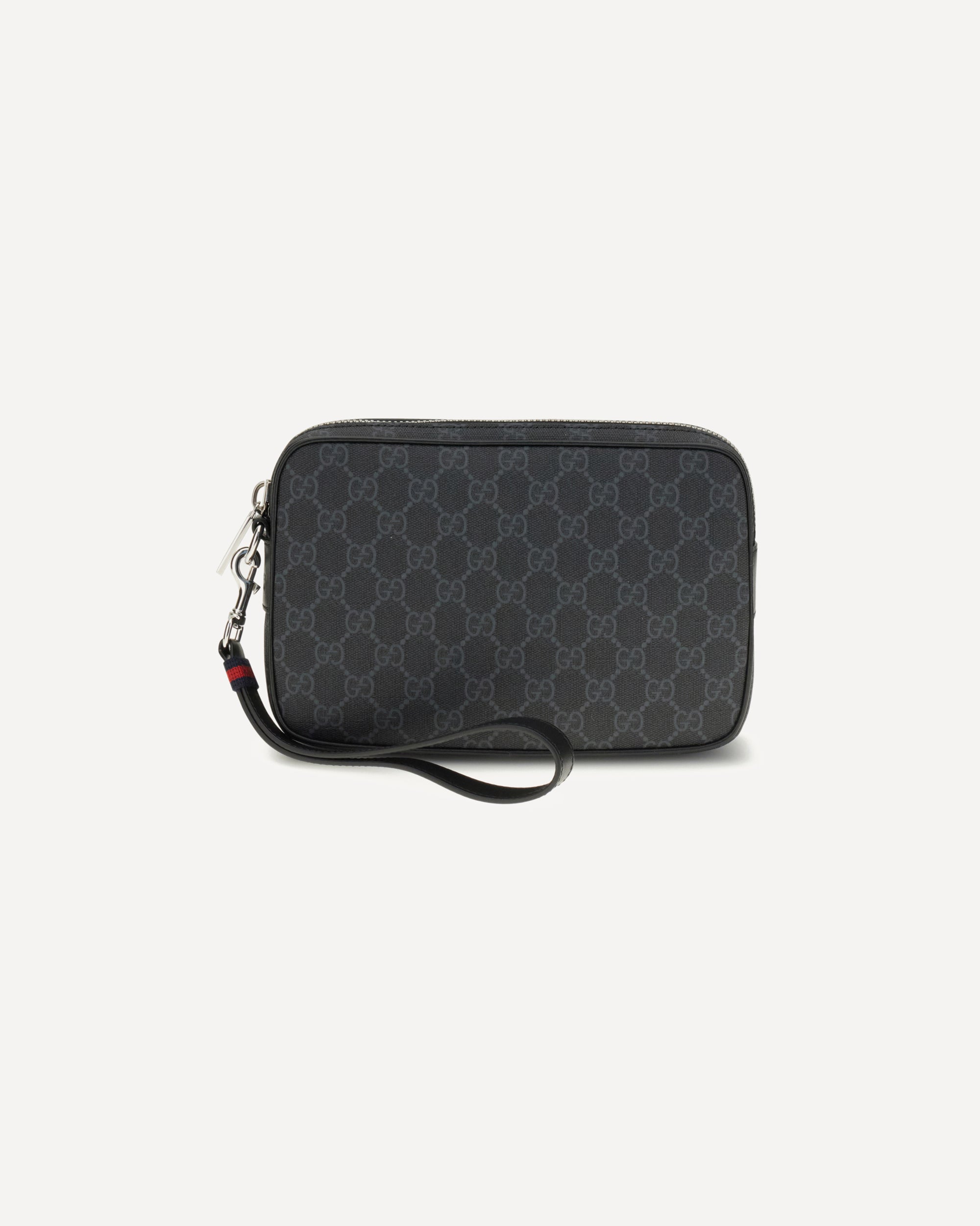 Gucci's small GG Pouch is crafted by durable yet elegant black GG Supreme canvas with tone-on-tone leather trim. The classic blue and red Web stripe adds a distinctive touch to the brand's aesthetic. The cotton and linen lining ensures practicality, while the detachable wrist strap and zip closure make this a functional and versatile piece, perfect for any occasion.