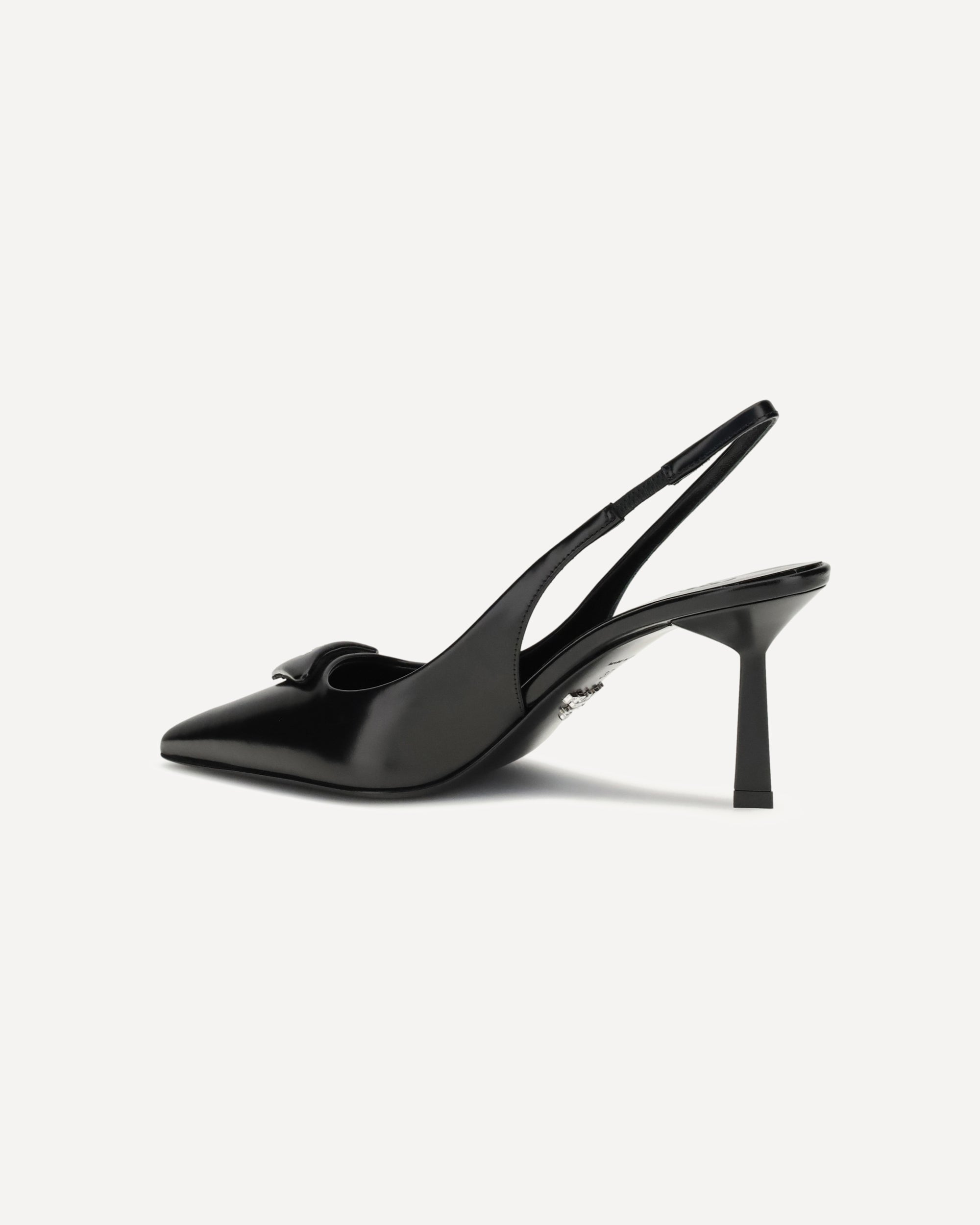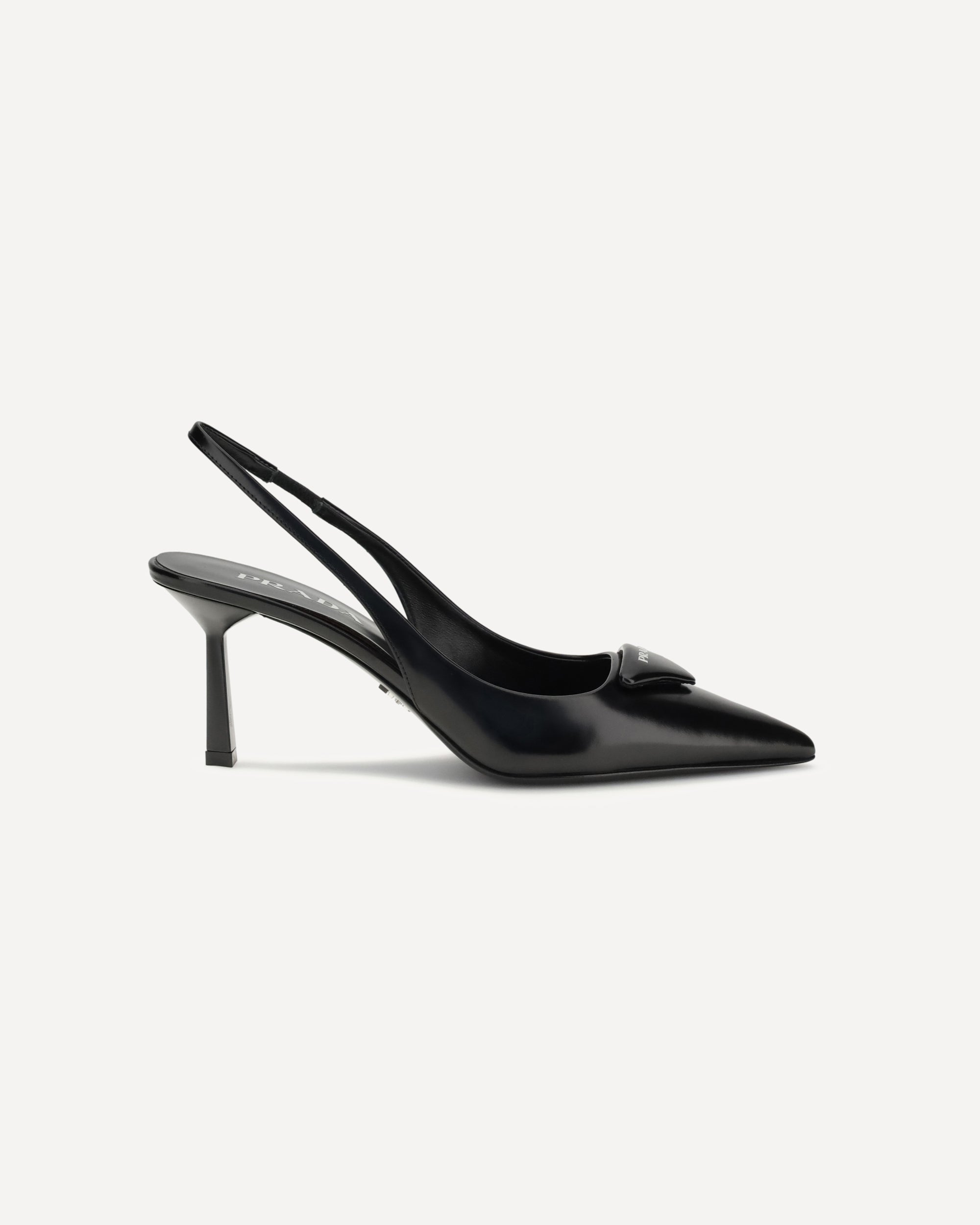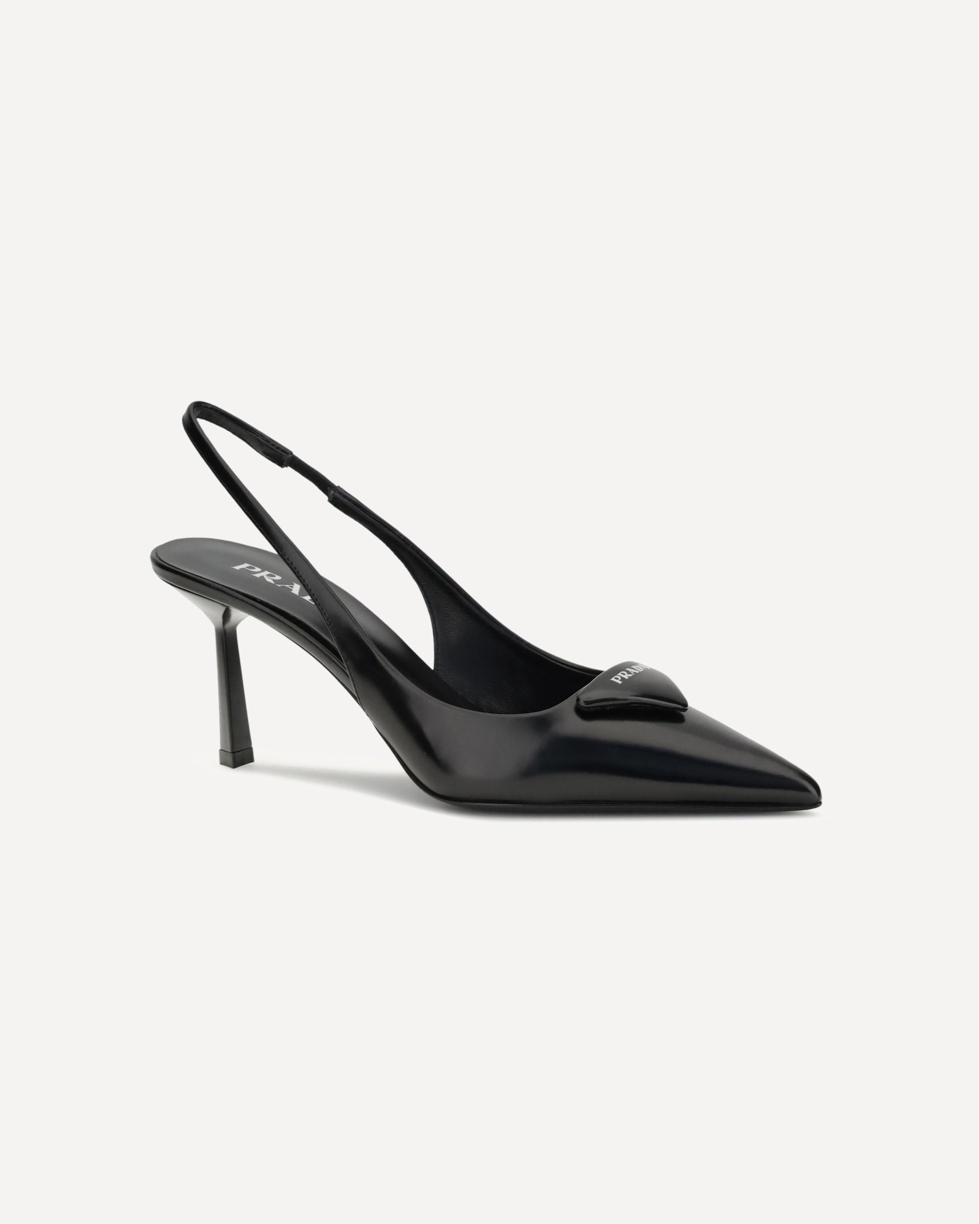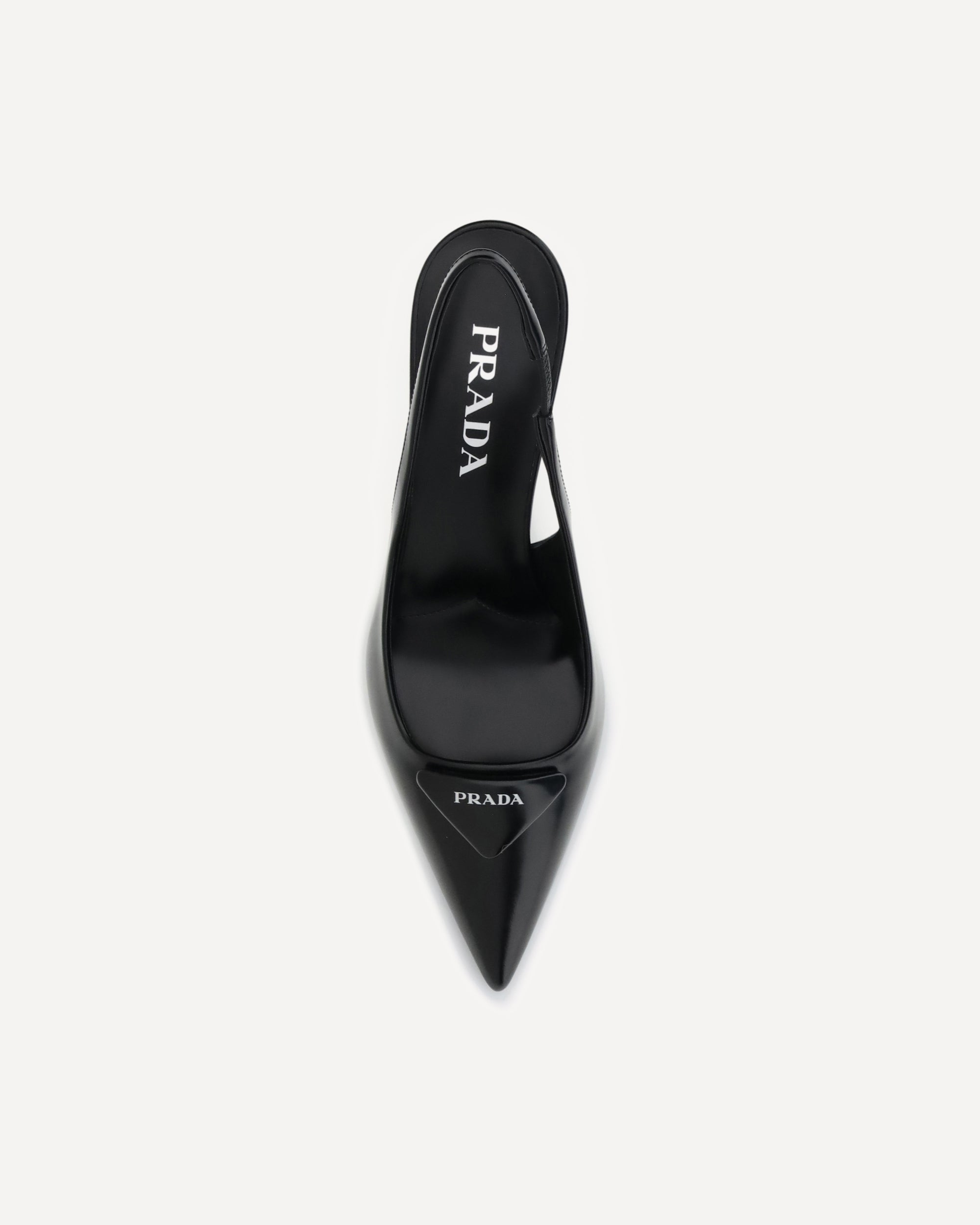 The leather slingback Pumps by Prada express contemporary elegance with clean lines and iconic details. Made of smooth leather, they are embellished with the classic tonal leather triangle logo on the front. The pointed toe model is enhanced by a distinctively designed heel, while the elastic ankle strap ensures a comfortable and stable fit. The logoed label on the inside discreetly completes the maison's refined aesthetic.