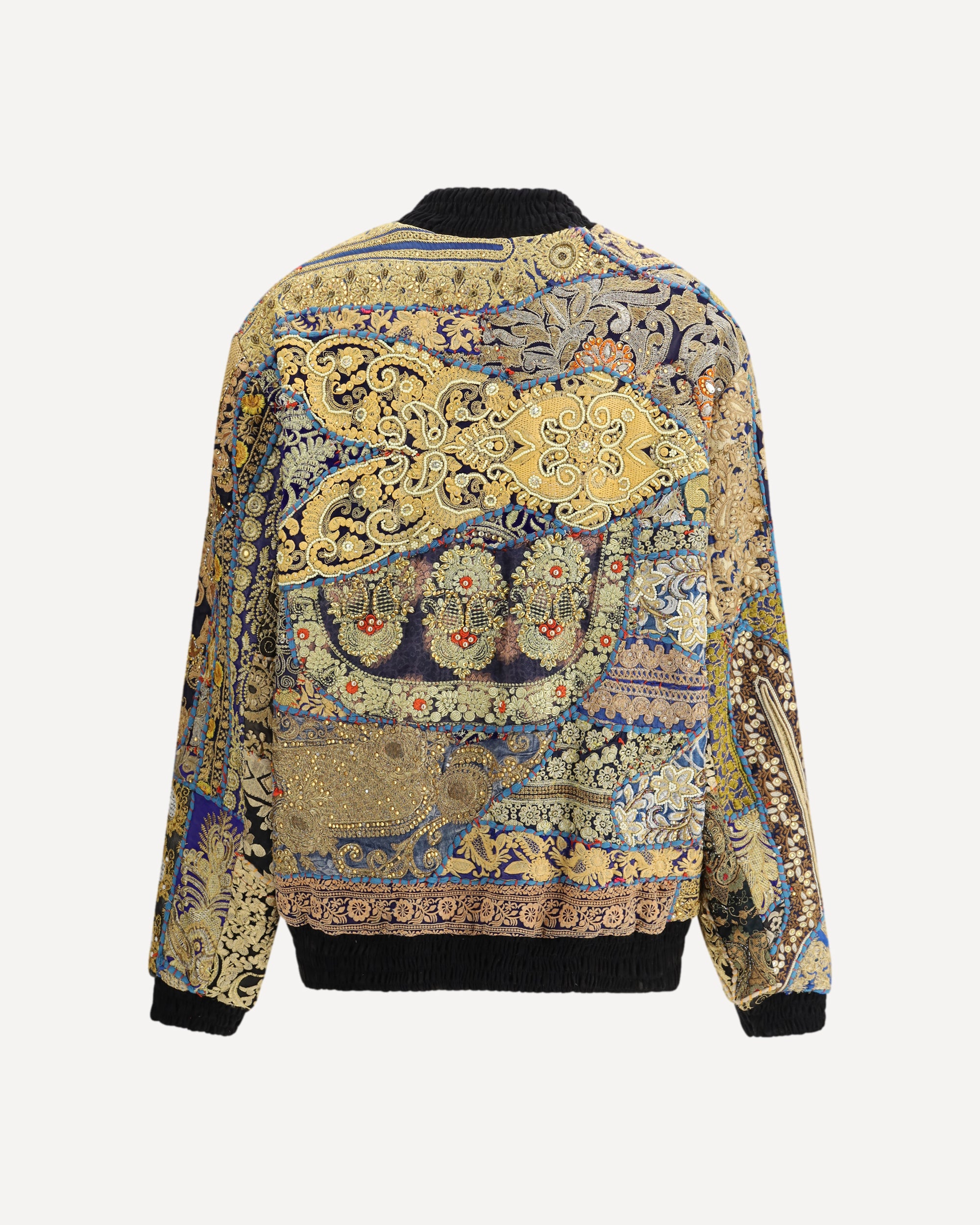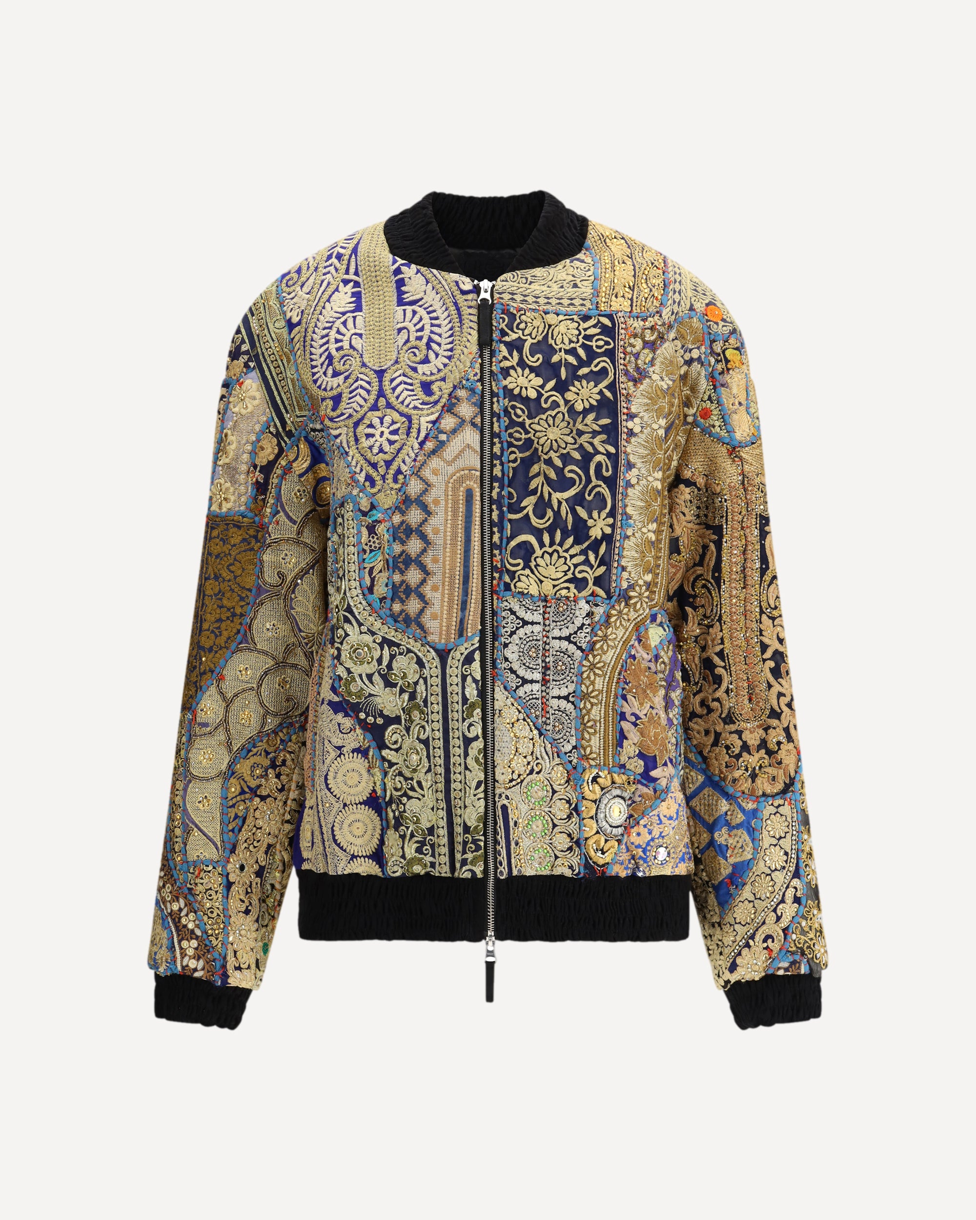 The Rajiv cotton Jacket by Ella showcases artisanal elegance through a patchwork design enriched with multicoloured embroidered inserts. The double-slider zip fastening and side welt pockets combine functionality with refined aesthetics, while the elasticated cuffs and hem ensure a comfortable regular fit. A distinctive piece that blends textile tradition with a contemporary spirit.