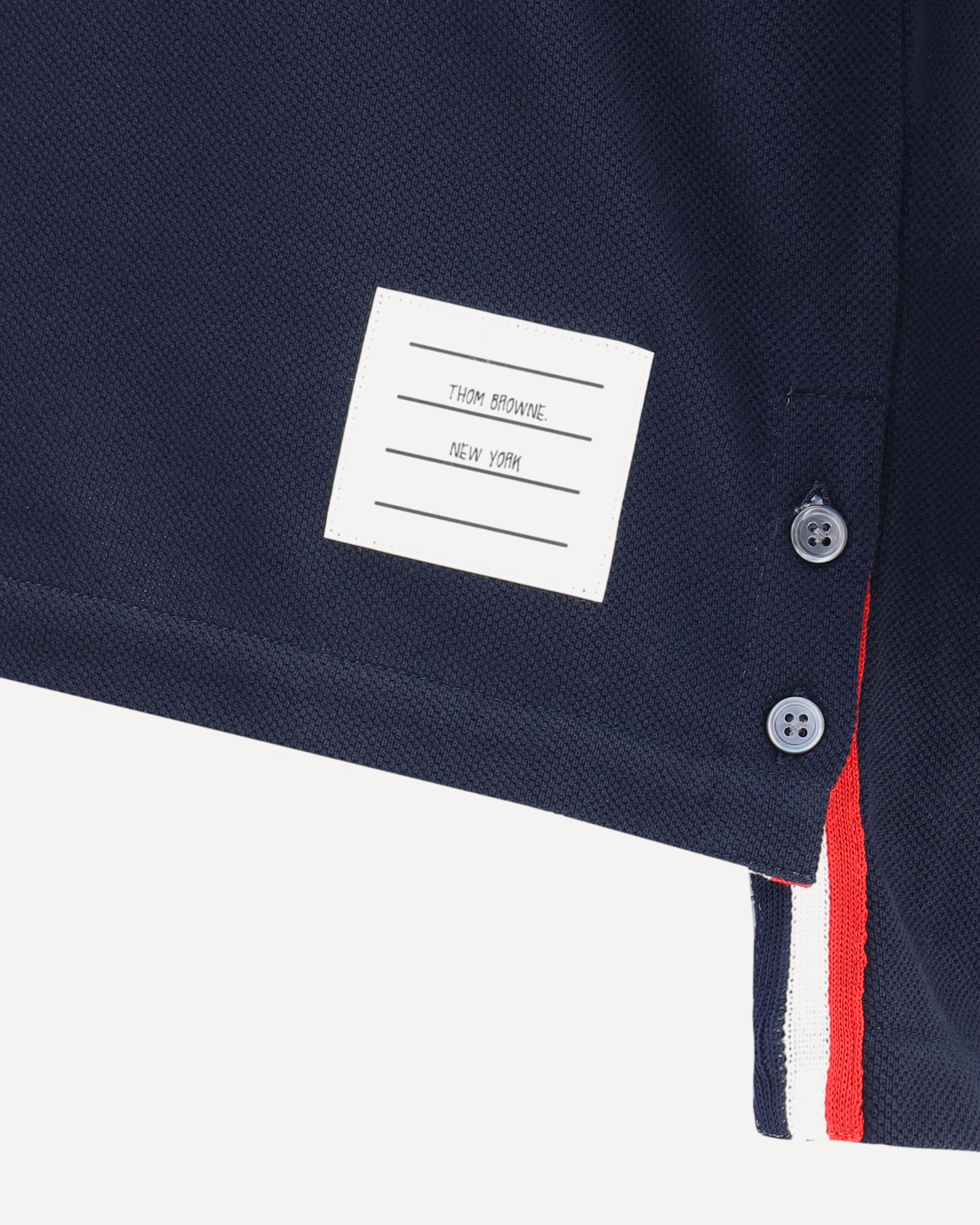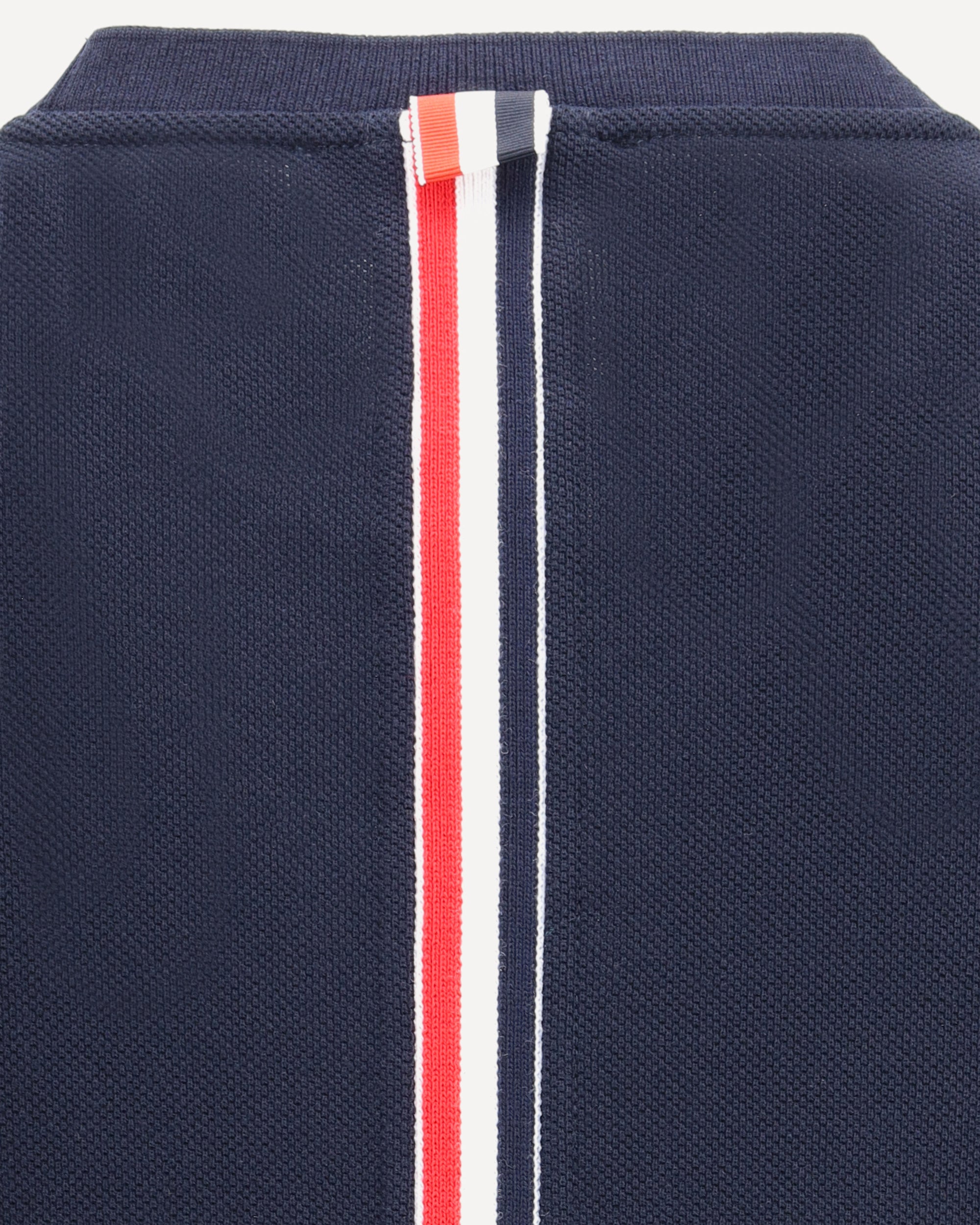 T-Shirt by Thom Browne made from cotton, with a ribbed crew neck for extra comfort. The model features an applied logo patch on the front and adjustable side slits with buttons, enhanced by the detail of the iconic colored bands. On the back panel stand out the characteristic colored vertical bands in the center, a distinctive symbol of the brand. A casual and contemporary garment, perfect for adding a unique touch of style to your wardrobe.