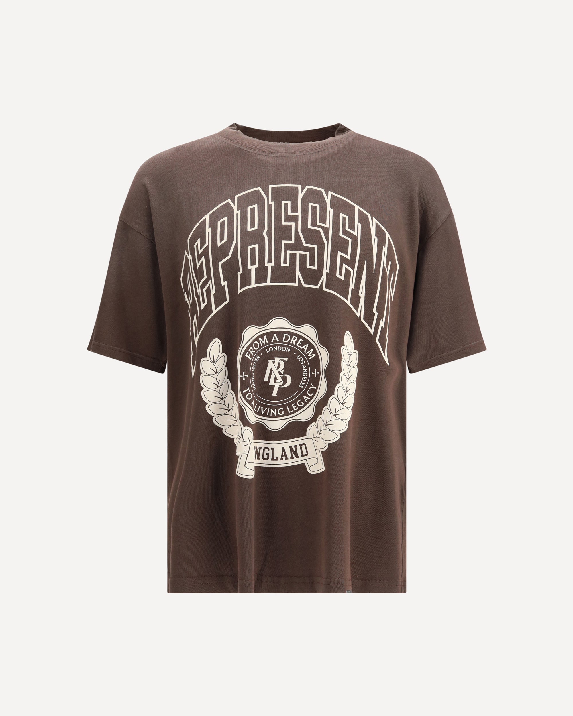 The Legacy Crest T-shirt by Represent is a short-sleeved design crafted from soft cotton, featuring a bold crest motif and a collegiate-style print that evoke a sporty, confident aesthetic. The England lettering on the front completes the look with an iconic, contemporary edge.