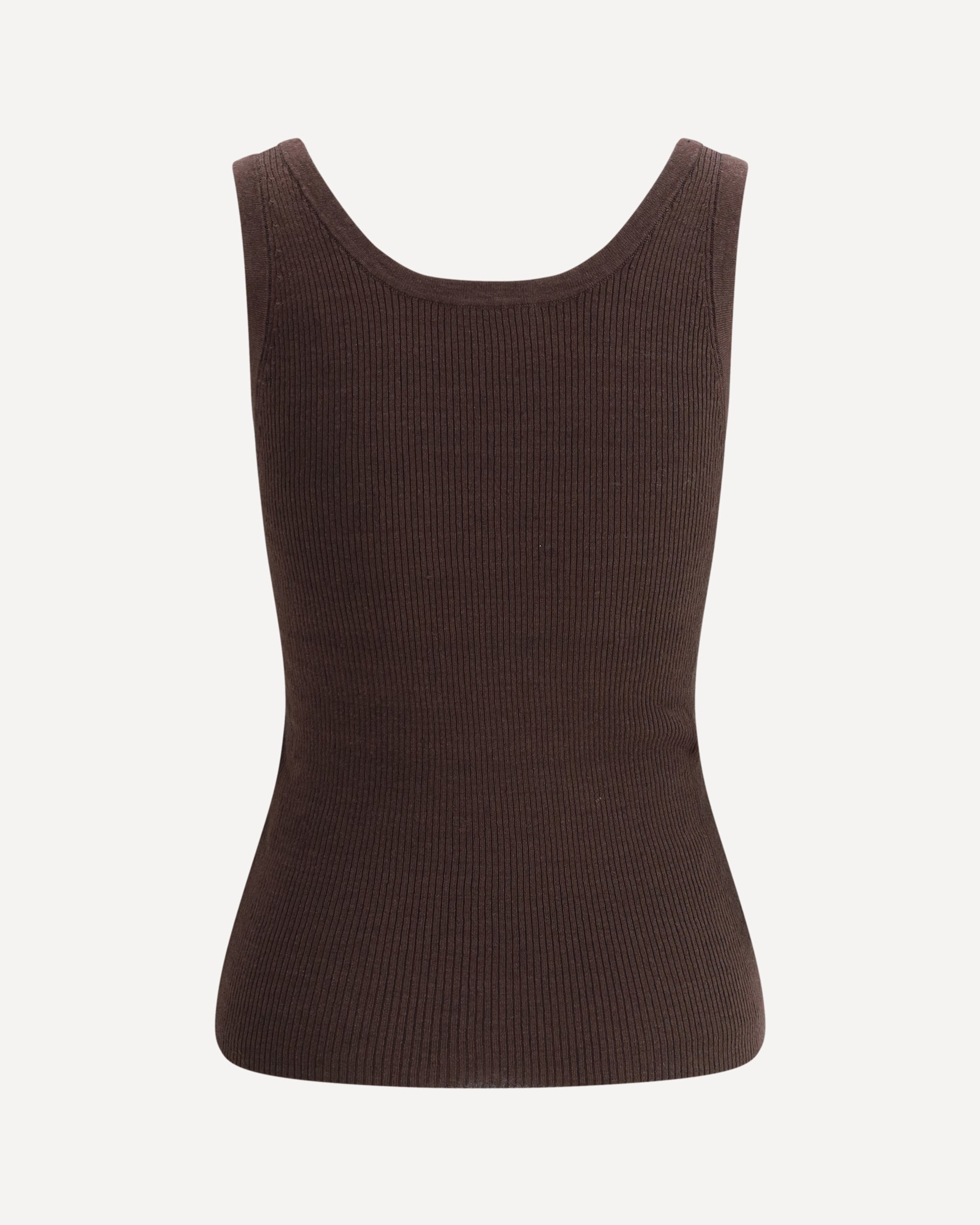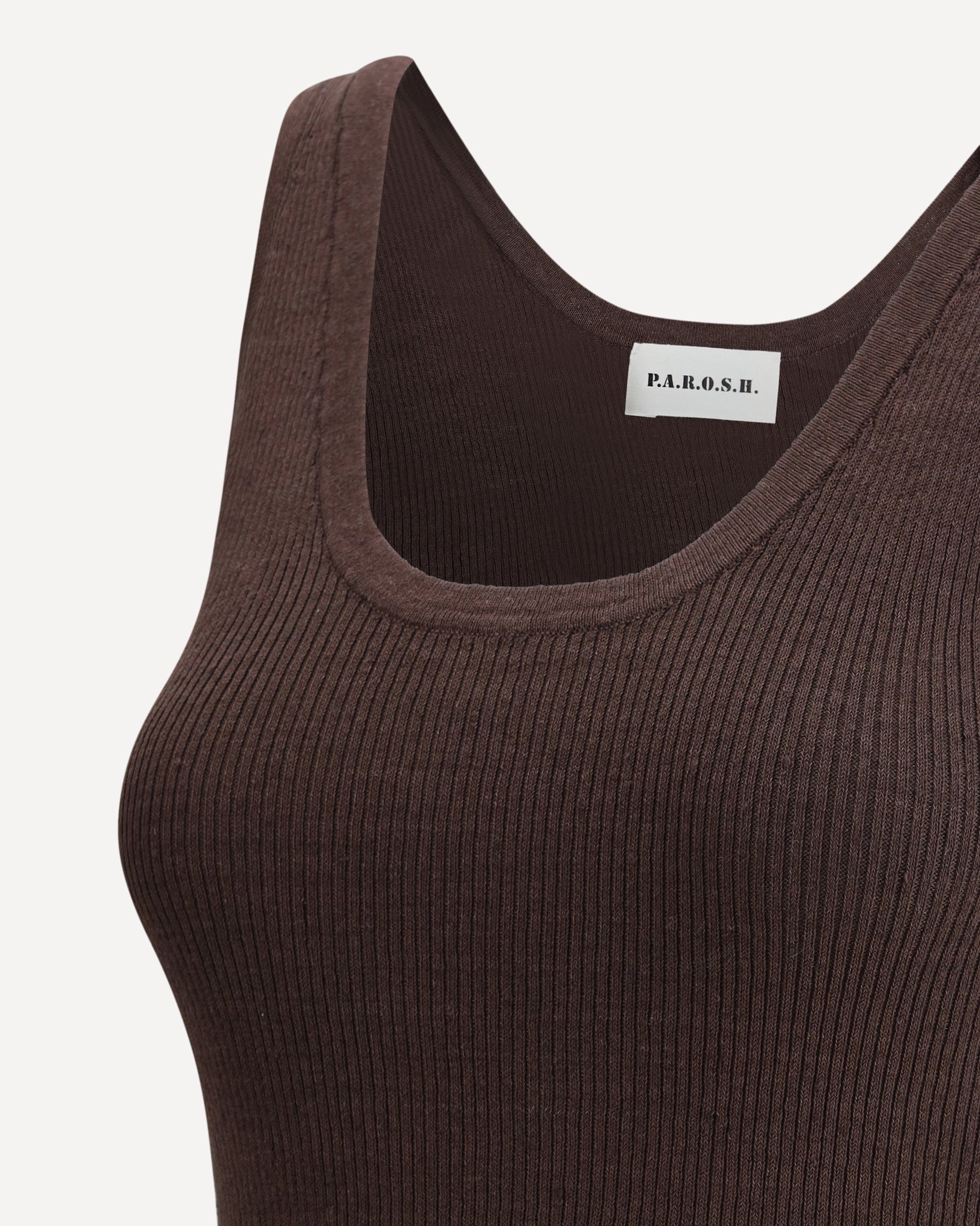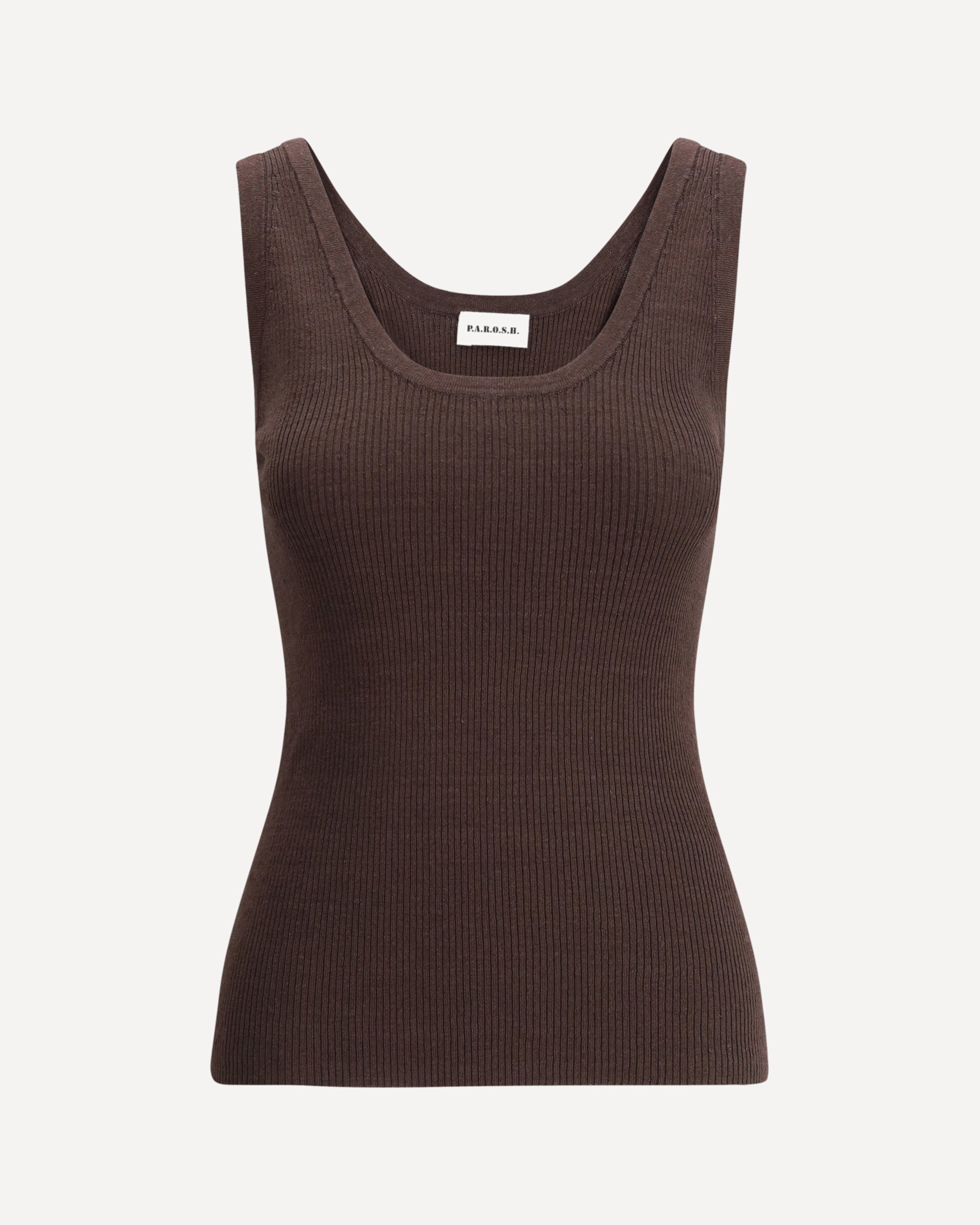 The Ribbed Tank Top by P.A.R.O.S.H. is a simple yet elegant garment, perfect for a casual yet stylish look. The sleeveless design with thick straps offers comfort and an optimal fit, while the round neckline lends a delicate touch. The ribbed design adds texture to the garment, making it versatile and suitable for pairing with both casual pants and more elegant skirts.