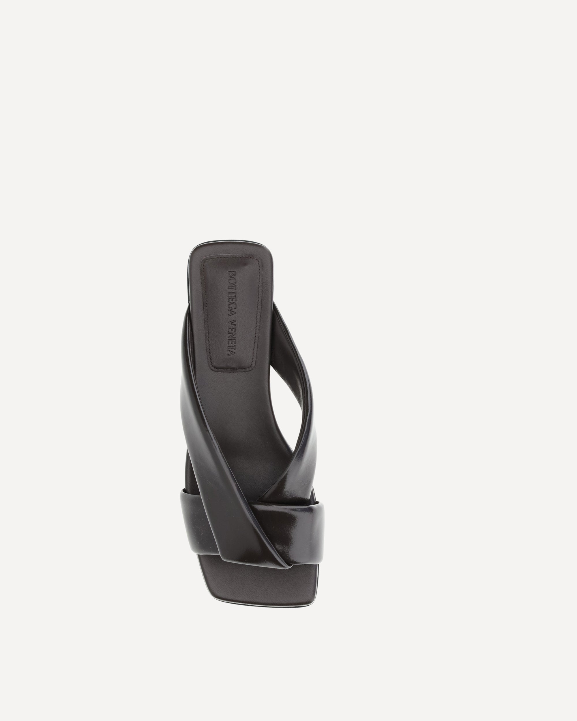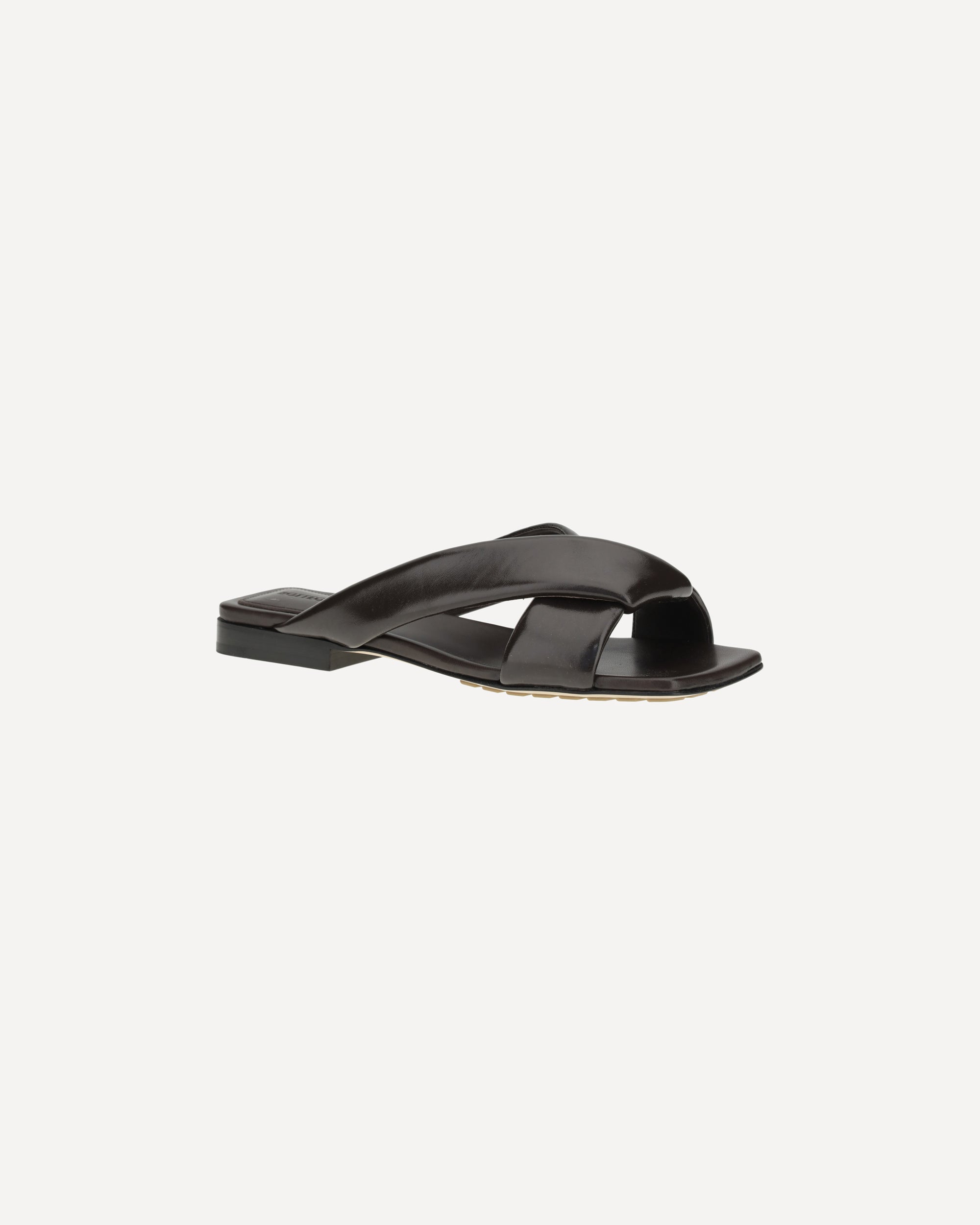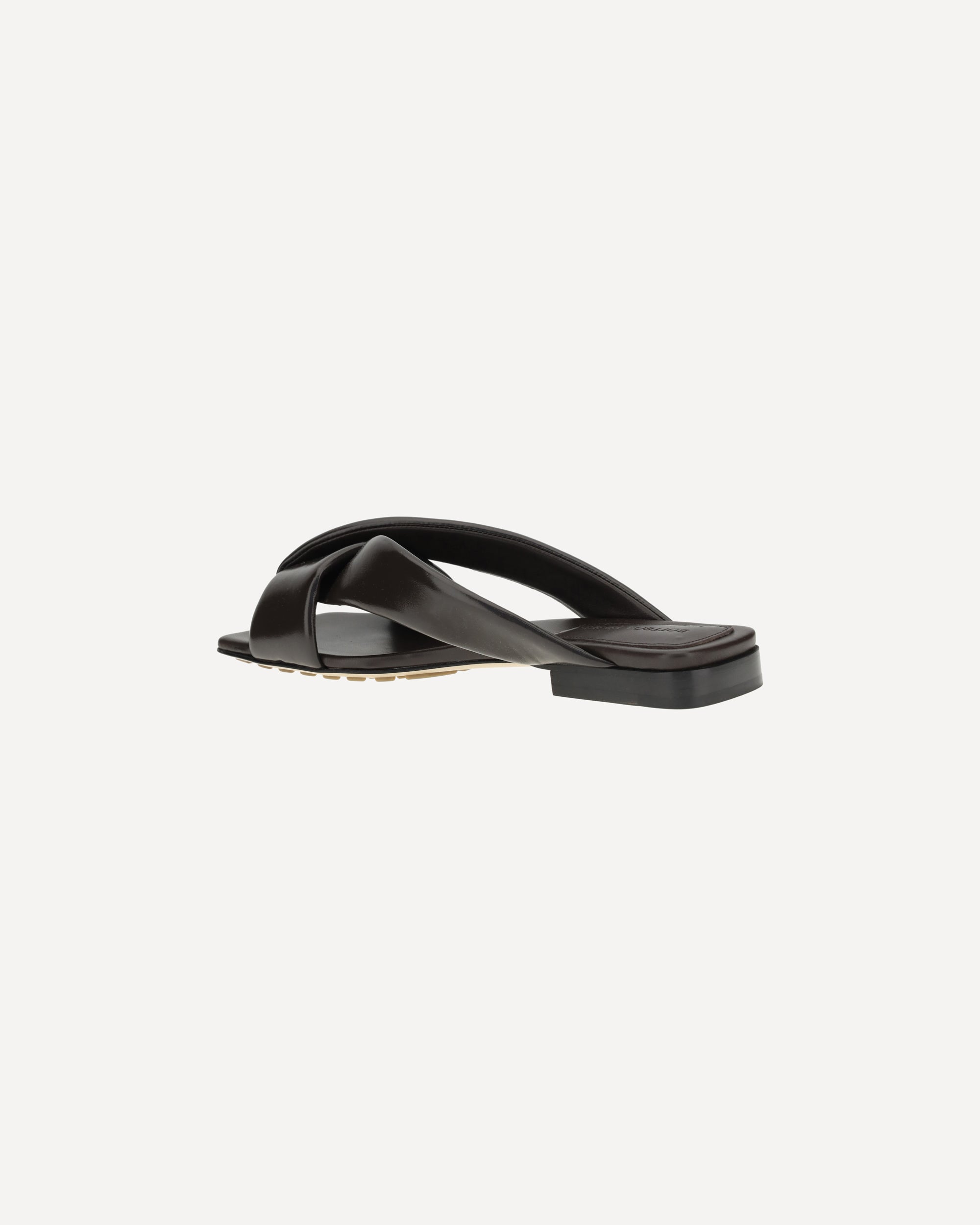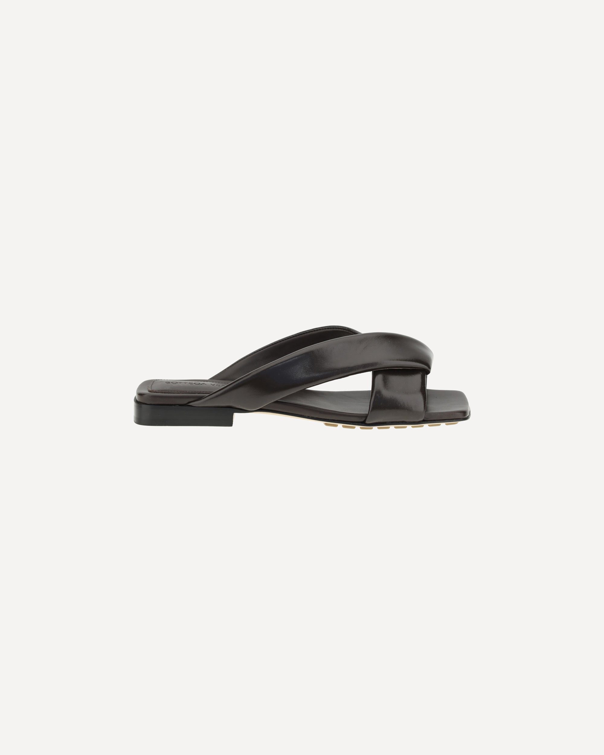Bottega Veneta's Riva Sandals are made of supple leather with a squared toe and a padded tubular strap that offers comfort. The flat sole ensures stability, while the logoed insole with the brand's intrecciato pattern adds a distinctive touch of luxury and sophistication. A sleek and modern style, perfect for a contemporary look.