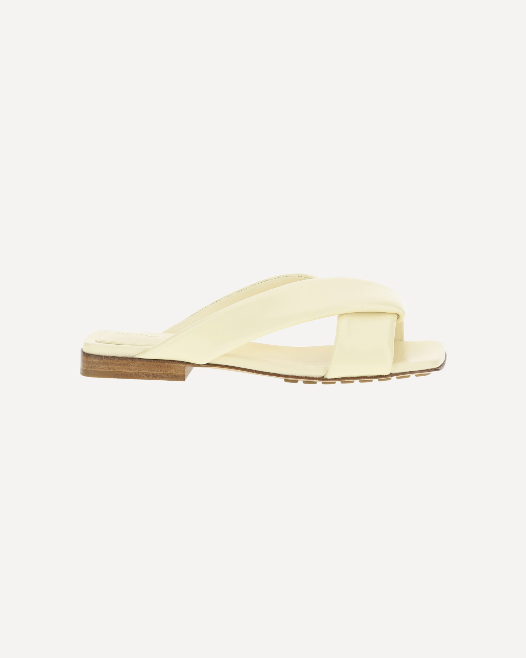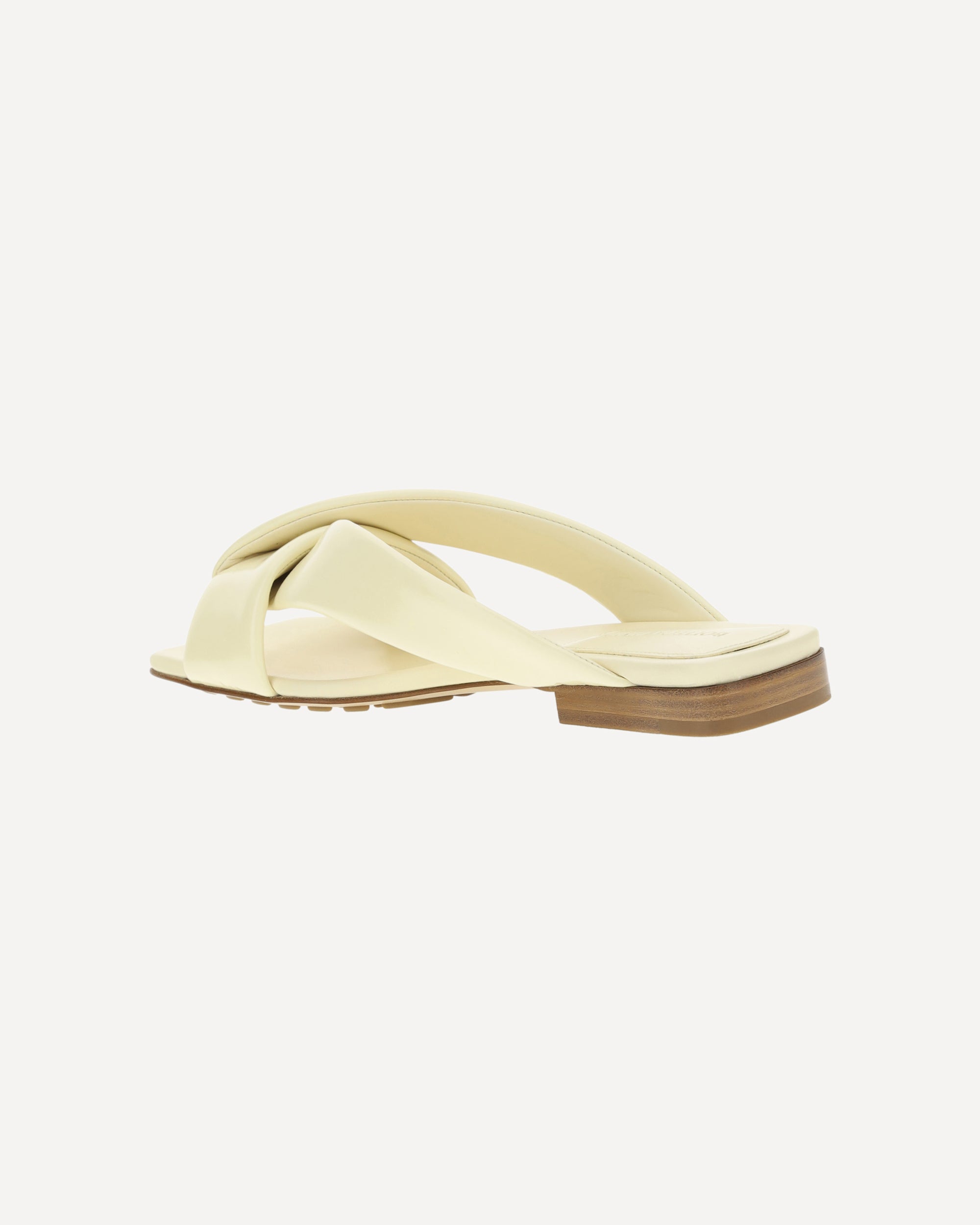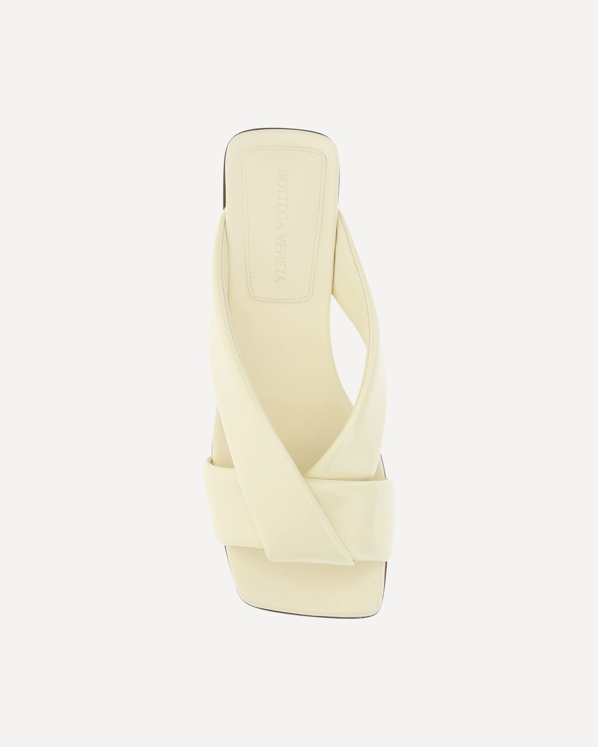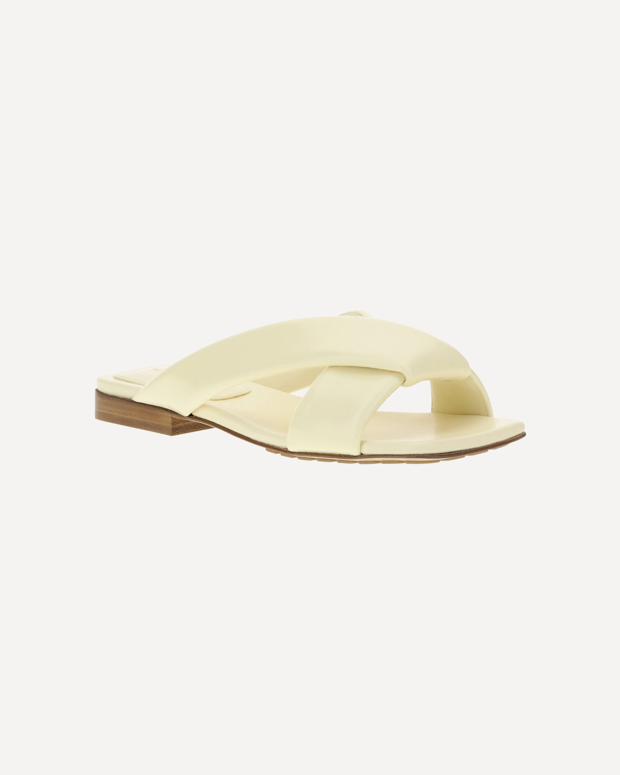 Bottega Veneta's Riva Sandals are made of supple leather with a squared toe and a padded tubular strap that offers comfort. The flat sole ensures stability, while the logoed insole with the brand's intrecciato pattern adds a distinctive touch of luxury and sophistication. A sleek and modern style, perfect for a contemporary look.