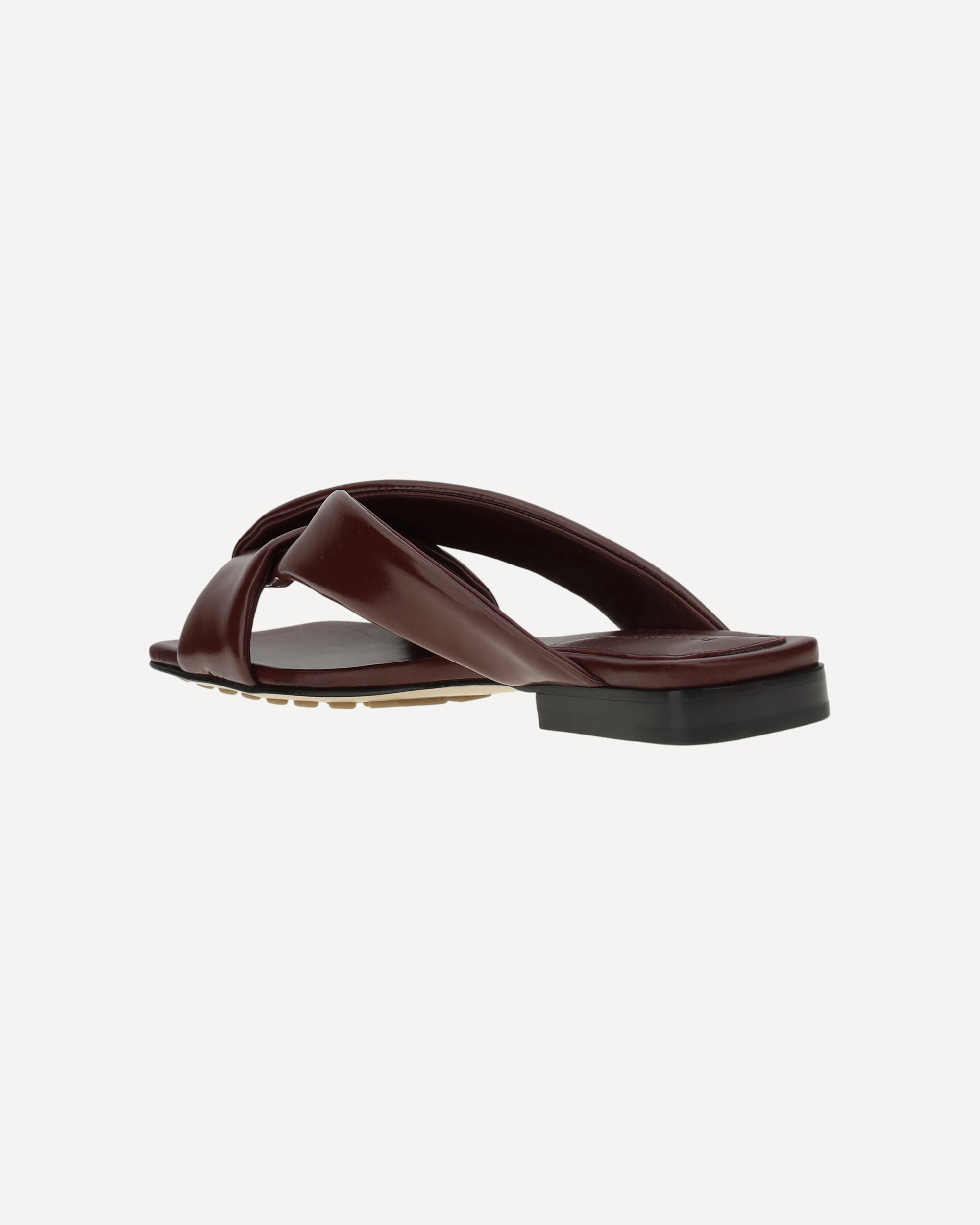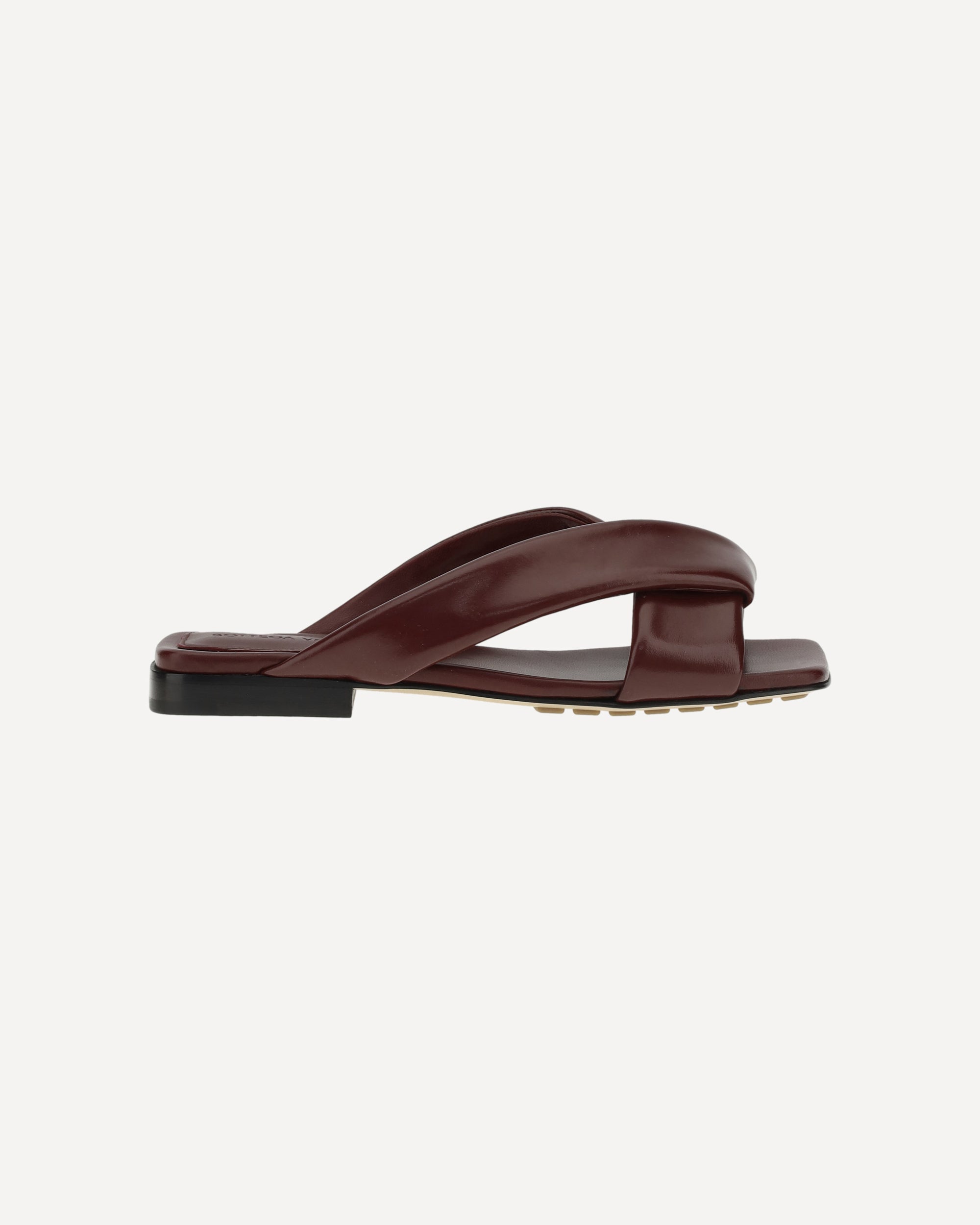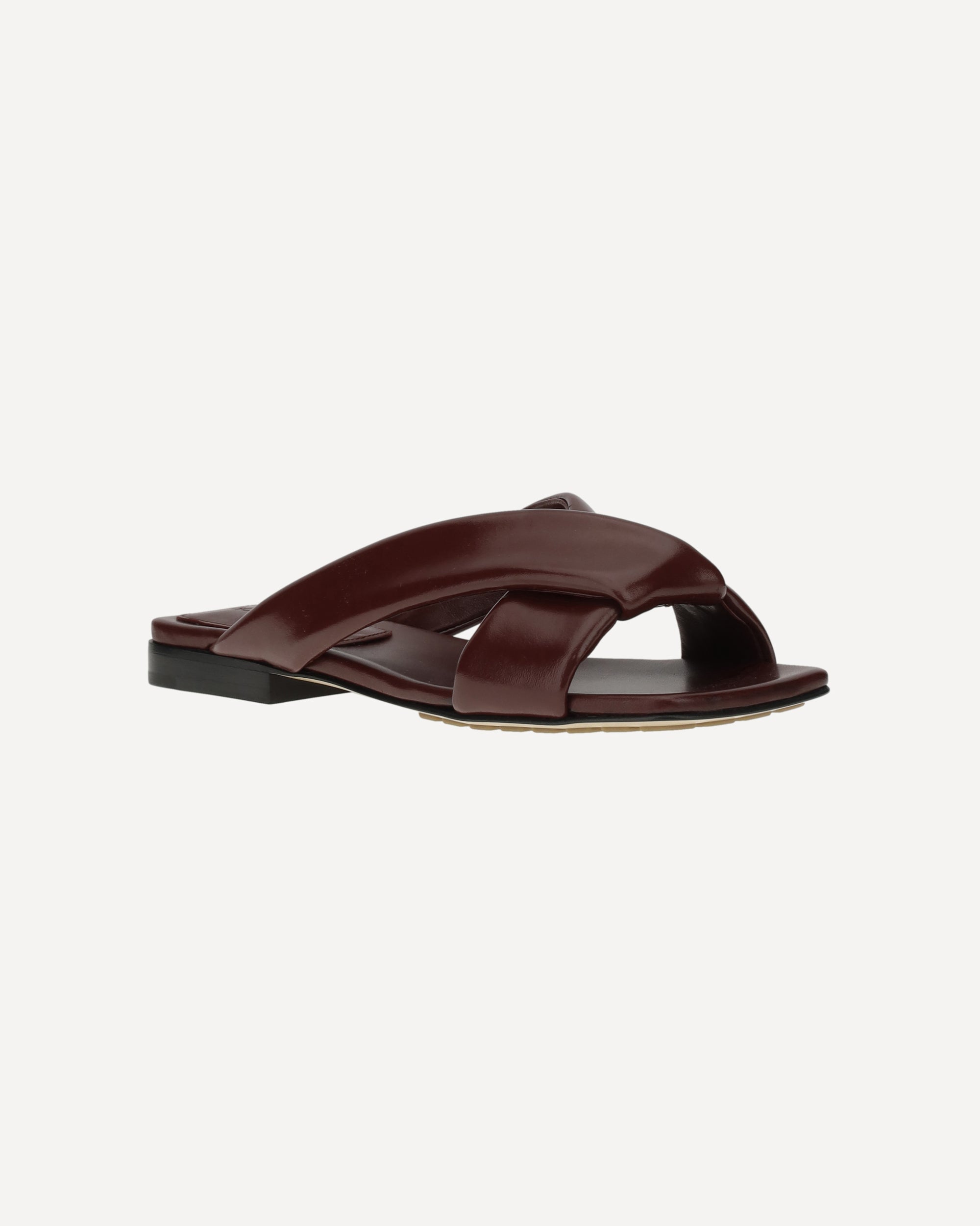 Bottega Veneta's Riva Sandals are made of supple leather with a squared toe and a padded tubular strap that offers comfort. The flat sole ensures stability, while the logoed insole with the brand's intrecciato pattern adds a distinctive touch of luxury and sophistication. A sleek and modern style, perfect for a contemporary look.