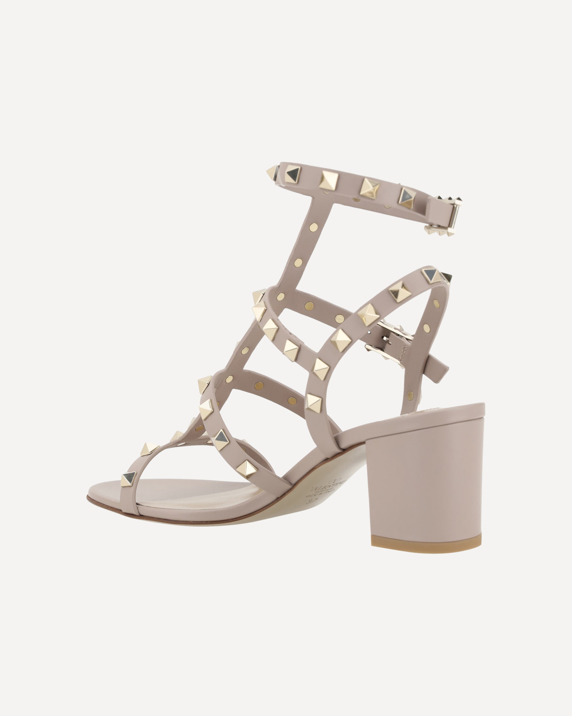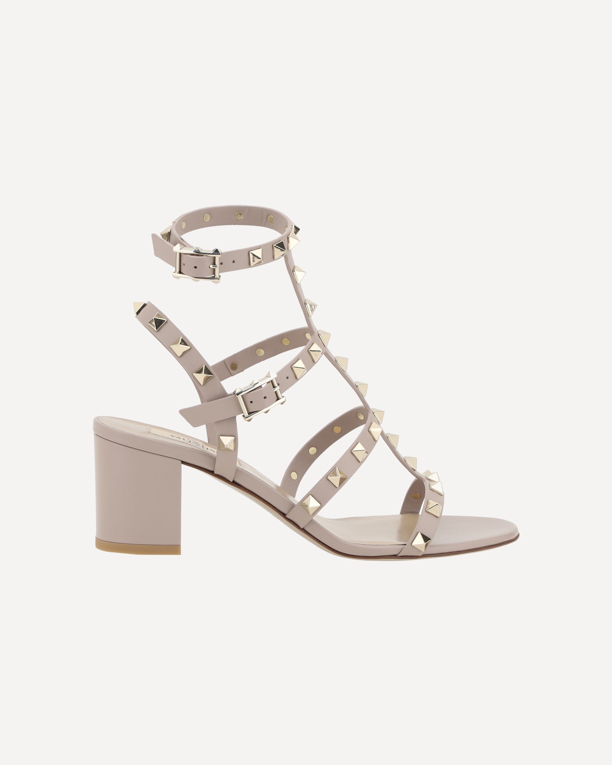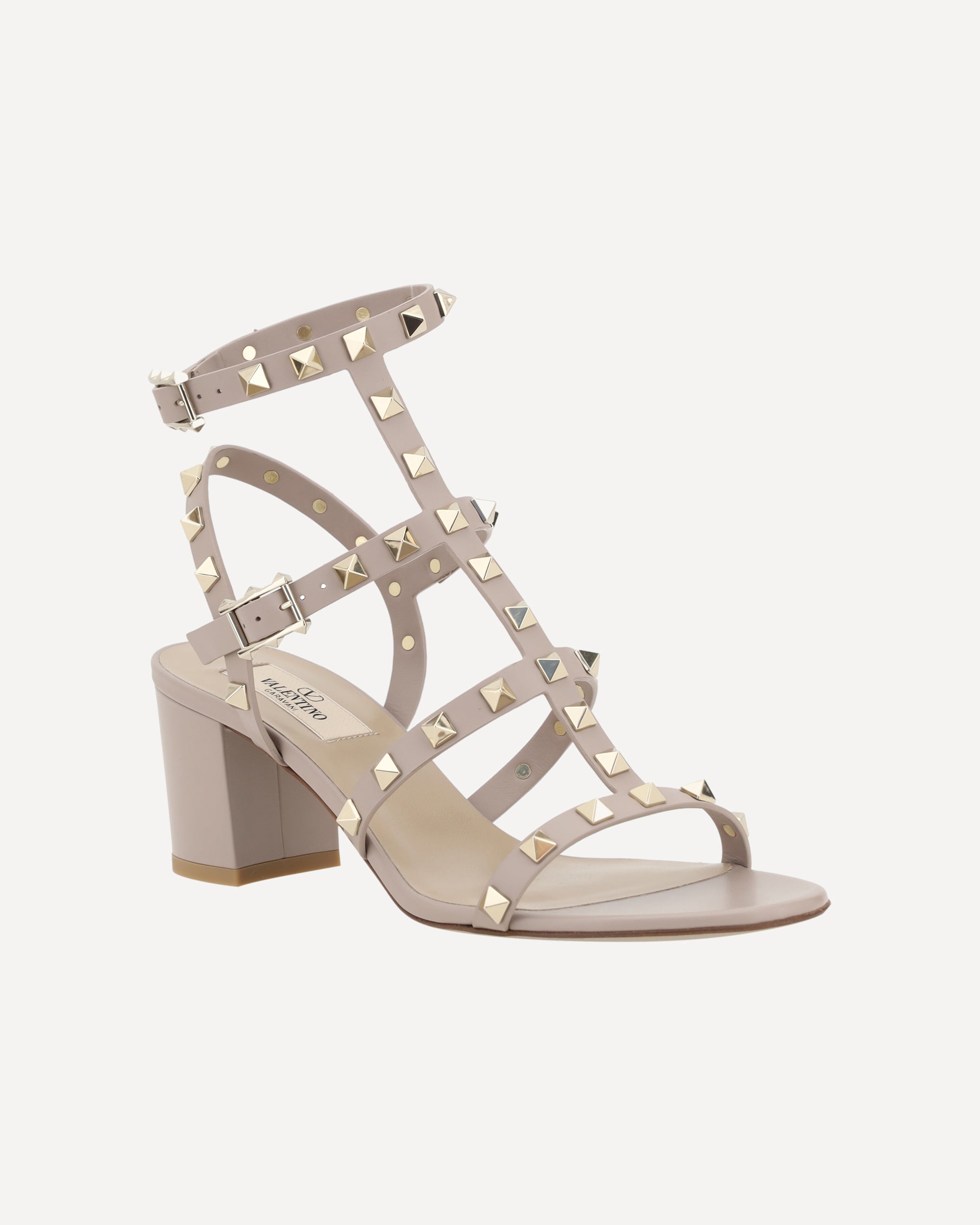 Valentino Garavani's leather Rockstud Sandals are the perfect expression of bold, sophisticated elegance. The round toe and adjustable ankle lap strap closure via a side buckle offer a secure, customized fit. The chunky leather heel lends stability and comfort, while the iconic all-over applied Rockstud studs add a distinctive and gritty touch, making these sandals a true style statement. The branded insole completes the design with a luxurious detail.