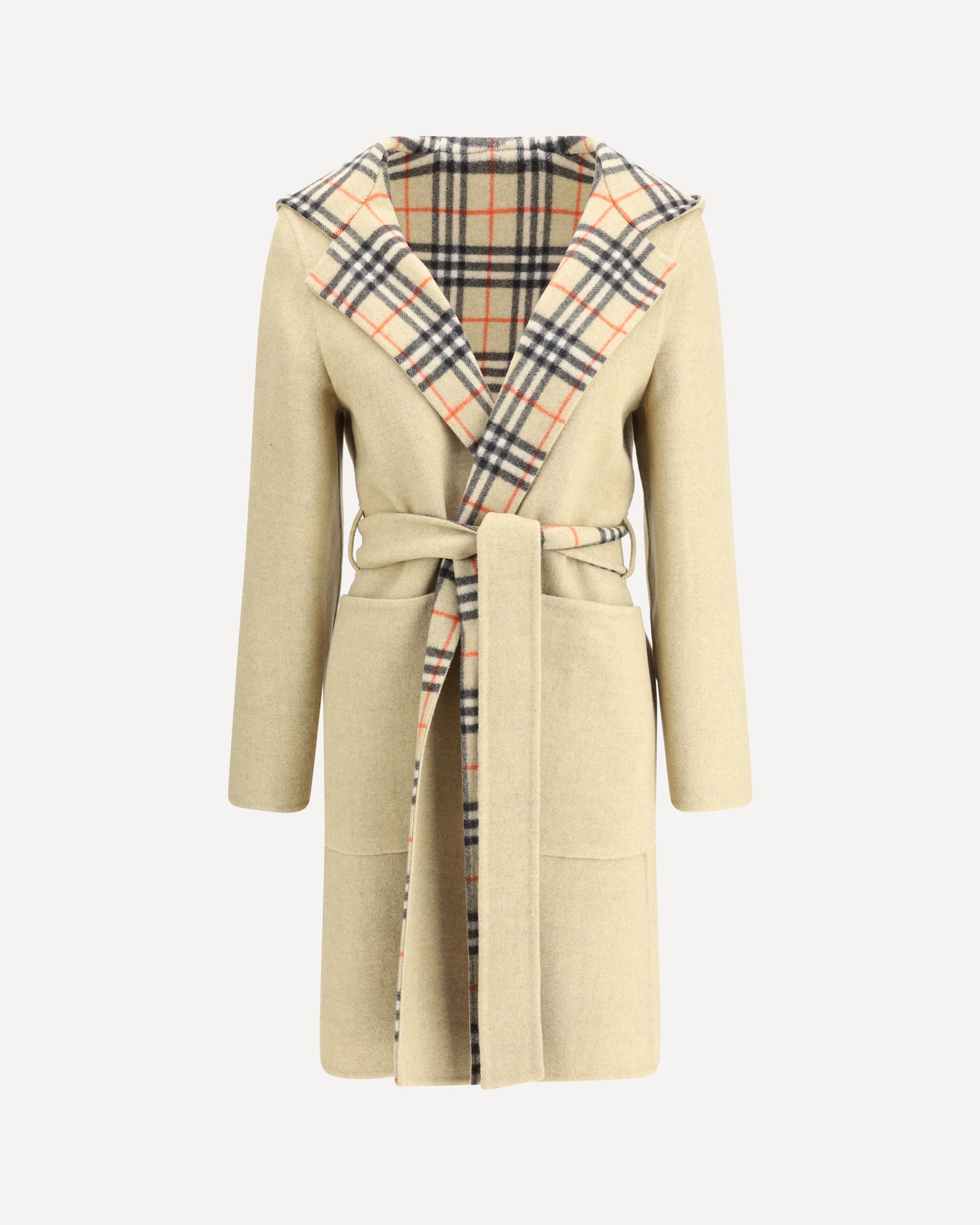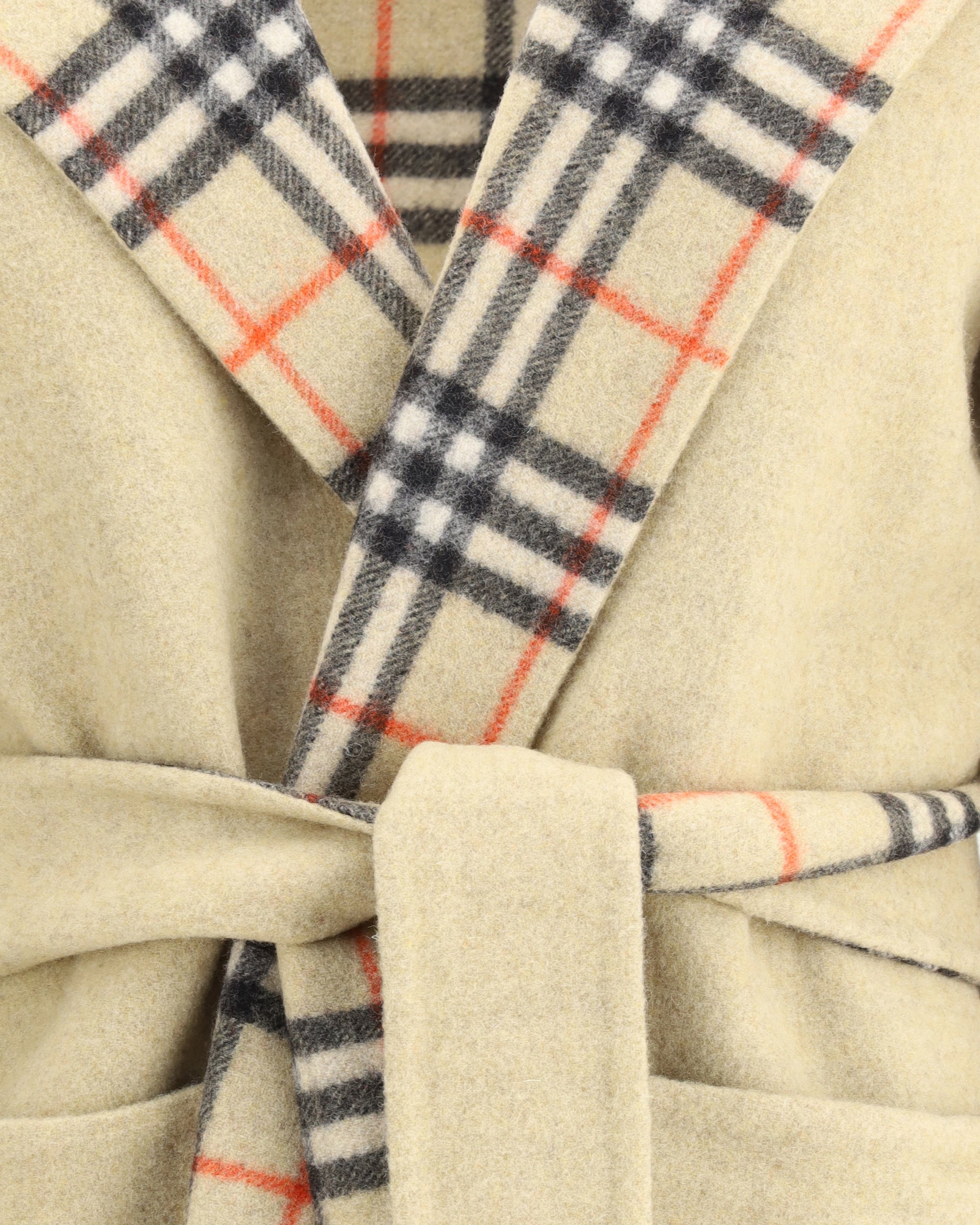 Burberry's reversible wool robe Coat combines style and practicality in one. On one side it features an elegant solid color, while on the other it sports the iconic Burberry Check pattern. Complete with a hood, it offers a comfortable fit and a detachable belt that allows you to define the silhouette to your liking. The wrap-around closure enhances the refined design, while side patch pockets and interior welt pockets provide functionality and comfort.