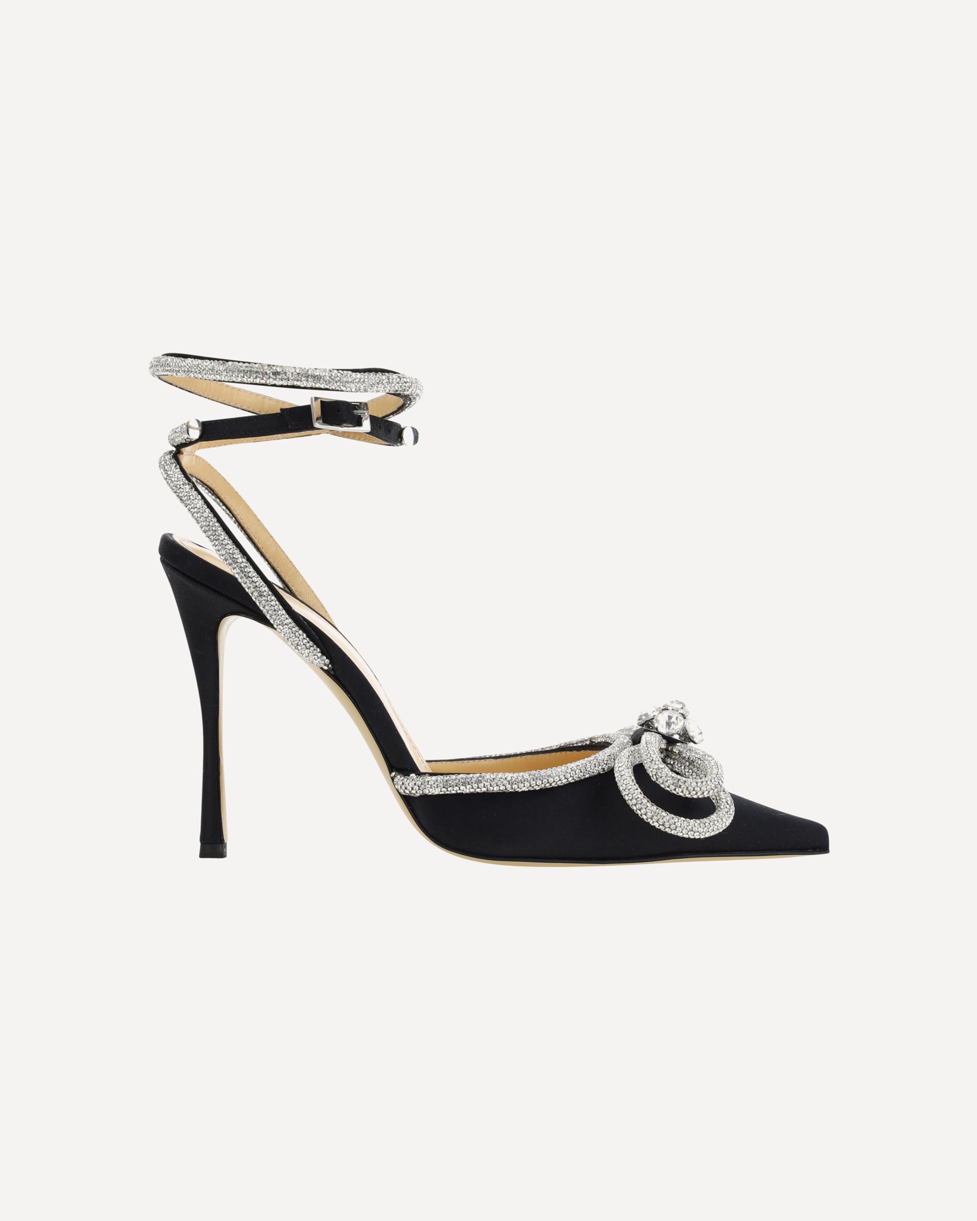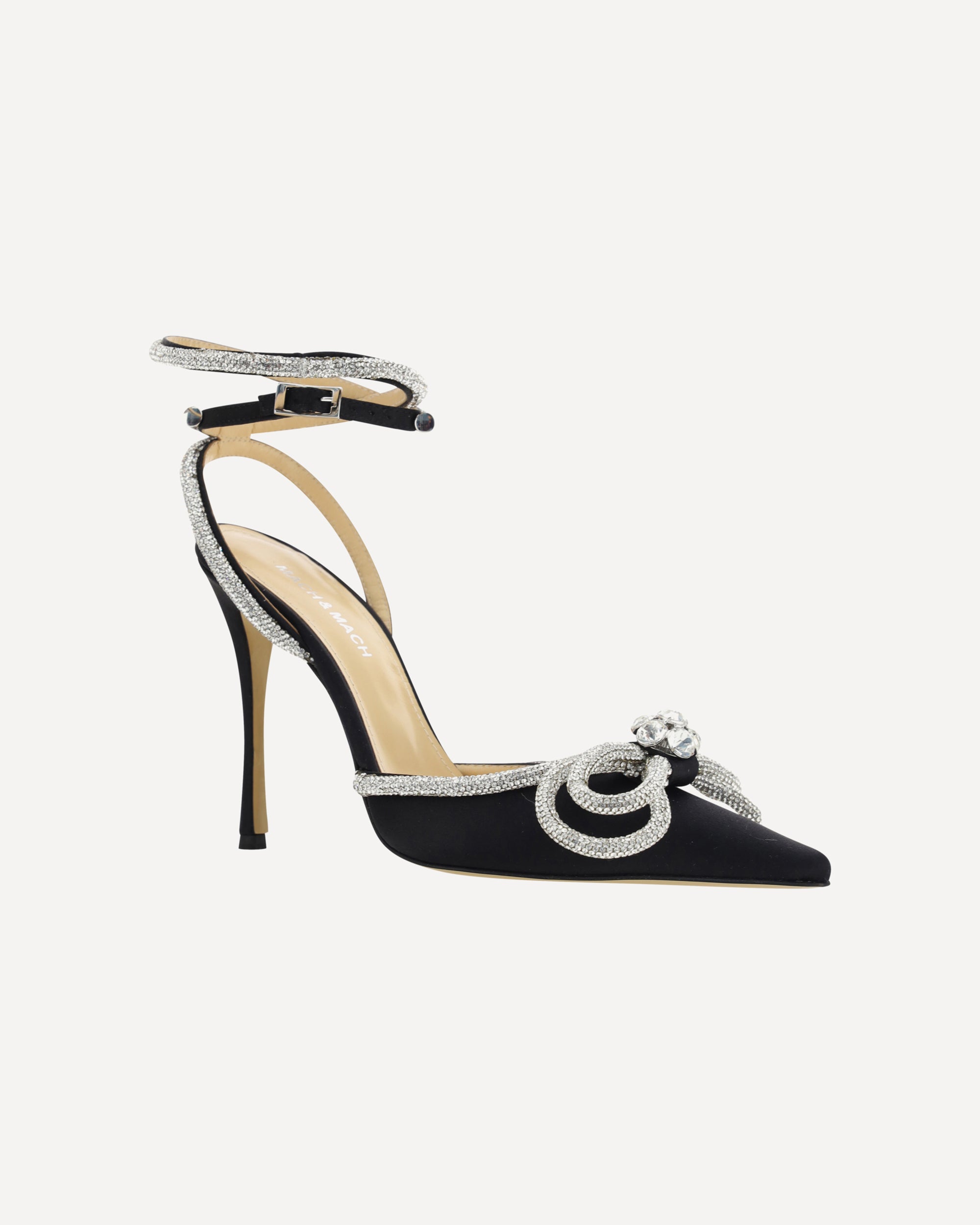 Calfskin Sandals by Mach & Mach, geometric toe, adjustable strap closure by side buckle on ankle lap, satin finish, leather stiletto heel, shiny bow with beaded appliqué jewels on front, beading made of micro crystals, logo-embossed insole.