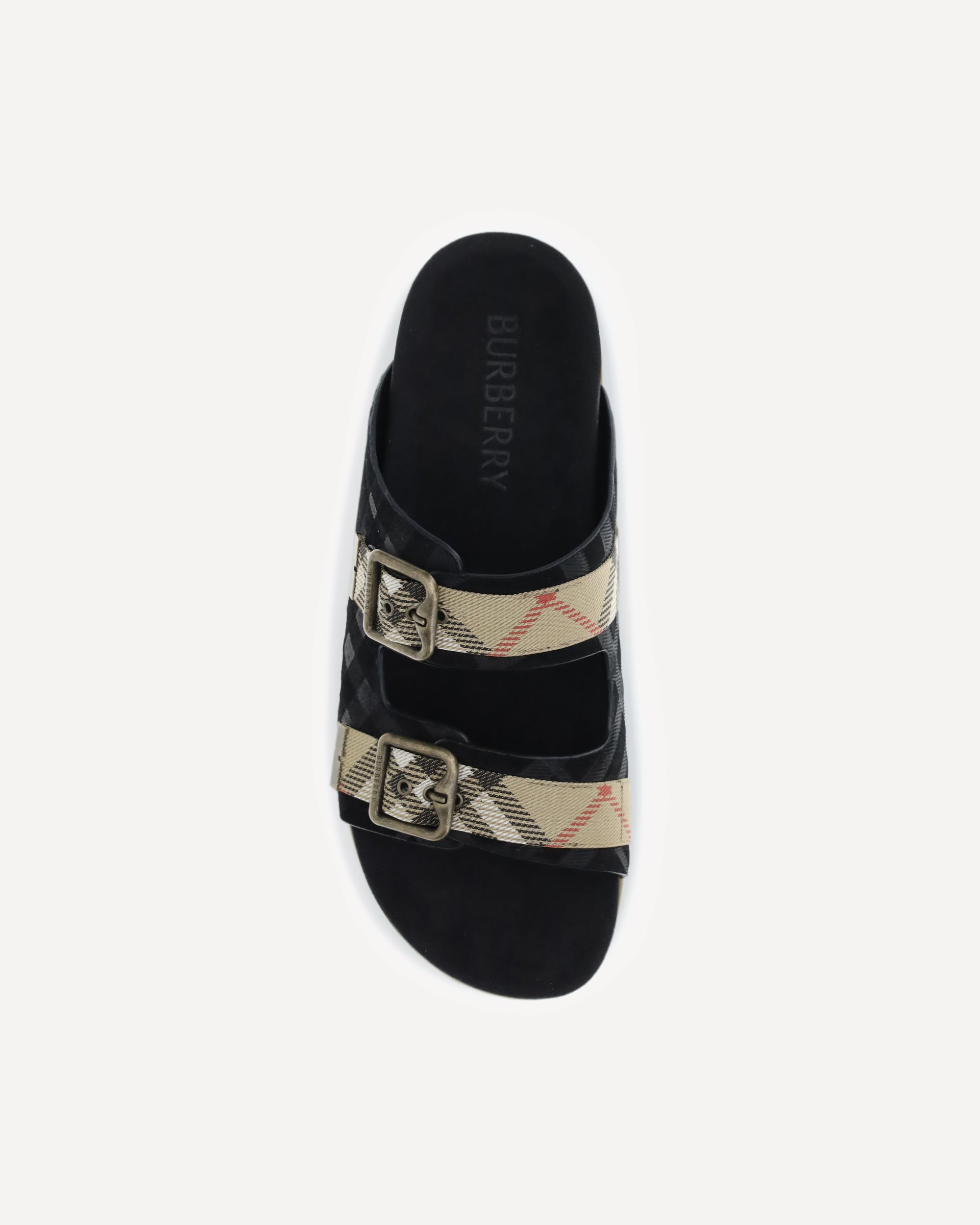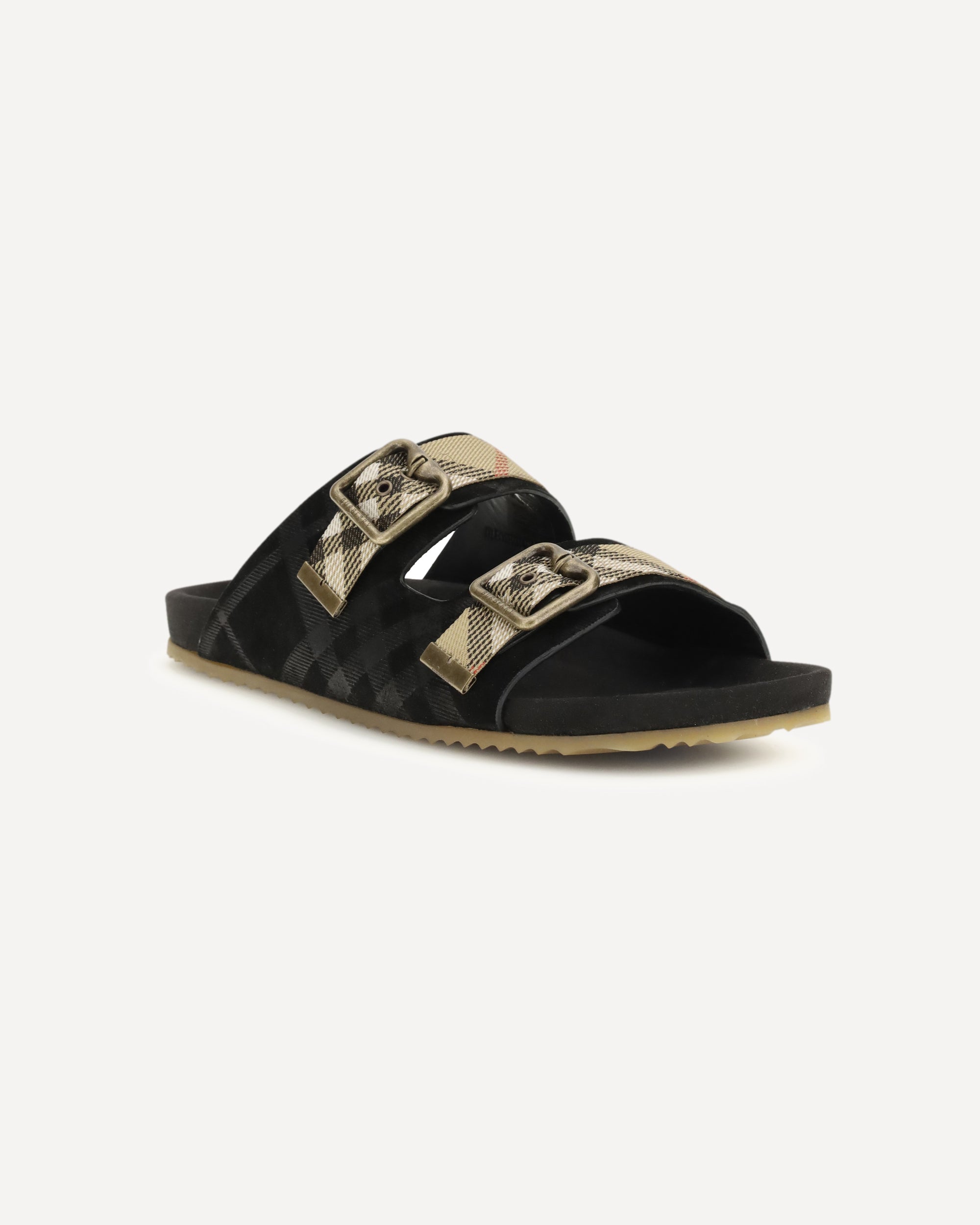 The Urchin Sandals by Burberry are made of soft suede with an embossed Check pattern, an expression of the brand's iconic aesthetic. Featuring a contoured sole with archival Burberry lettering, they feature adjustable straps with B-shaped buckles and Burberry Check jacquard detailing in the unmistakable sand beige.