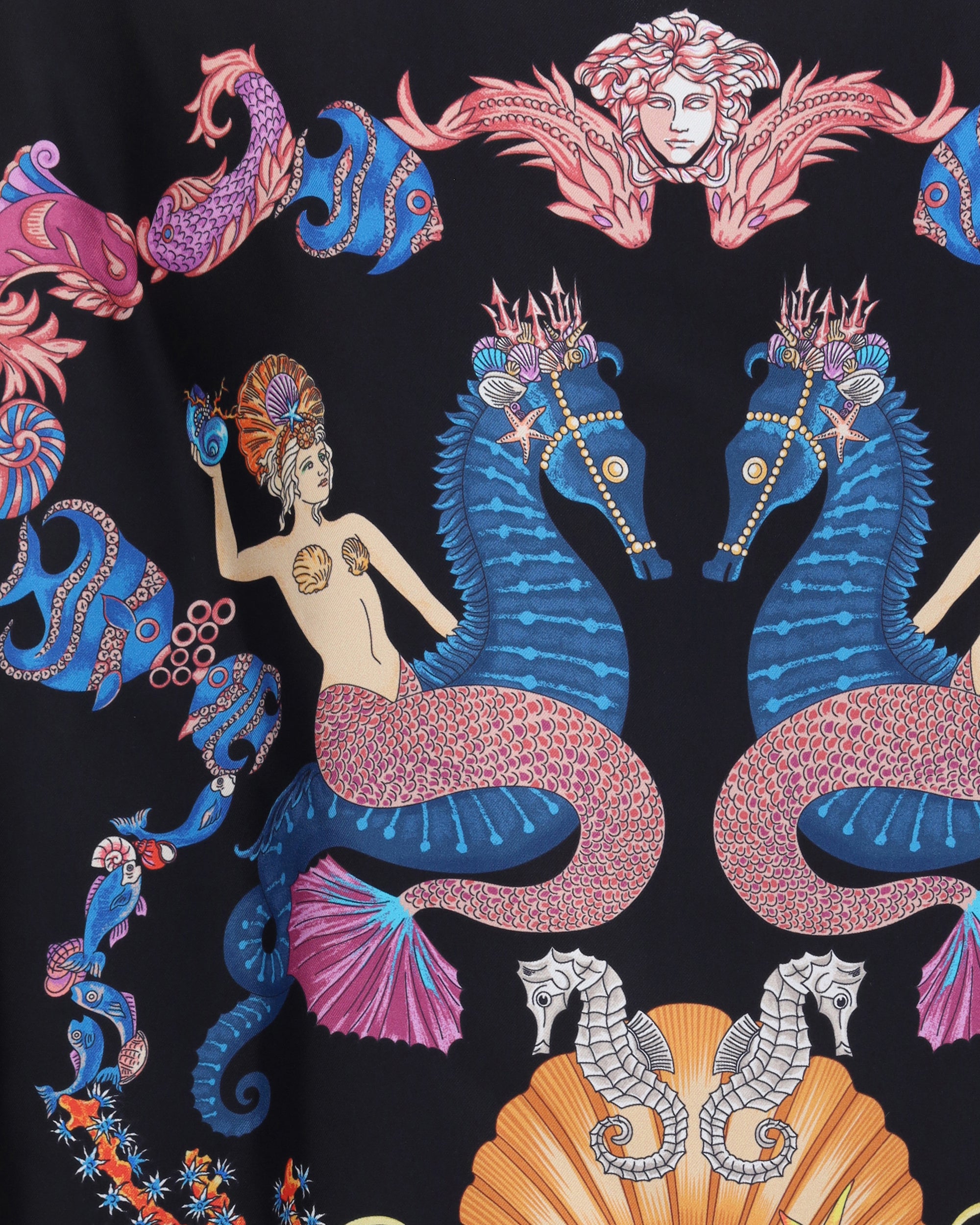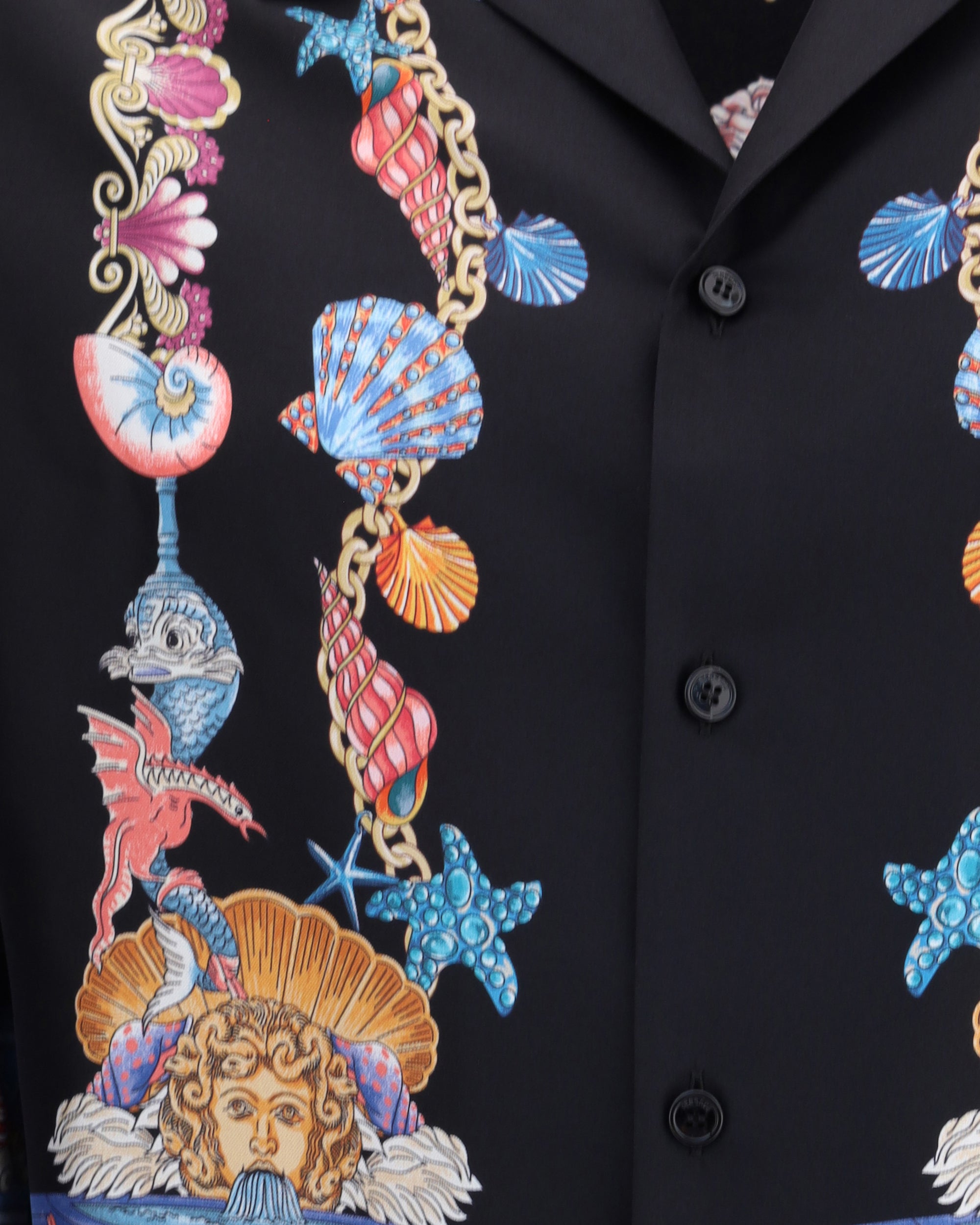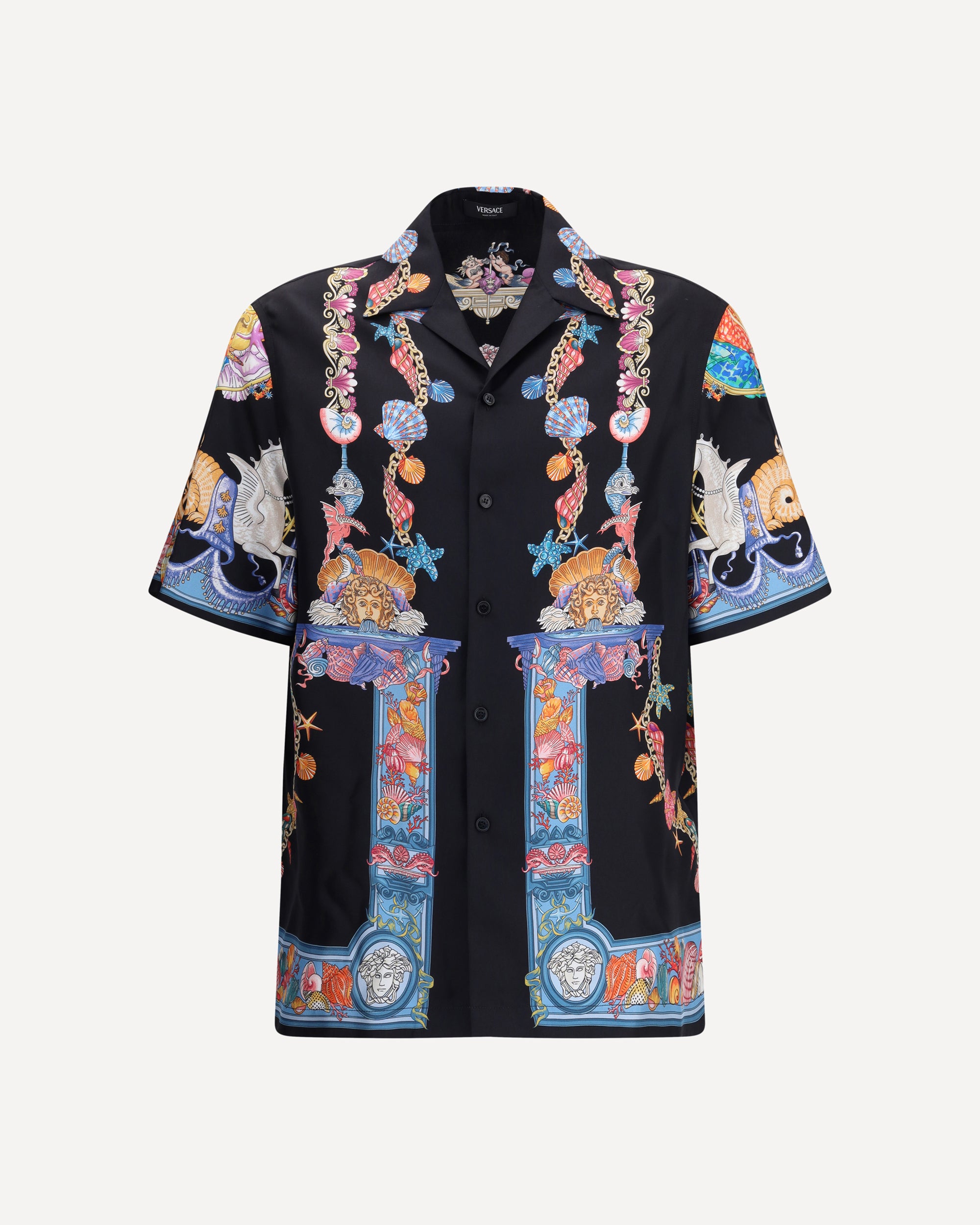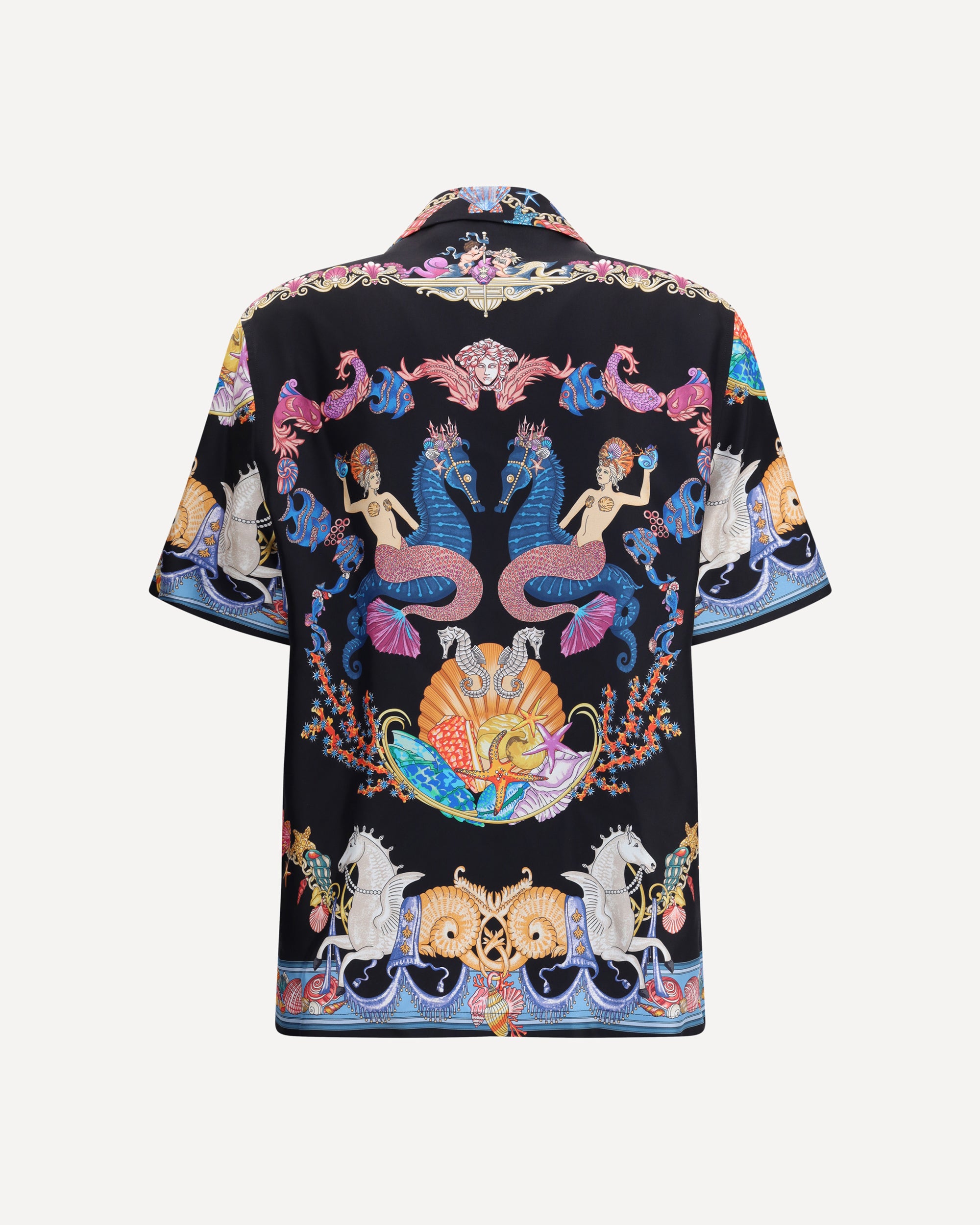 Versace's silk Theatre Shirt is a short-sleeved design with a Cuban collar and front button closure. The exclusive print depicts corals, shells and mermaids, enhanced by theatrical elements that express the Maison's deep connection with the dramatic arts. Two side slits complete the design for a fluid and refined fit.
