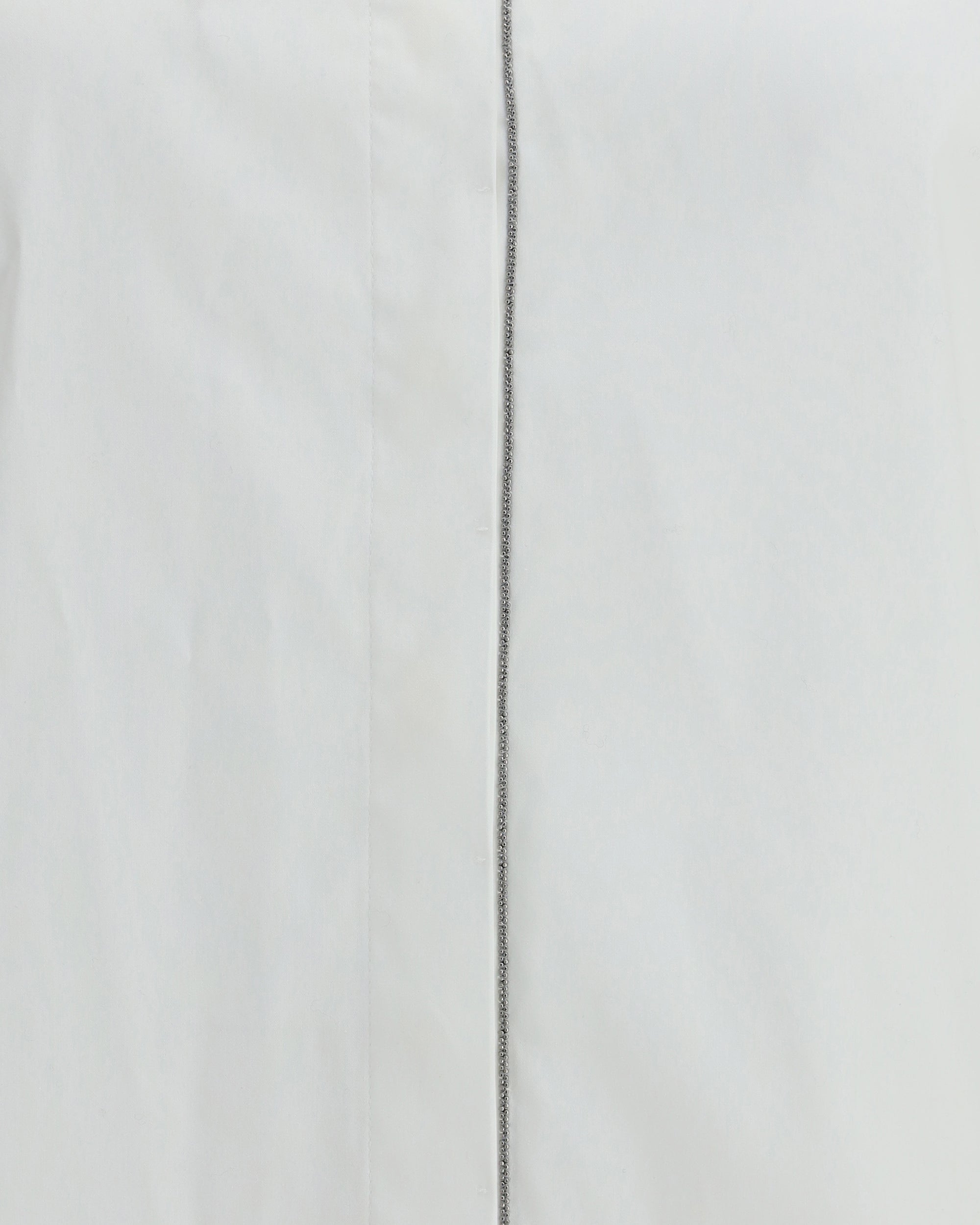 The Cotton Shirt by Brunello Cucinelli is an elegant and refined piece, characterized by a classic collar that gives it a timeless look. The front closure with hidden buttons, embellished with iconic jewels, adds a touch of luxury and sophistication. The adjustable cuffs with buttons allow you to adapt the fit for greater comfort. The monochrome pattern gives it a clean and versatile look, making this shirt perfect for both formal and casual combinations, without ever sacrificing class.