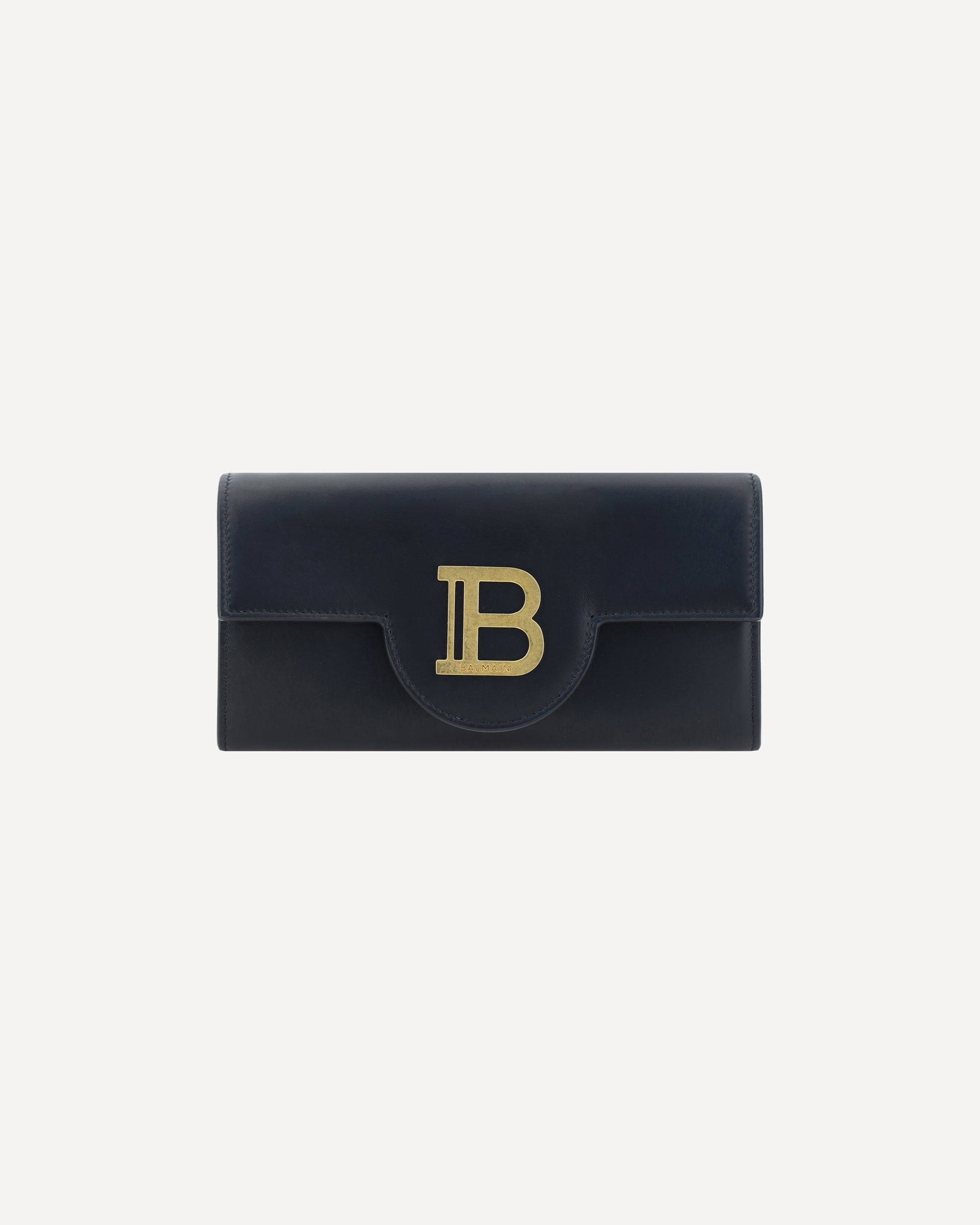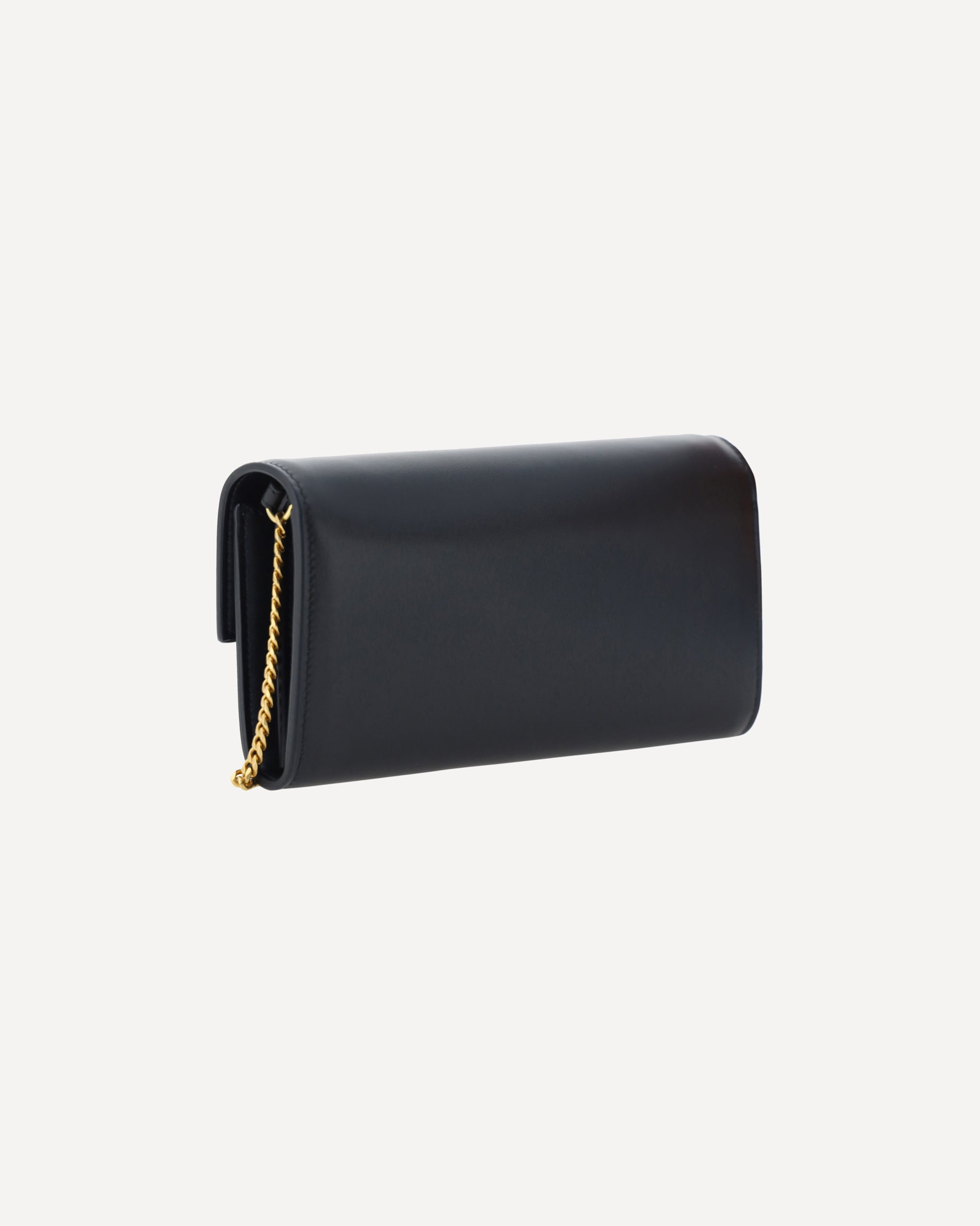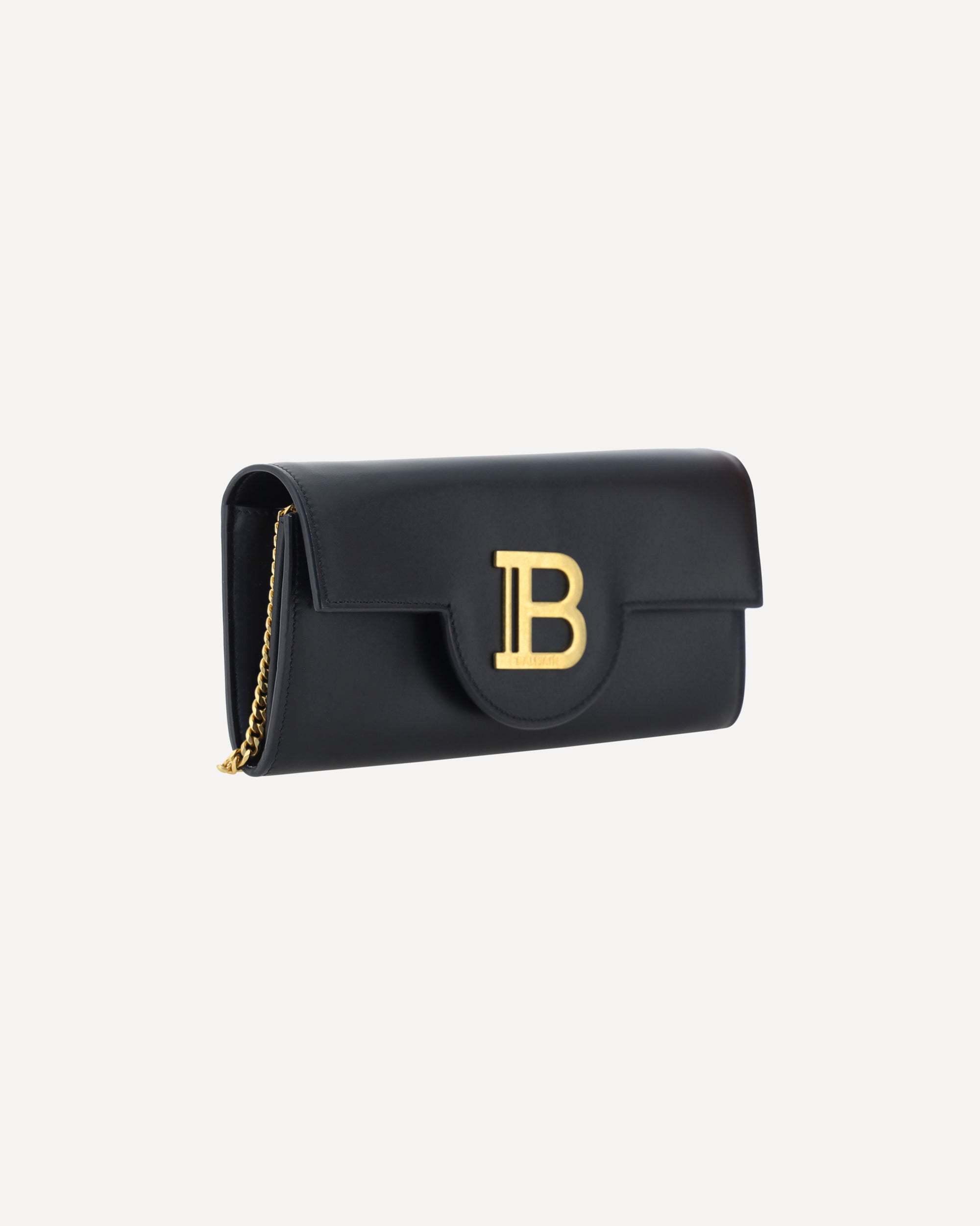Calfskin Shoulder Wallet by Balmain, gold-plated chain shoulder strap, front closure by magnetic flap, maxi three-dimensional brand logo plaque applied on front, interior coin compartment, bill compartment and interior card slots.