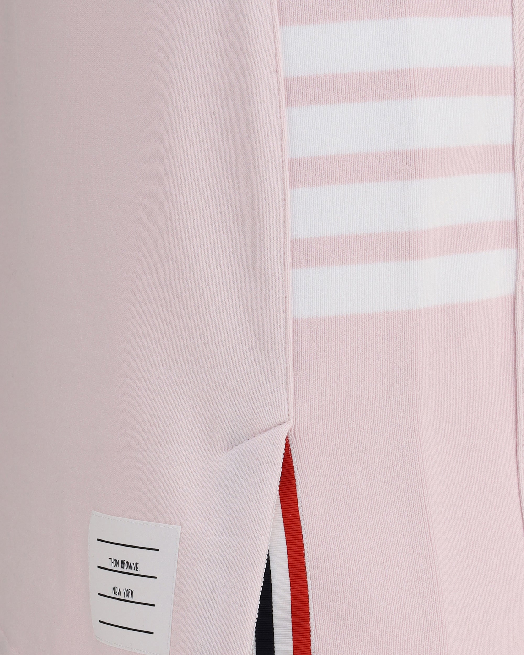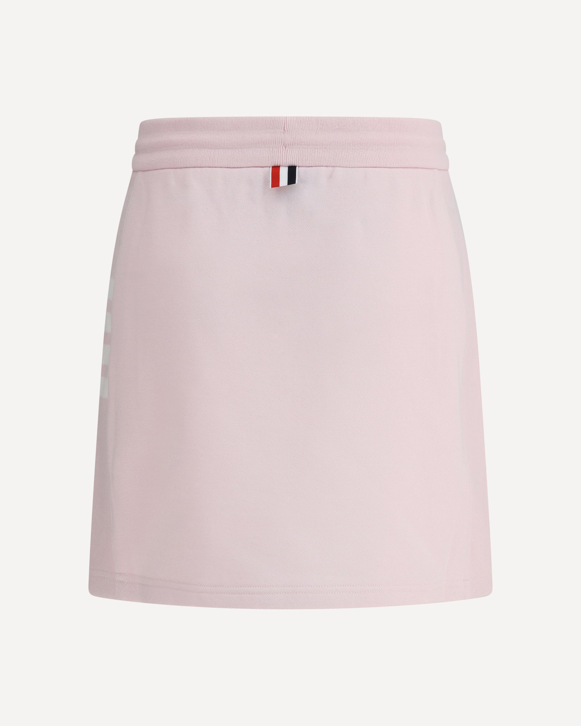 Cotton Mini Skirt by Thom Browne with an adjustable drawstring waistband for a customized fit. The style features two front slits decorated with the brand's iconic multicolored bands, an appliquéd logo patch on the front and distinctive side bands that echo Thom Browne's signature style.
