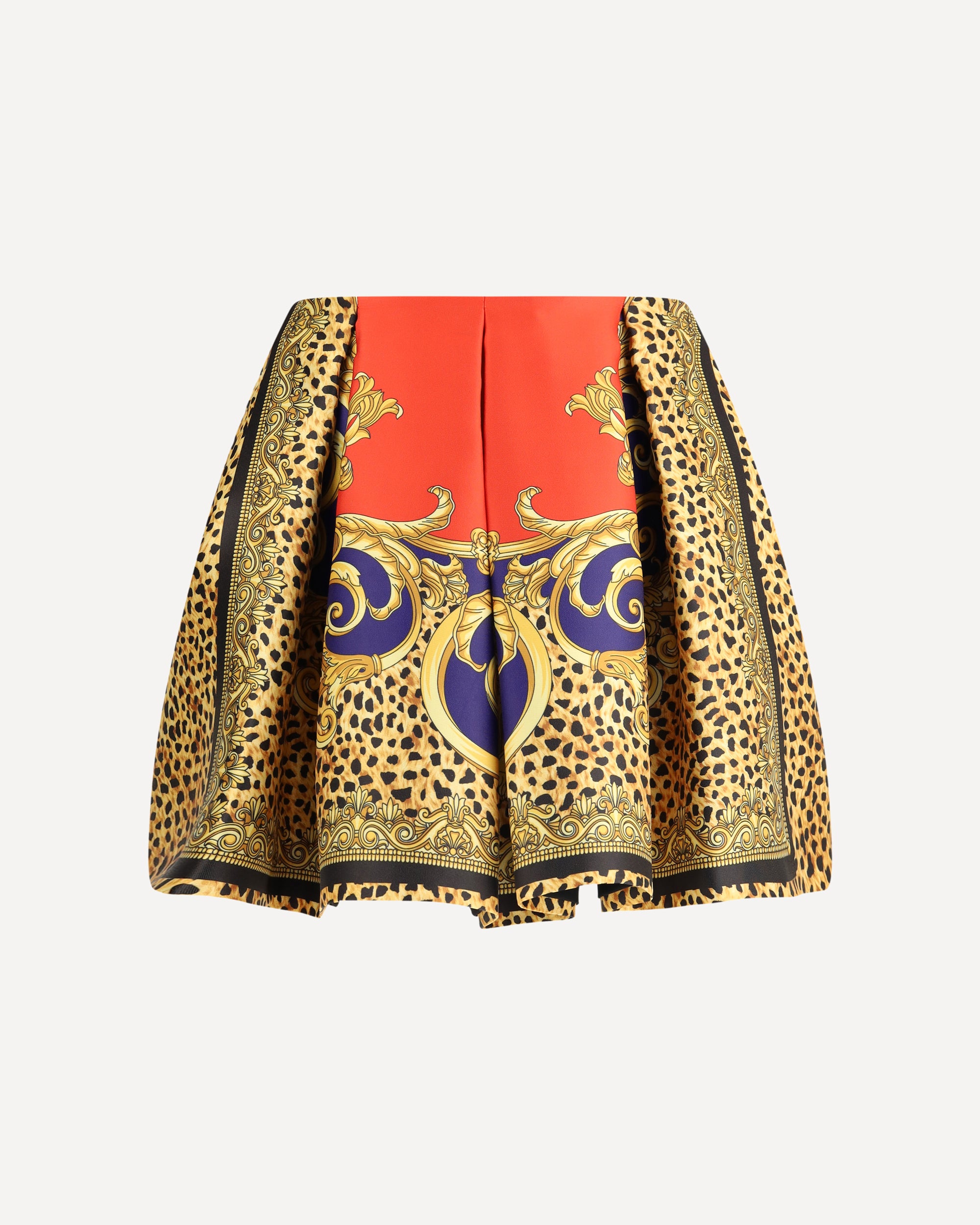 The Silk-Blend Duchesse Mini Skirt by Versace channels the maison’s vibrant energy through the all-over Cheetah Barocco Rock ’n’ Royalty print. The pleated design creates volume and movement, evoking bold and theatrical femininity. A concealed side zip closure and side pockets add practicality while preserving the iconic character of the design.