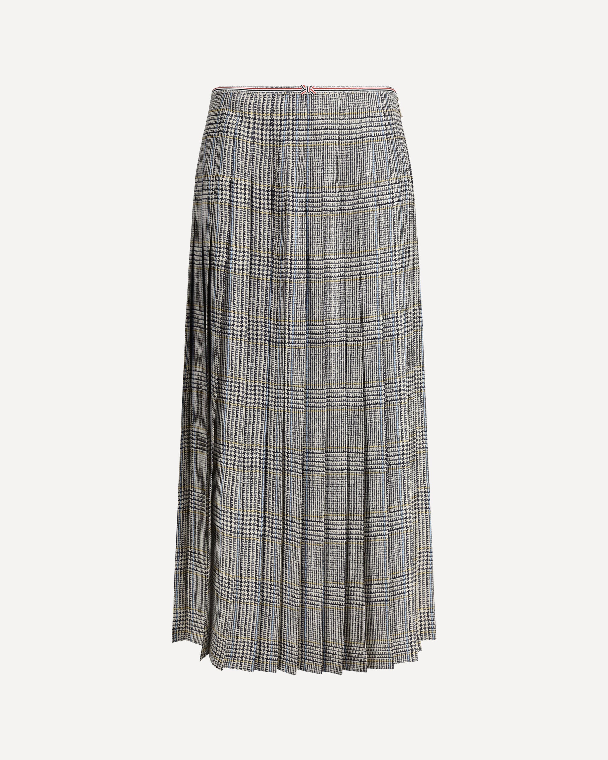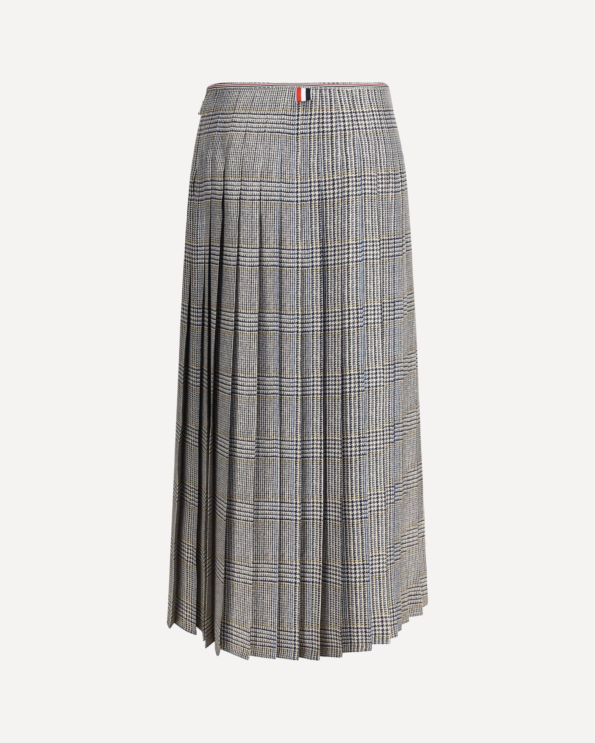 The Silk Tweed Skirt by Thom Browne is designed to carry you in style through every season, offering year-round versatility. The side zip closure and the signature striped grosgrain loop tab, along with the front-positioned bow, complete the design. Perfect for an elegant and timeless look.