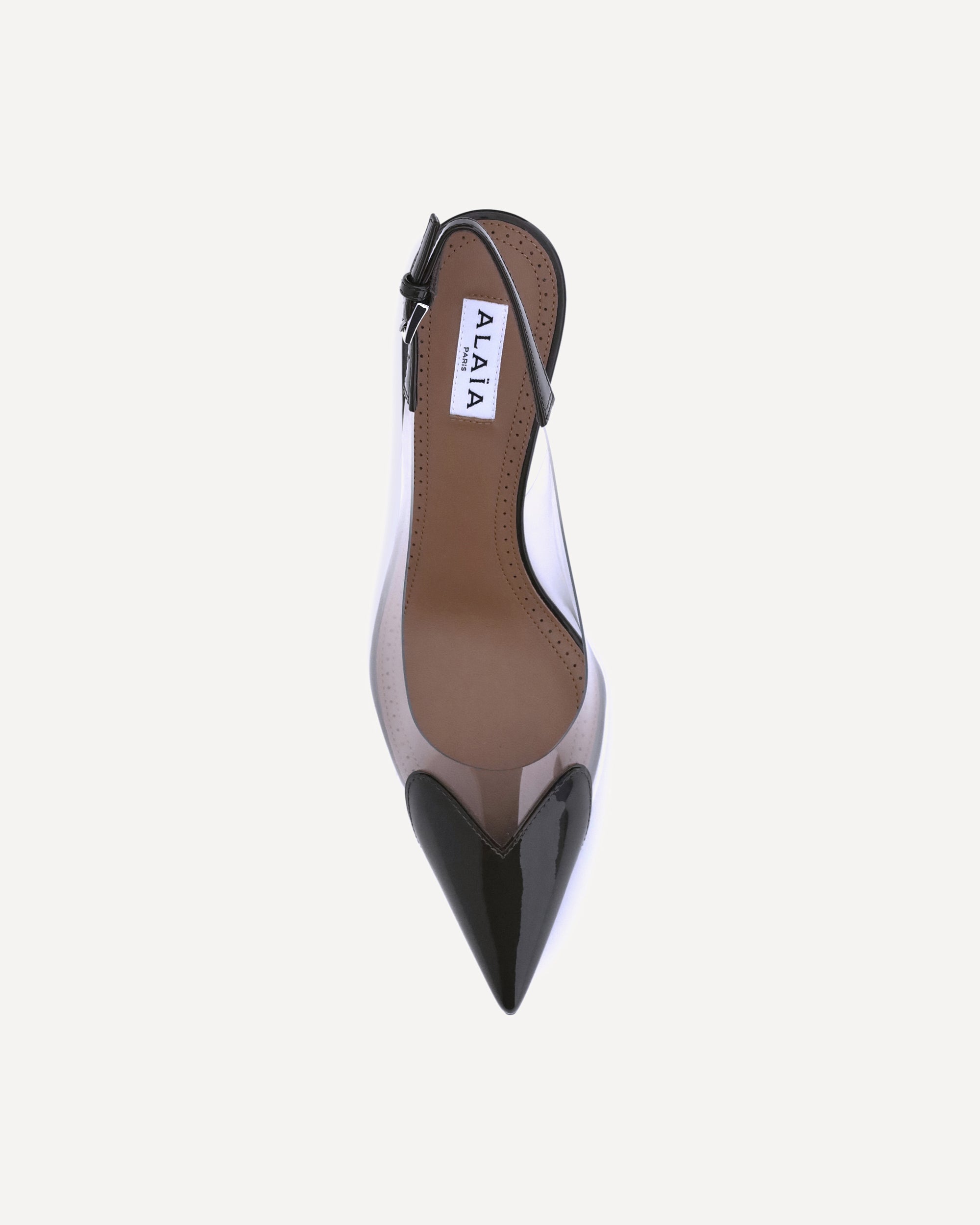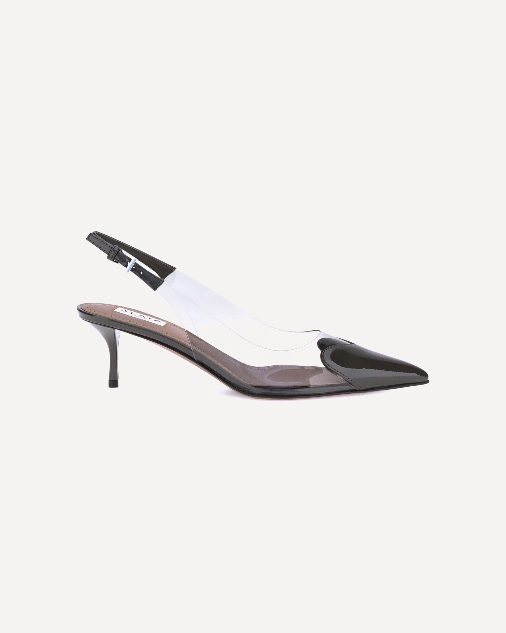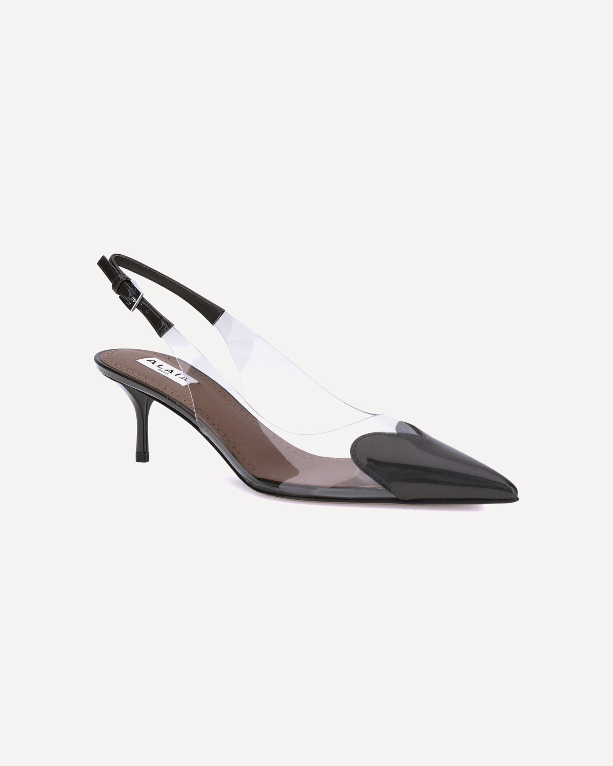 The Alaïa leather Le Coeur Pumps is an elegant and feminine model, characterized by an elongated pointed silhouette and a leather stiletto heel. The slingback detail with an adjustable buckle delicately wraps the heel, while the transparent side panels give lightness and modernity to the design.