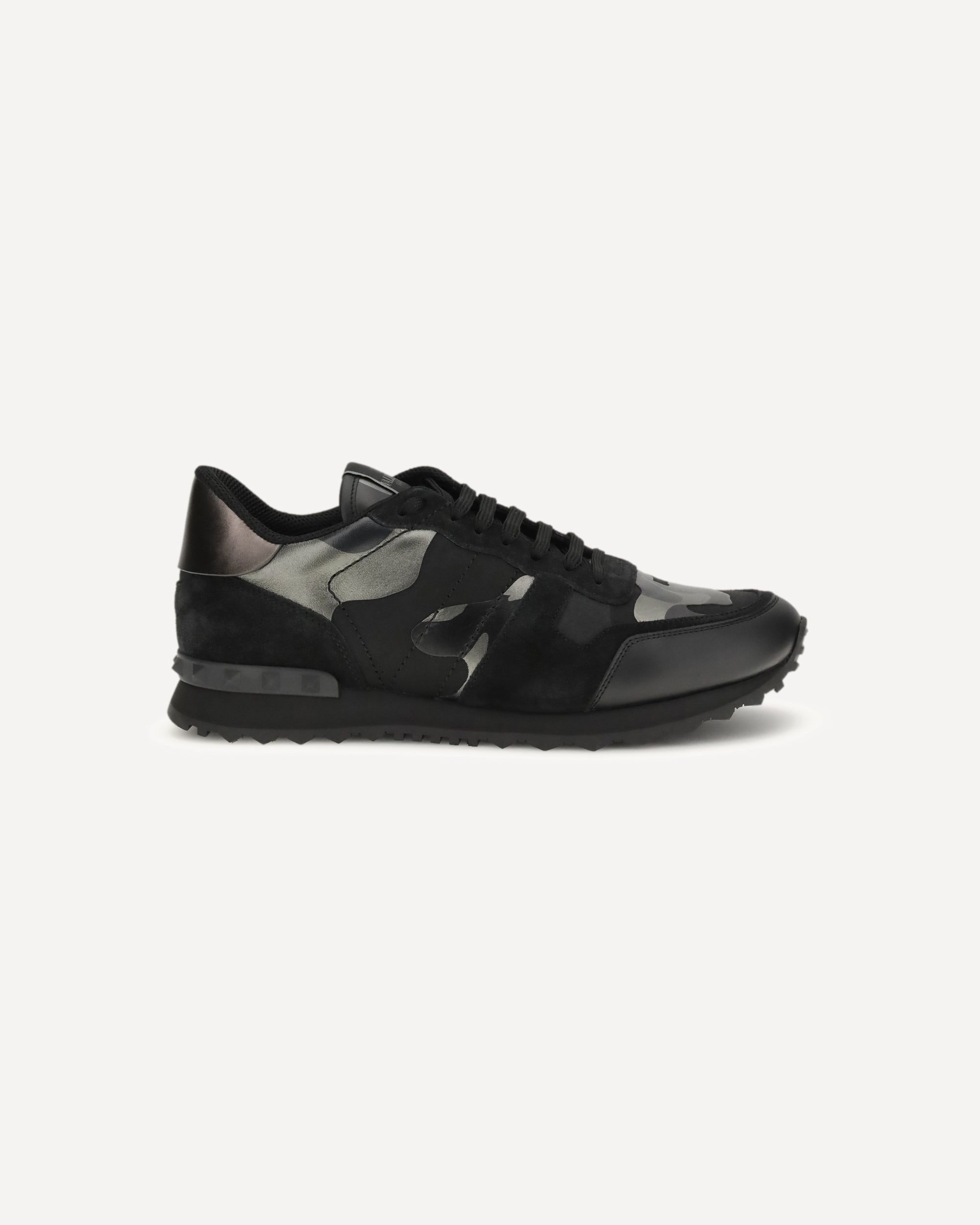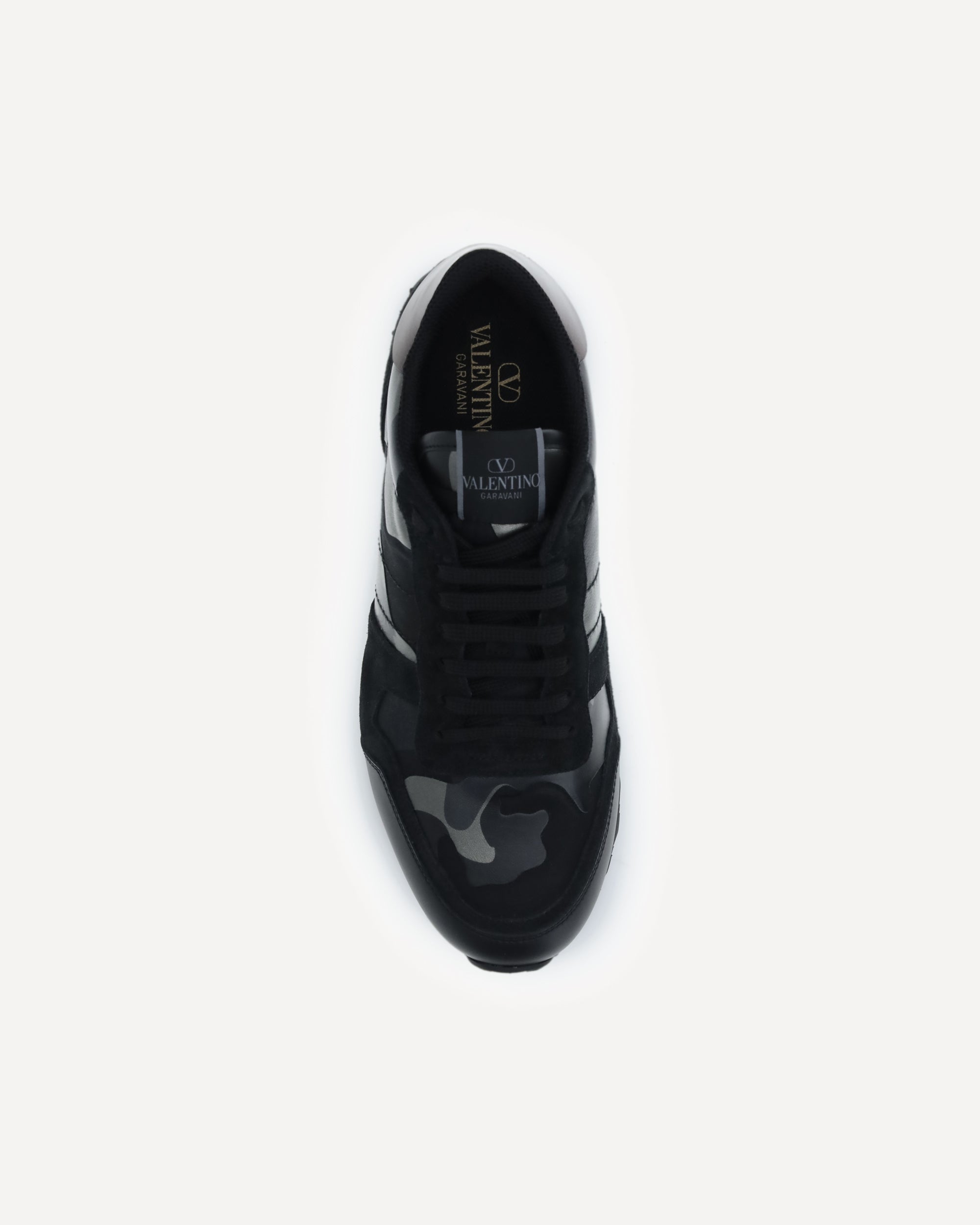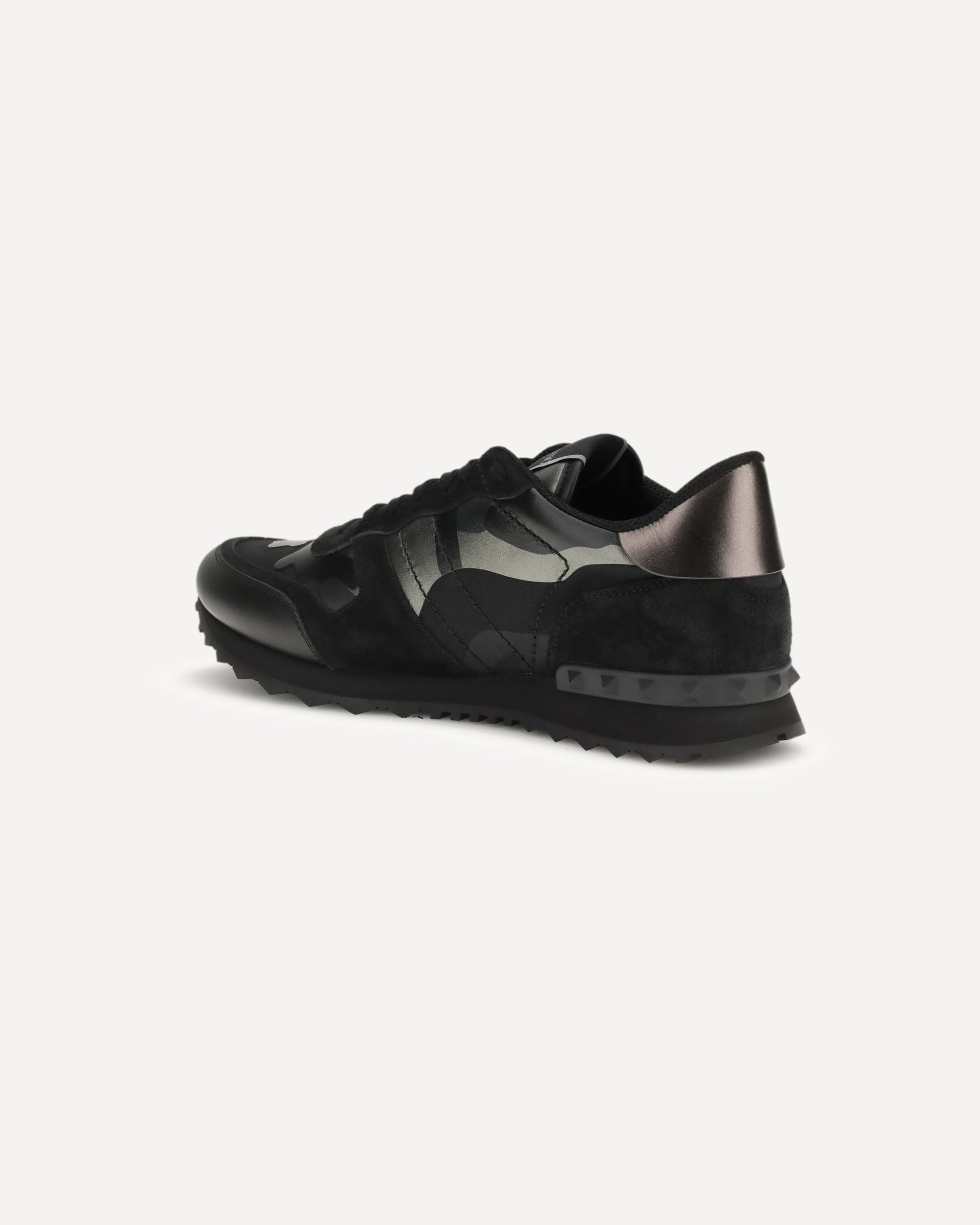 The Rockrunner Sneakers by Valentino Garavani are made of calfskin leather and feature a round toe, lace-up closure and tone-on-tone stitching. Logos on the tongue and insole enhance the identity, while padding at the ankle ensures comfort. Rockstud detail and an inset design add character, complemented by a slip-resistant rubber sole that provides stability