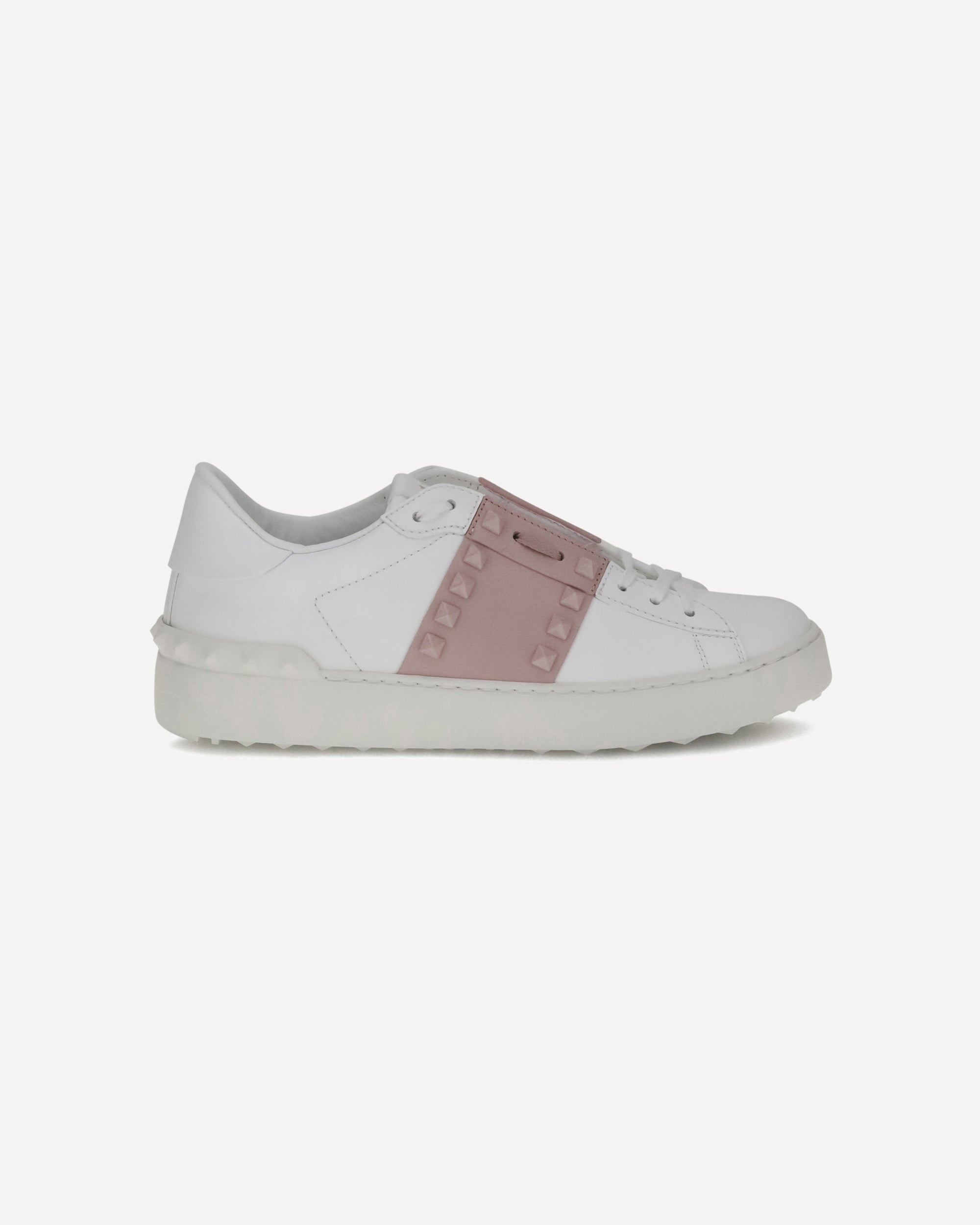 Valentino Garavani's Rockstud Untitled Sneakers are a bold and refined interpretation of urban style. Made of calfskin, they feature a platinum-finish stud appliqué band that lends a touch of shine and grit to the design. The special number 11 label adds an exclusive element, while the white rubber sole, enhanced with rubber studs on the back, completes the look with a distinctive, modern accent.
