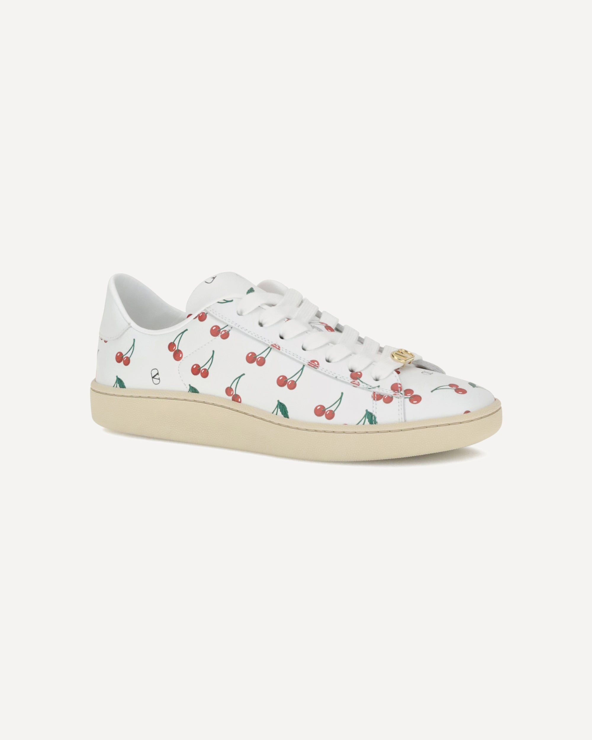 Valentino Garavani's Royco Cherryfic Sneakers combine pop spirit and craftsmanship in a bold design. Made of soft tasseled calfskin with a Cherryfic pattern, they feature laces decorated with a removable Signature VLogo accessory in antique-effect brass. The same logo, screen-printed on the back, reinforces the brand's identity. The rubber sole completes the silhouette with comfort and urban style.
