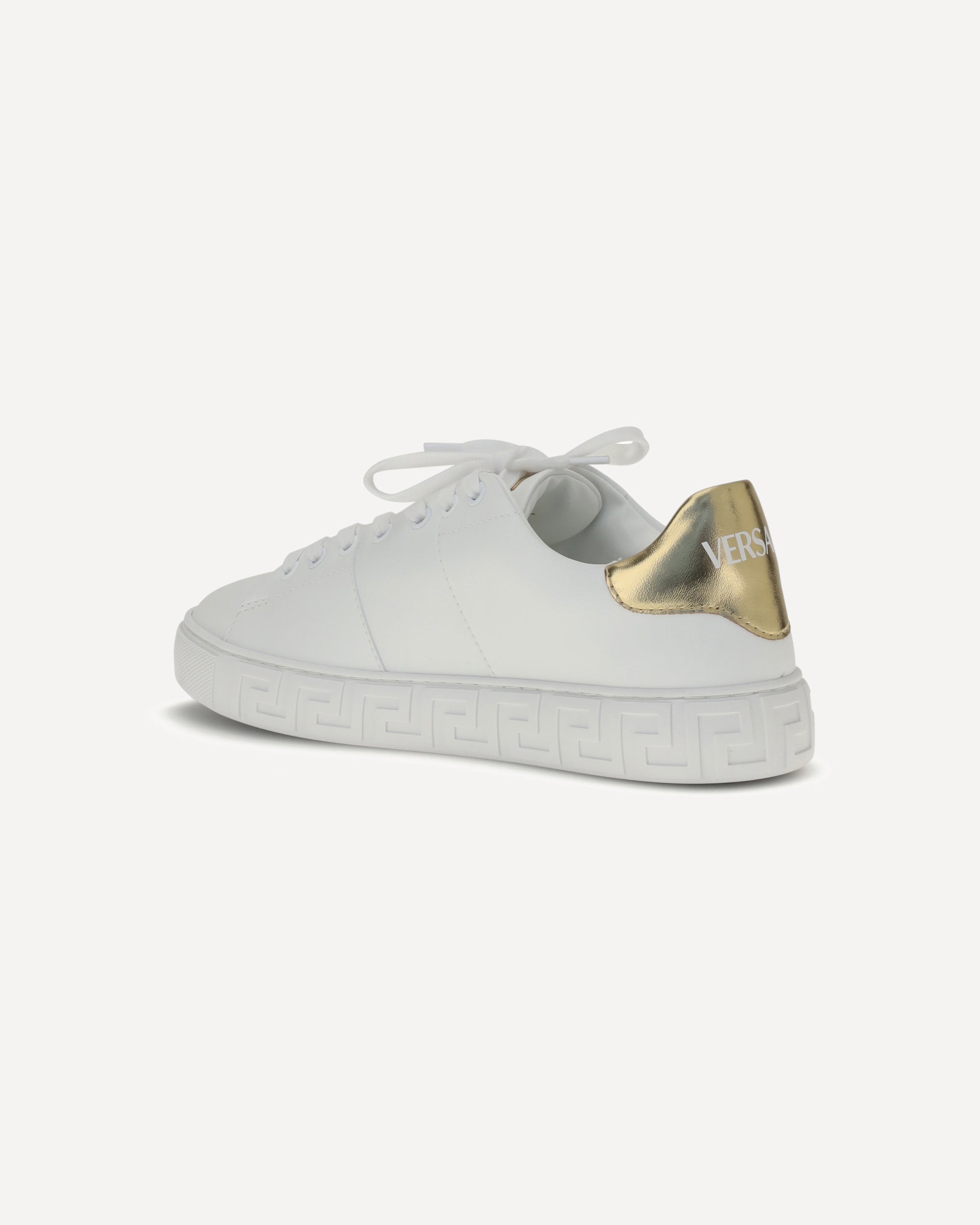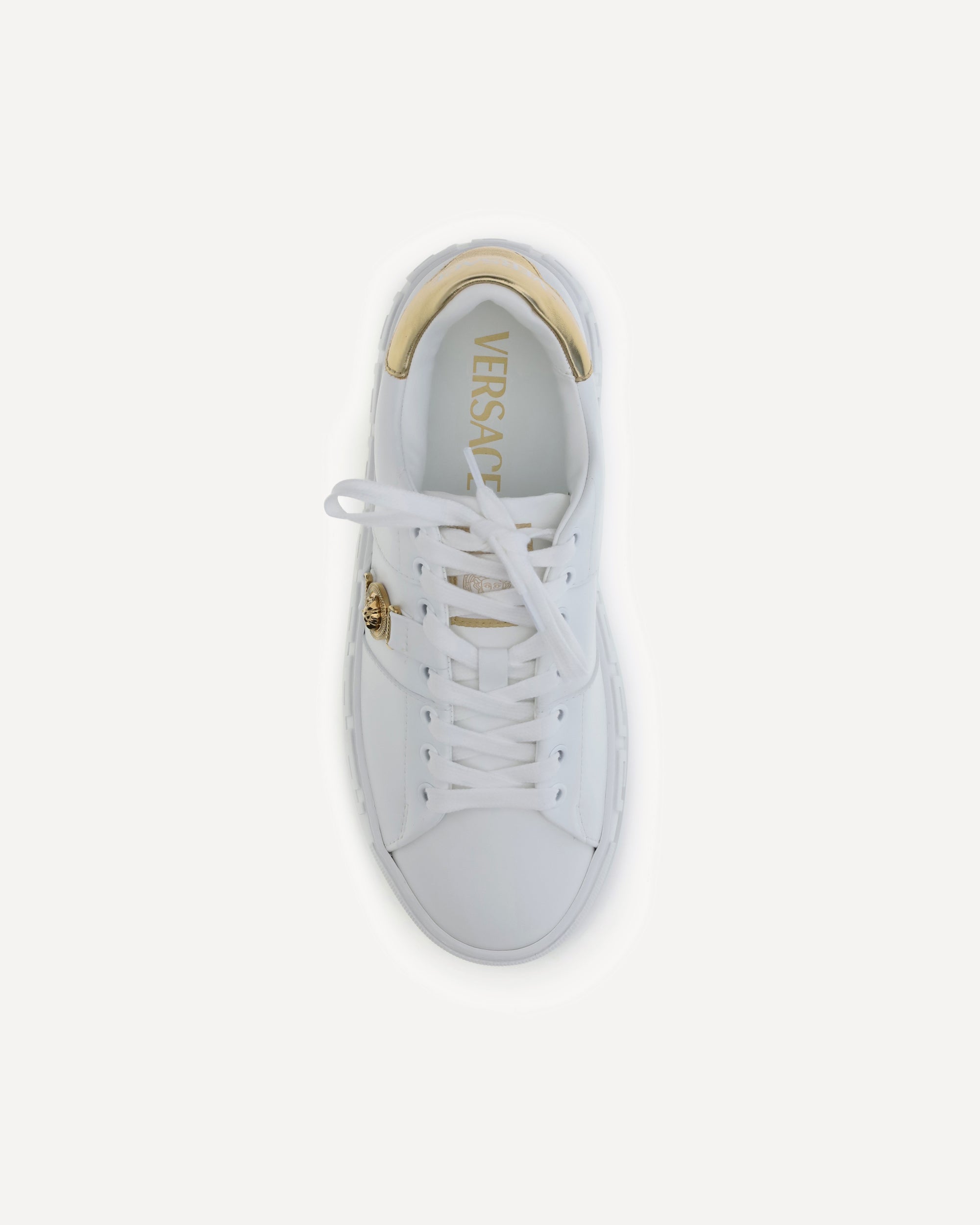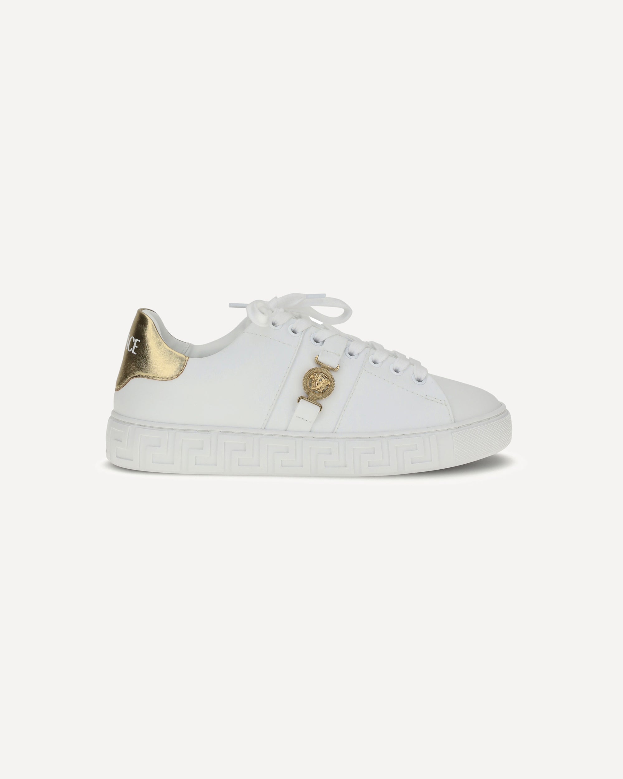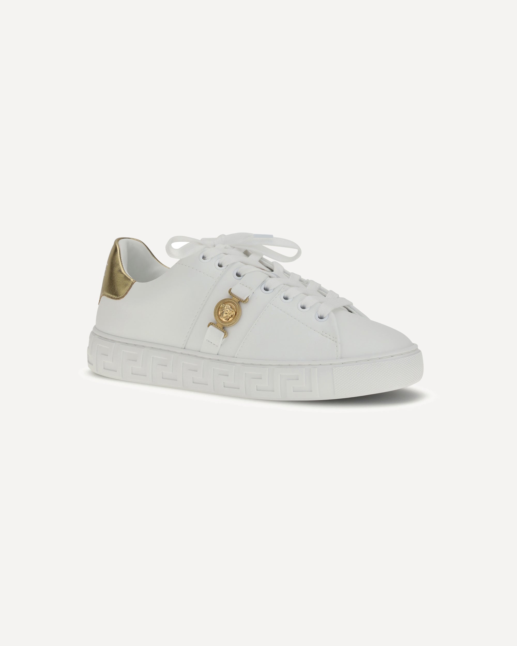 The Versace Medusa Sneakers stand out for their iconic Greek key sole and gold heel embellished with the brand's logo. Featuring a rounded toe and lace-up closure, they also feature an elegant gold Medusa detail on the side, underscoring their exclusivity.