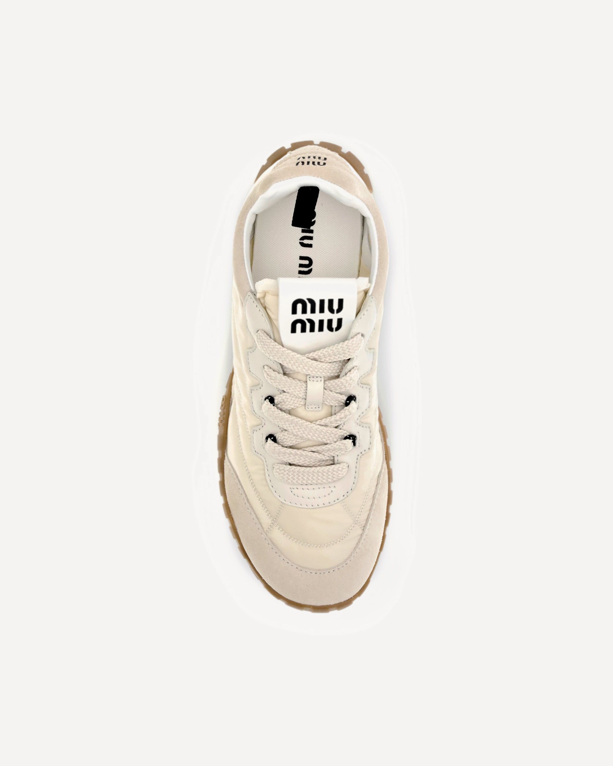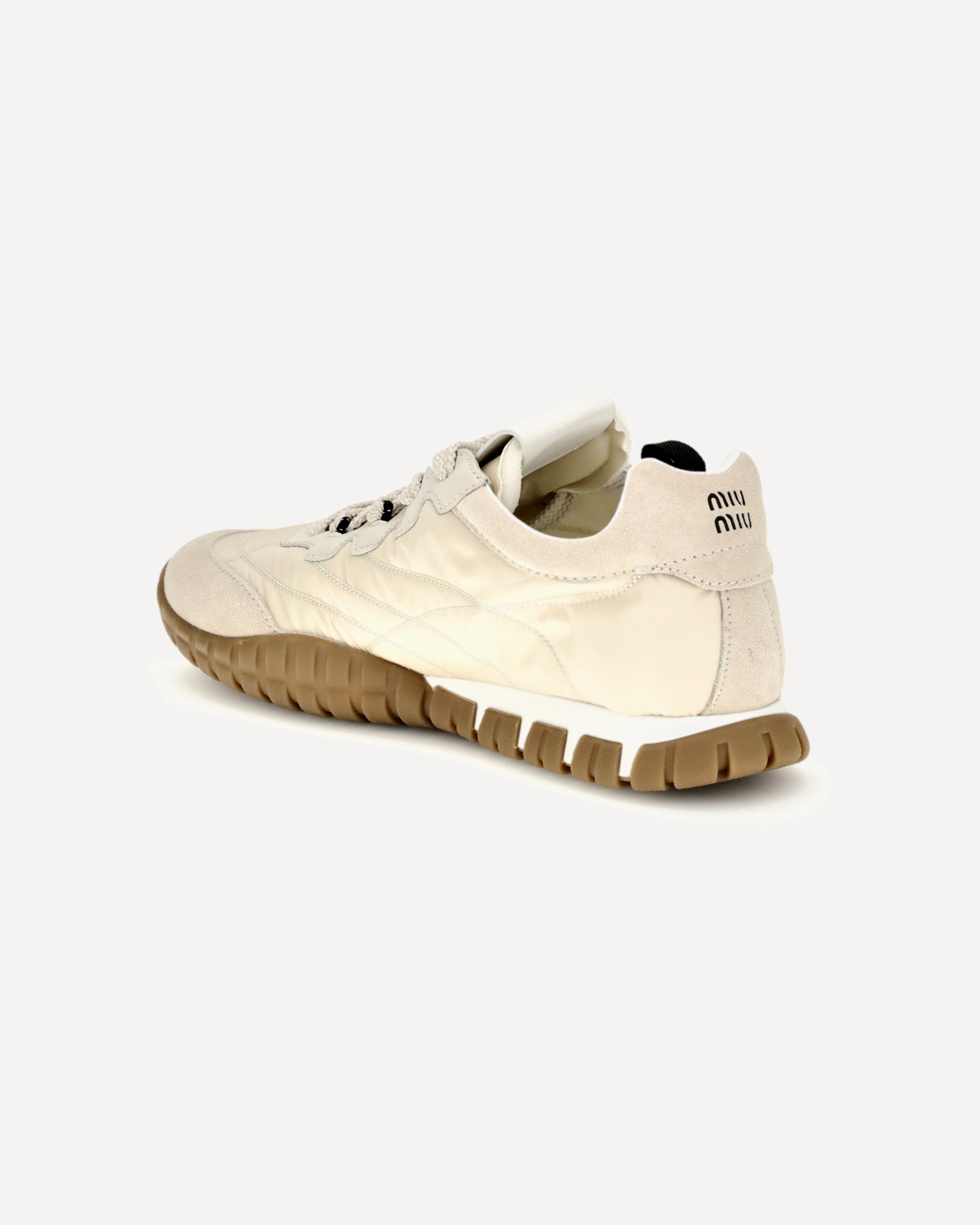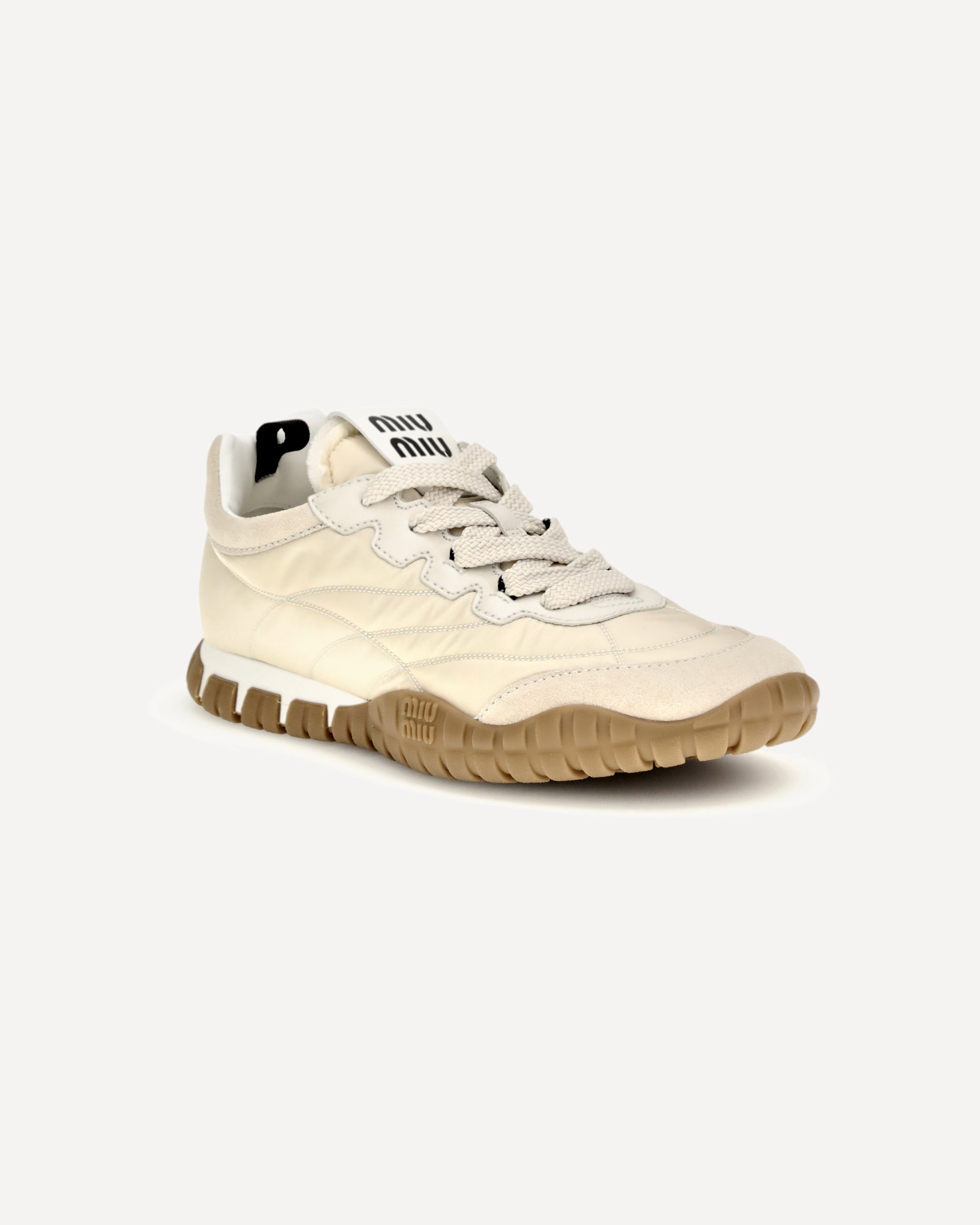 The Tyre Sneakers by Miu Miu combine technical materials and refined details in a dynamic, contemporary design. Made of technical fabric and suede, they feature lace-up lacing and fabric and leather lining for optimal comfort. Screen-printed logos appear on the tongue, diagonal and insole, while the EVA and rubber outsole with star tread ensures light weight and grip. The removable leather-covered footbed completes the model with functionality and sophistication.