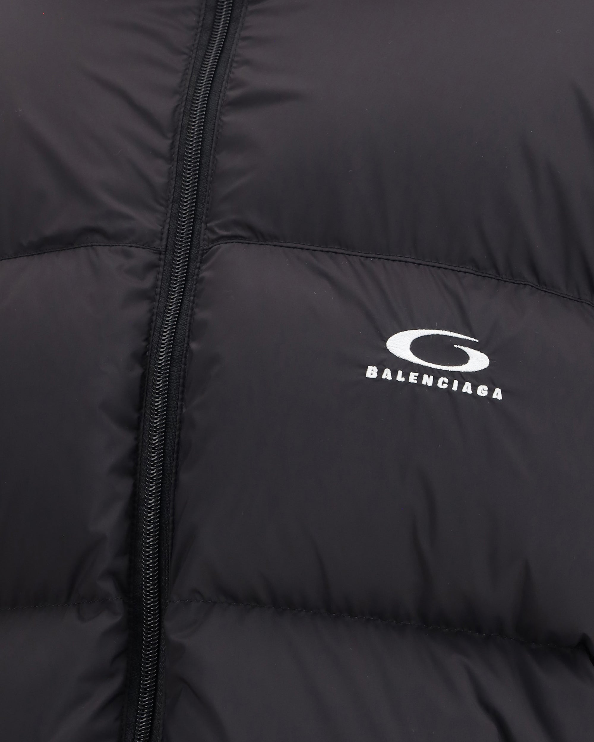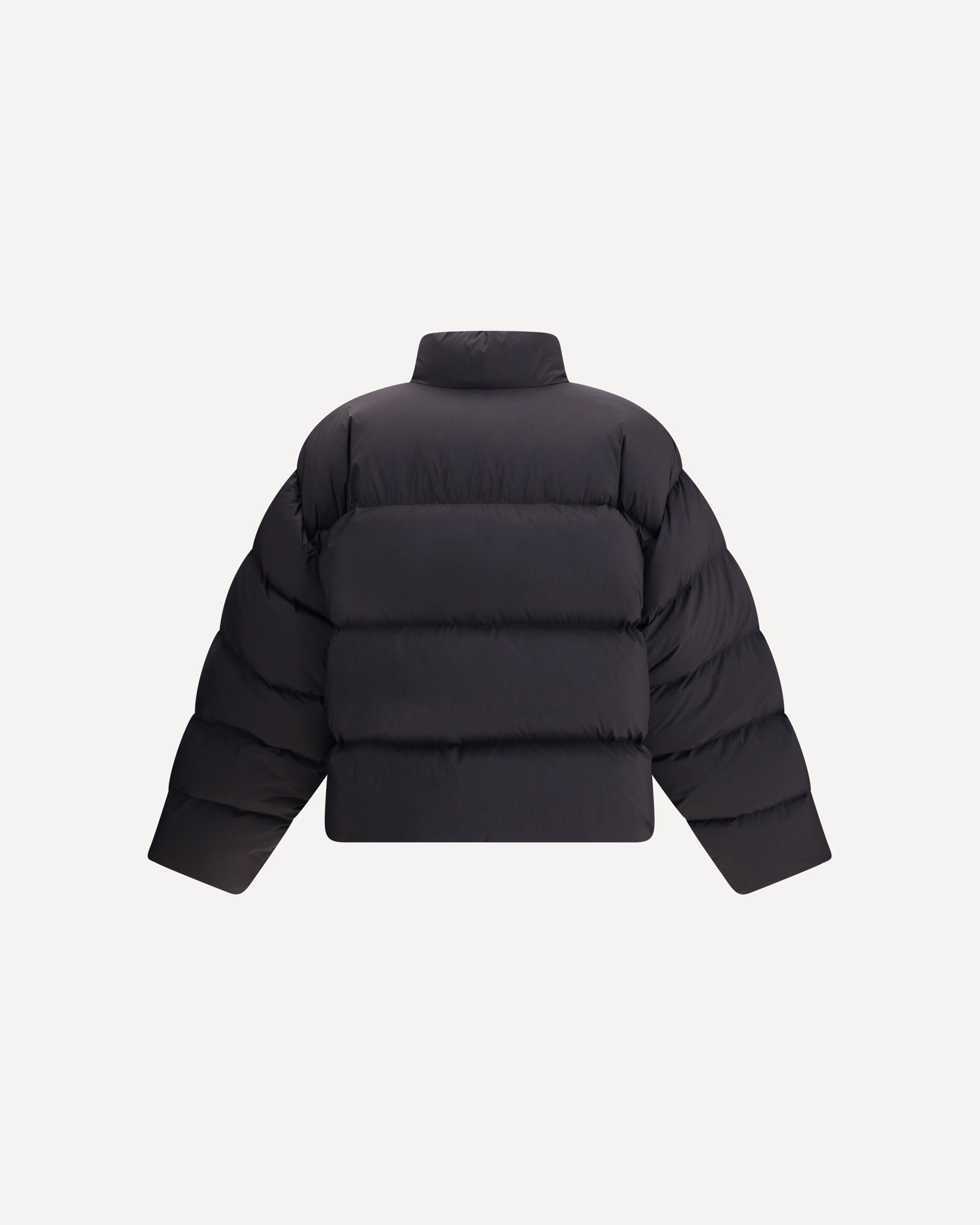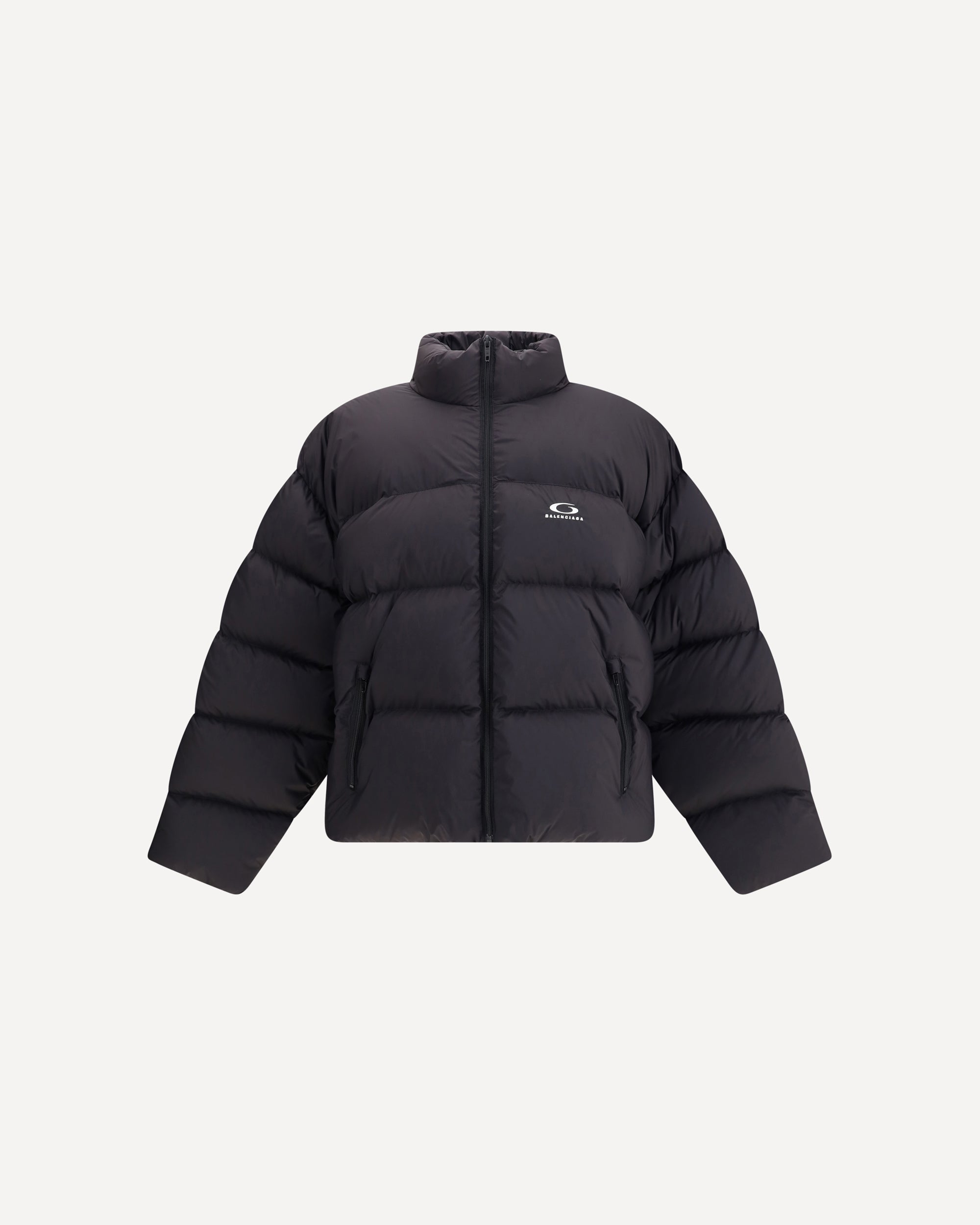The Balenciaga Standard Puffer in Black is a contemporary wardrobe essential. Crafted from lightweight matte nylon, it features a cocoon-like volume, high straight collar, concealed zip with snap-button placket, two slanted pockets, and an adjustable drawcord at the hem. The embroidered “loop sports icon” on the chest adds a distinctive touch, blending minimalism with refined design