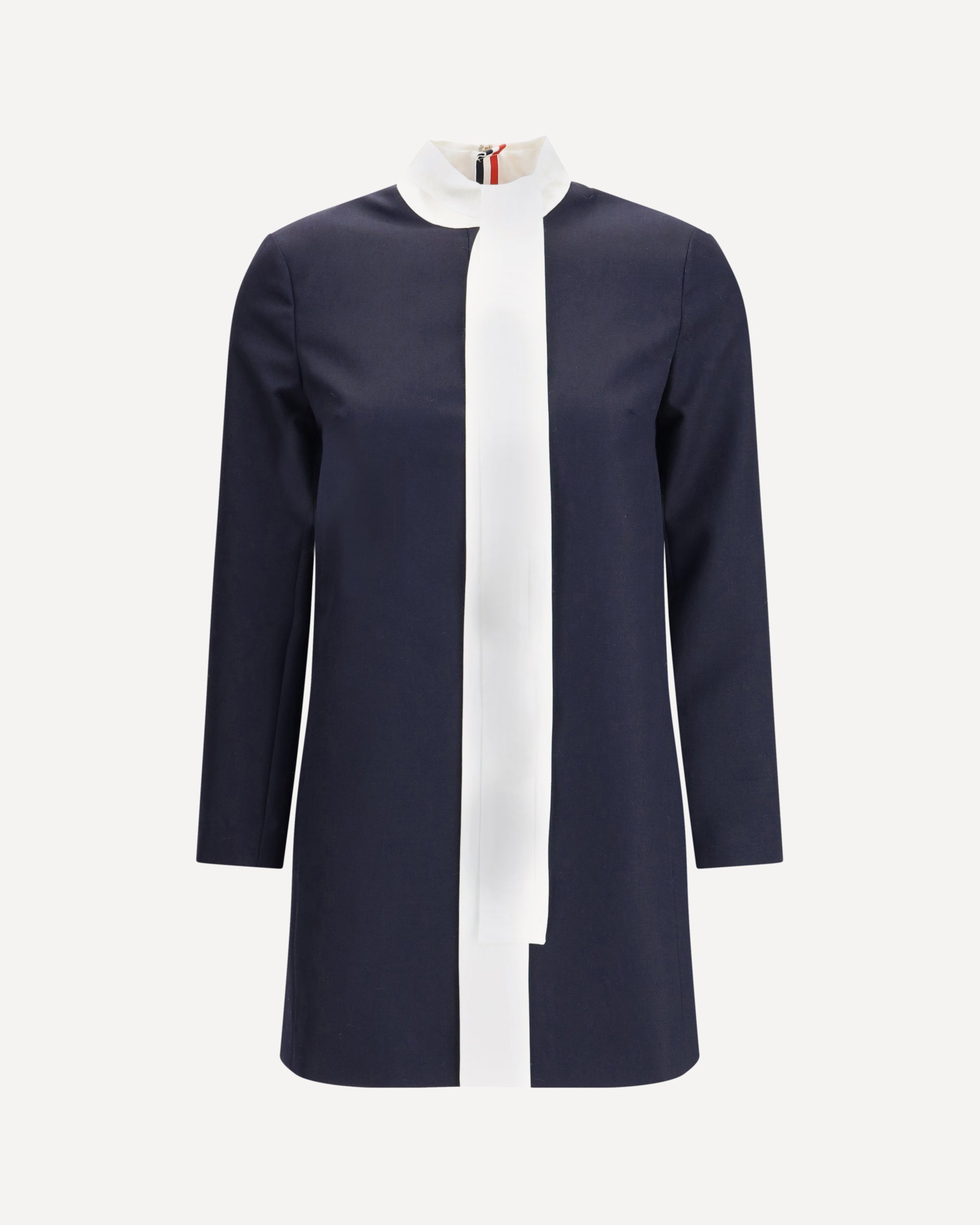 The High Wool Suiting Shift Dress by Thom Browne embodies timeless elegance, blending classic lines with refined details. Expertly tailored from fine wool and finished with a delicate silk collar, the design is elevated by an oversized bow that enhances femininity with sophistication. A back zip closure highlights the meticulous craftsmanship, while the clean silhouette makes it a versatile piece designed to endure through time.
