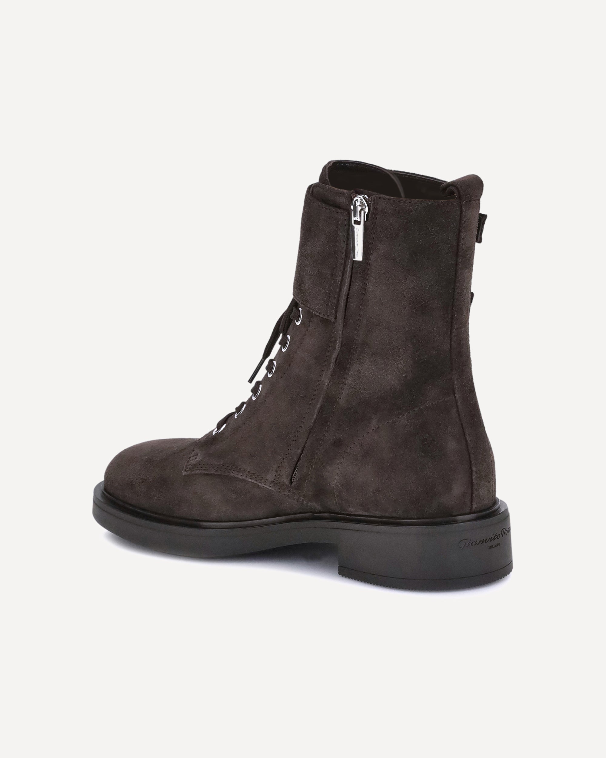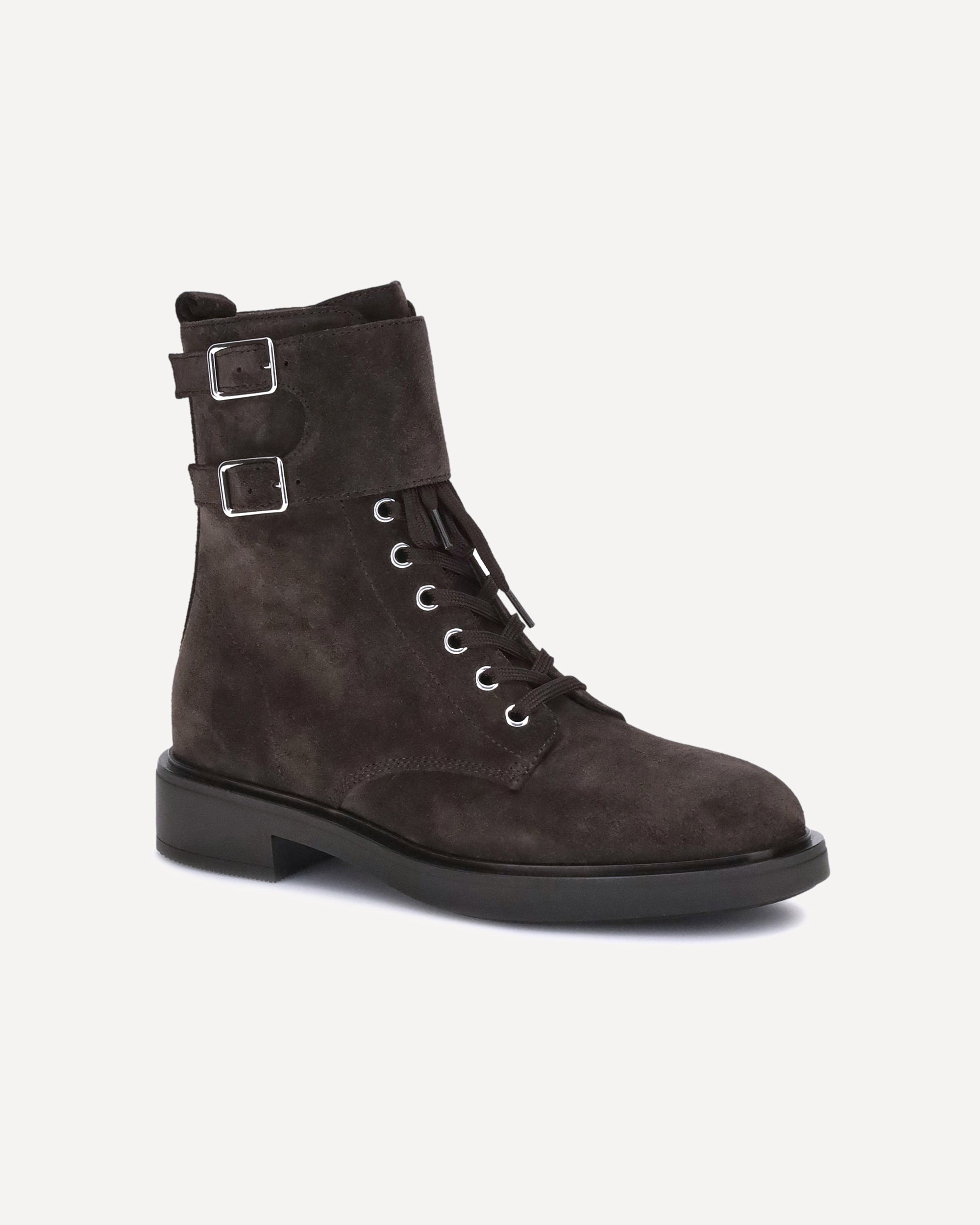 The laced Ankle Boots by Gianvito Rossi combine style and functionality with a refined design. Featuring a lace-up front closure and two side buckles that add a touch of character, they are complemented by a side zipper for a practical fit. The block heel ensures comfort and stability, making these ankle boots perfect for sophisticated and contemporary looks.