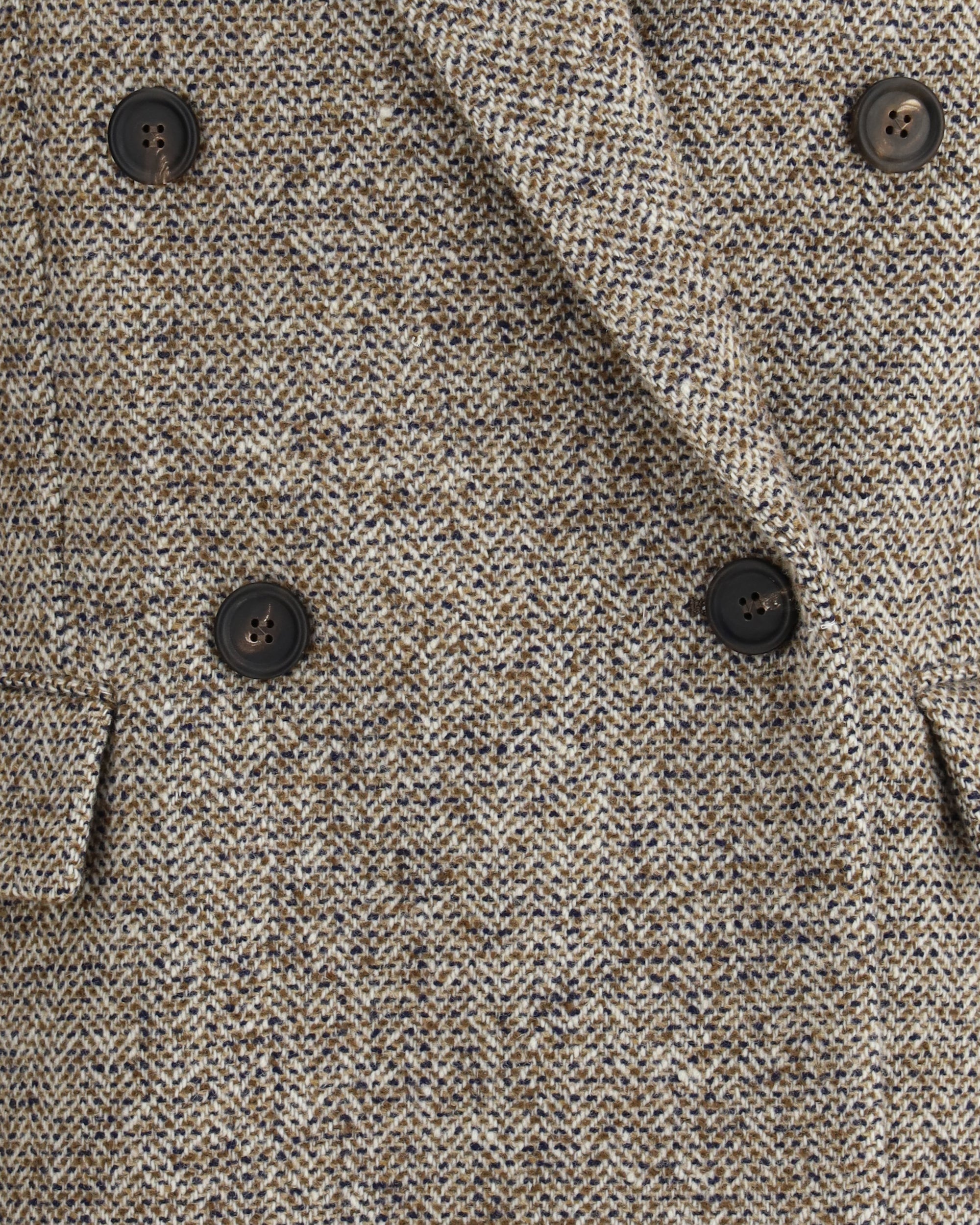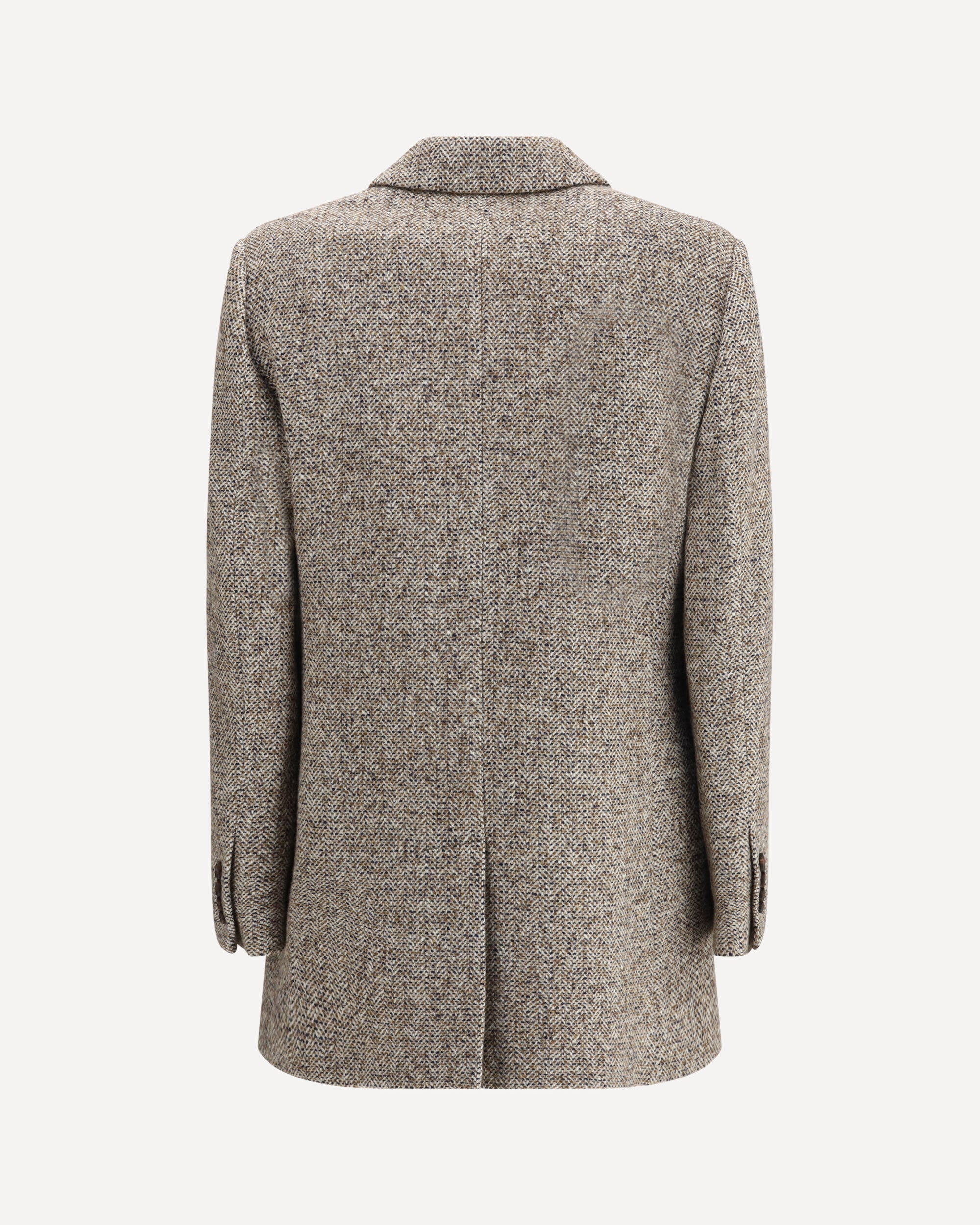 The Virgin Wool and Silk mélange Jacket by Brunello Cucinelli reinterprets sartorial elegance with refined and precious details. The peaked lapel highlights the classic construction of the piece, enhanced by horn button fastening that emphasizes artisanal craftsmanship. Flap pockets and a chest welt pocket provide functional touches, while the silk-blend crêpe lining ensures comfort and lightness. The Nickel-free monile decoration discreetly adds a luminous accent, turning the jacket into a timeless statement of style.