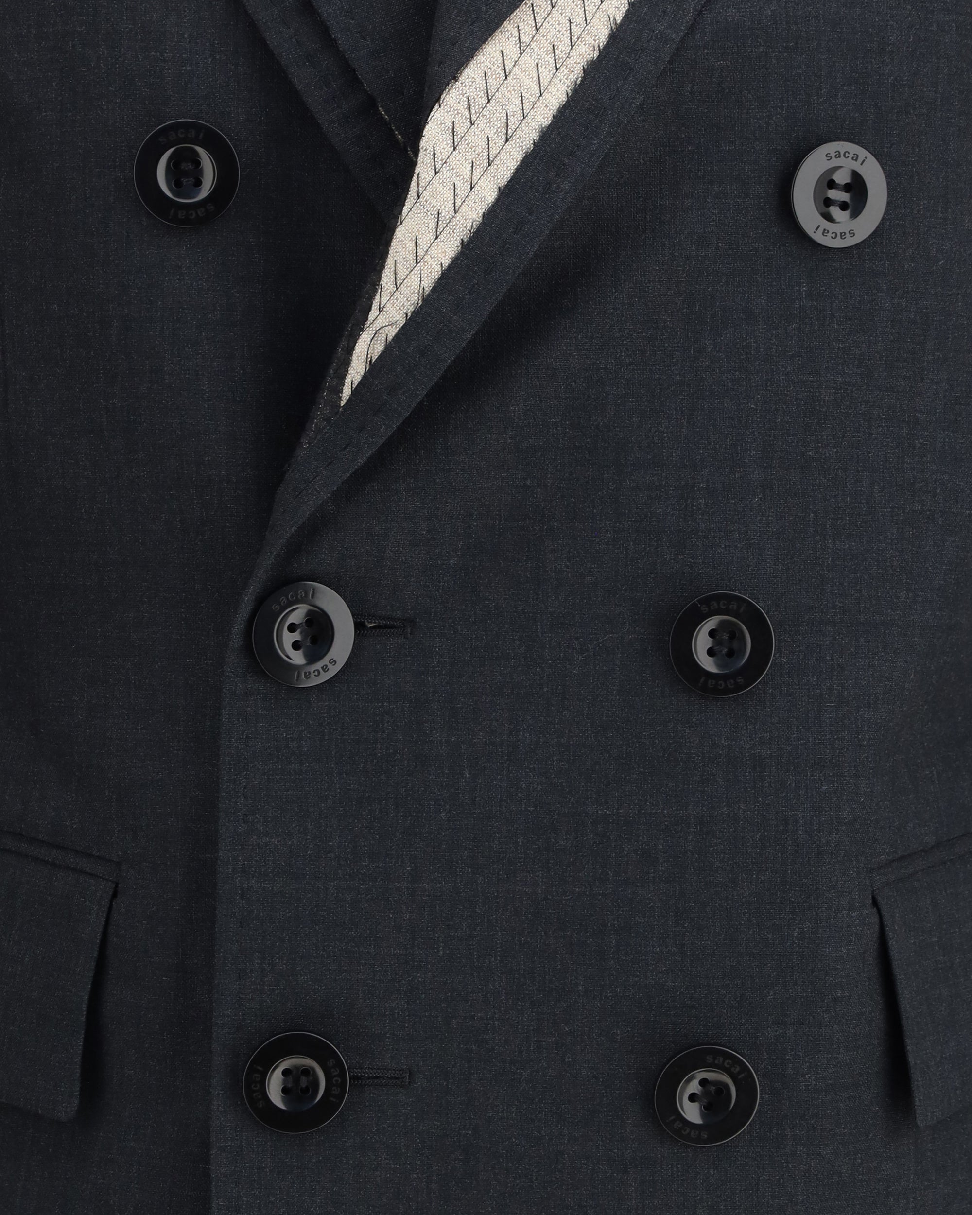 The Suiting Jacket by Sacai revisits traditional tailoring codes with a modern twist. A notch lapel and double-breasted button closure define its structured silhouette, while long sleeves and an asymmetric draped hem add a dynamic touch that embodies the brand’s experimental aesthetic.