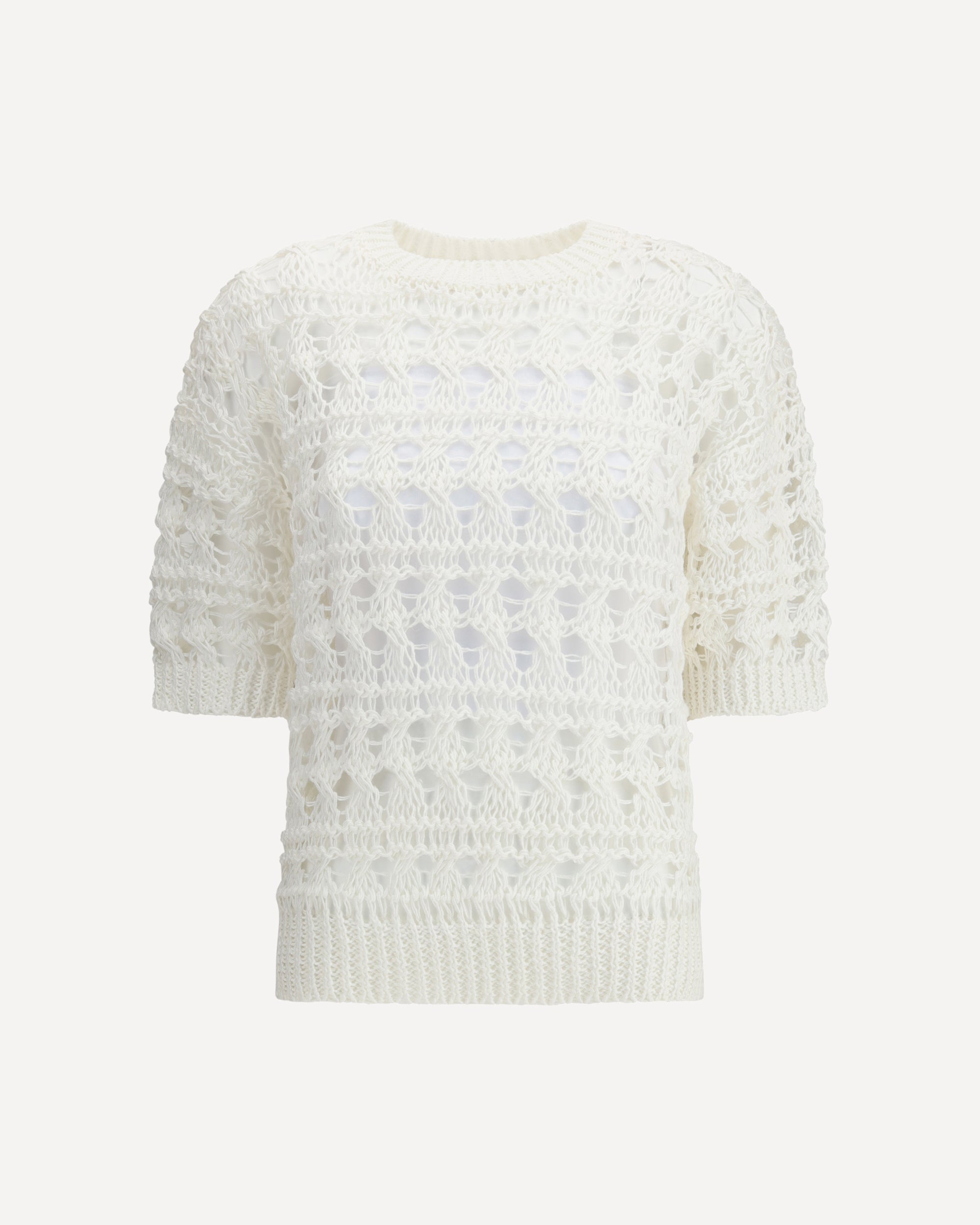 The perforated Cotton-blend Sweater by Brunello Cucinelli reinterprets casual style with a light and refined knit. A crewneck and dropped shoulders shape a relaxed silhouette, while short sleeves and ribbed edges at the hem and cuffs provide balance and practicality. An essential piece that blends comfort and sophistication in perfect harmony.