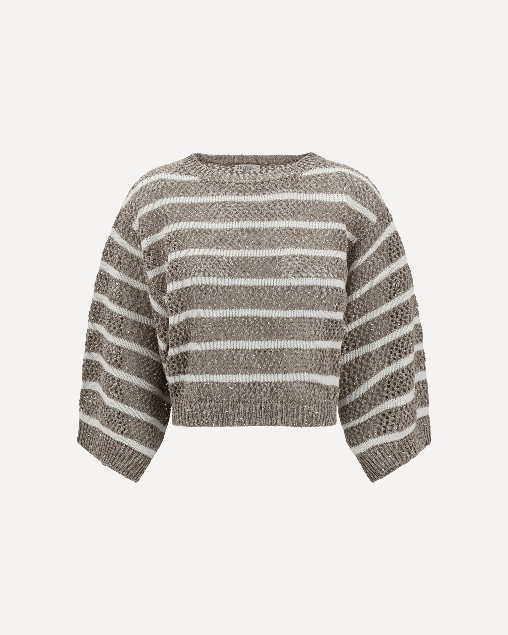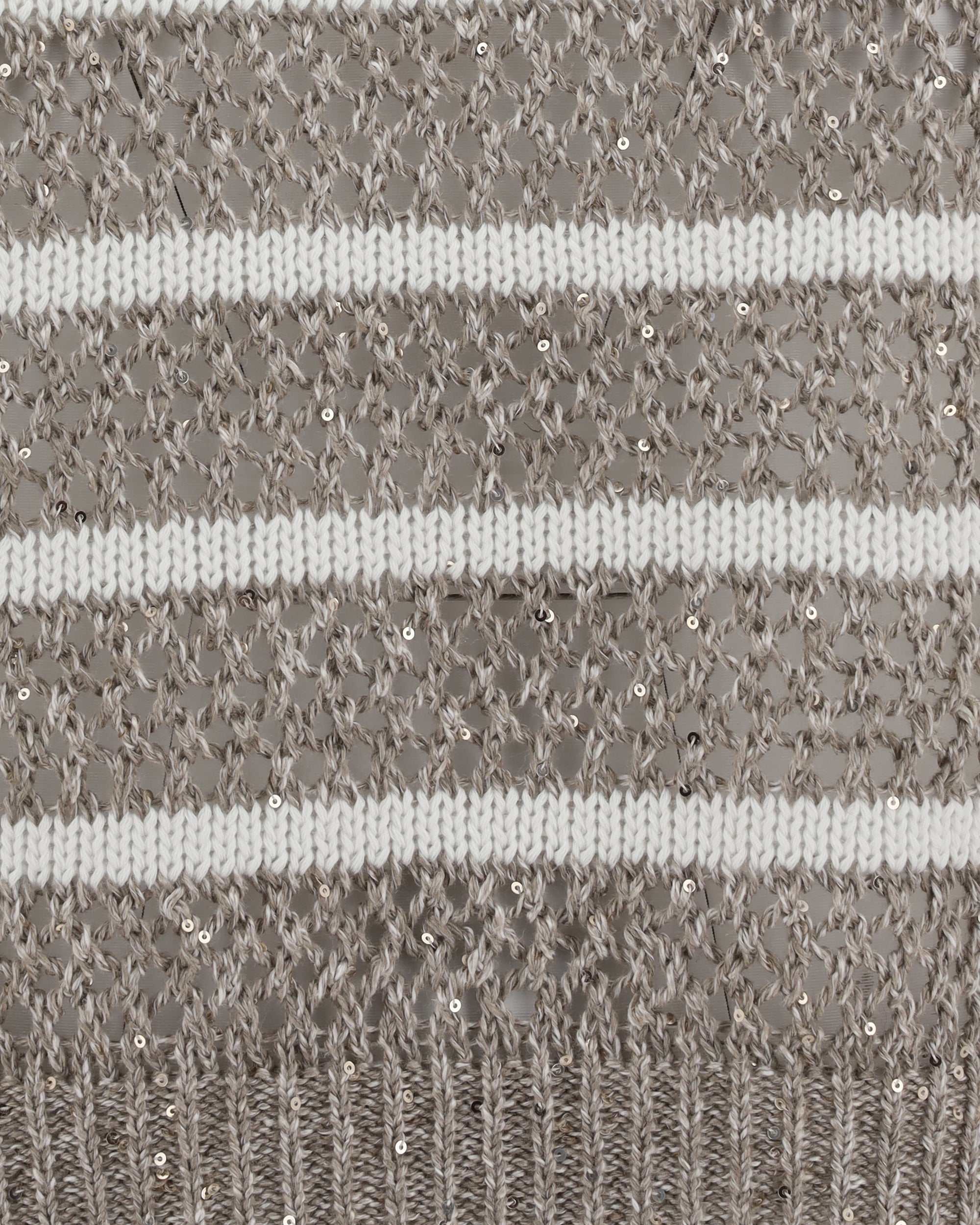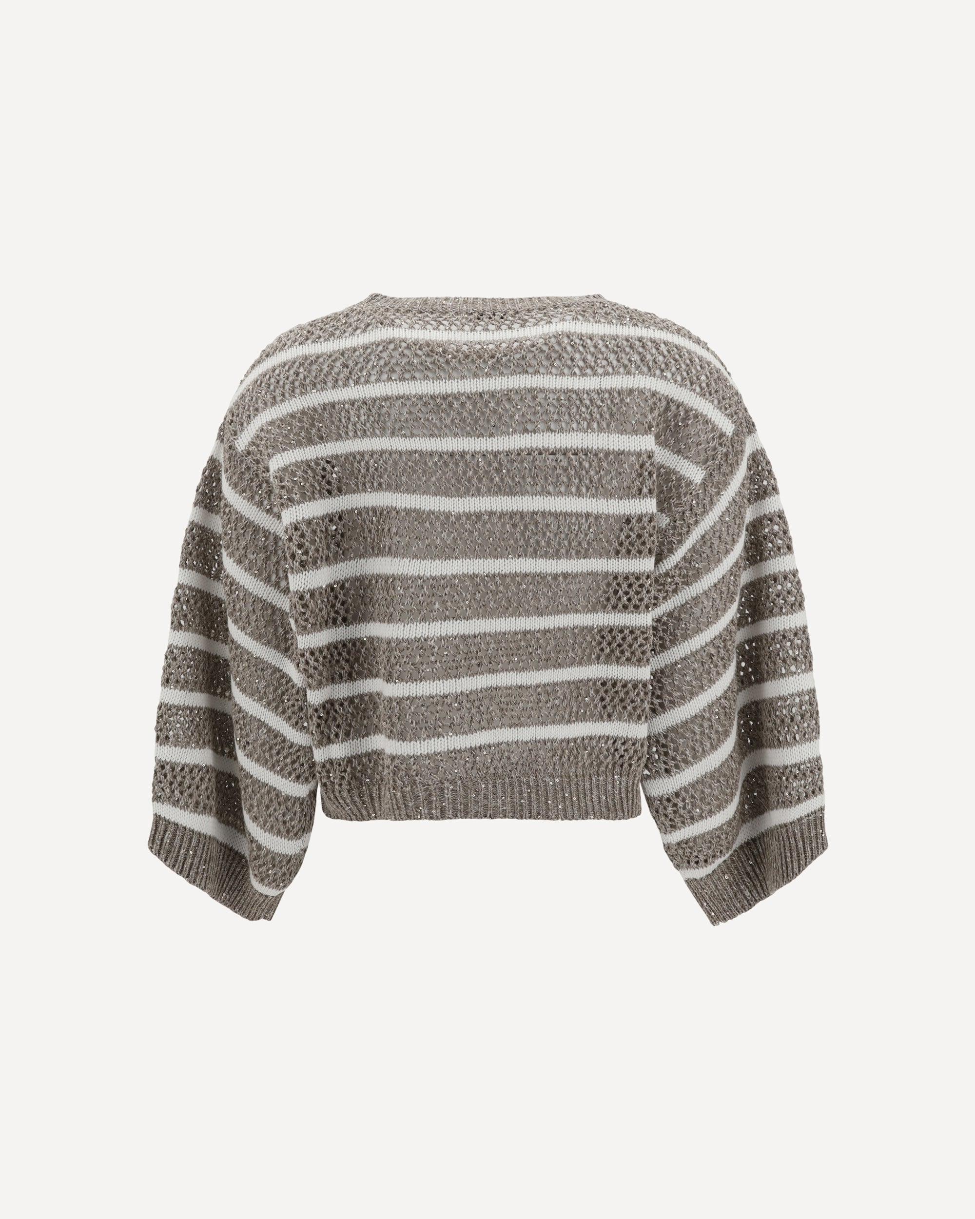 The linen Sweater by Brunello Cucinelli is an elegant and sophisticated piece, featuring a ribbed crew neck that adds a touch of refined simplicity. The openwork knit design with all-over shiny sequin details adds brightness and a touch of glamour. The wide three-quarter sleeves create a soft and fluid effect, while the ribbed cuffs and hem ensure a comfortable and well-defined fit. The loose fit gives the sweater a relaxed yet elegant look, making it ideal for sophisticated yet comfortable looks.