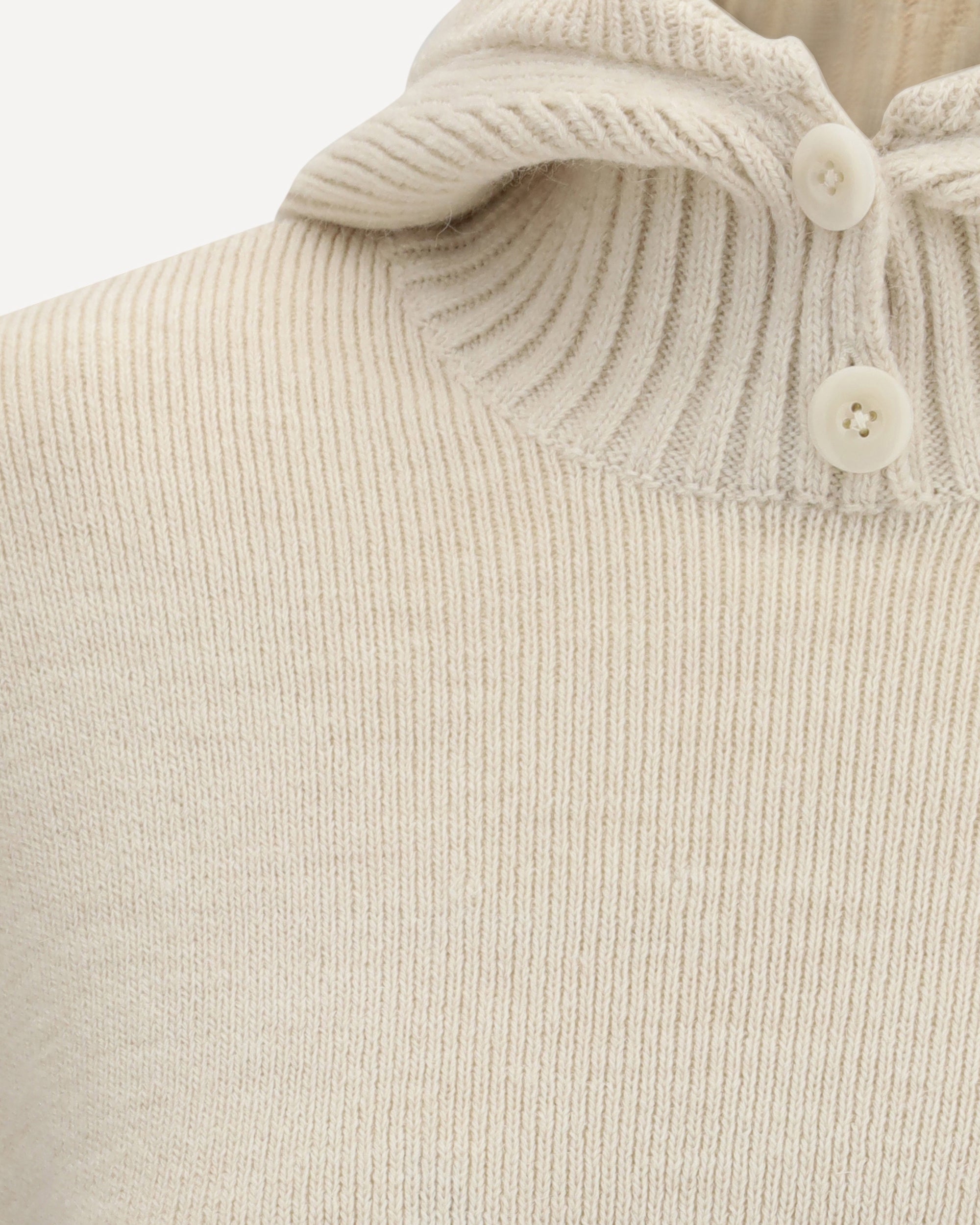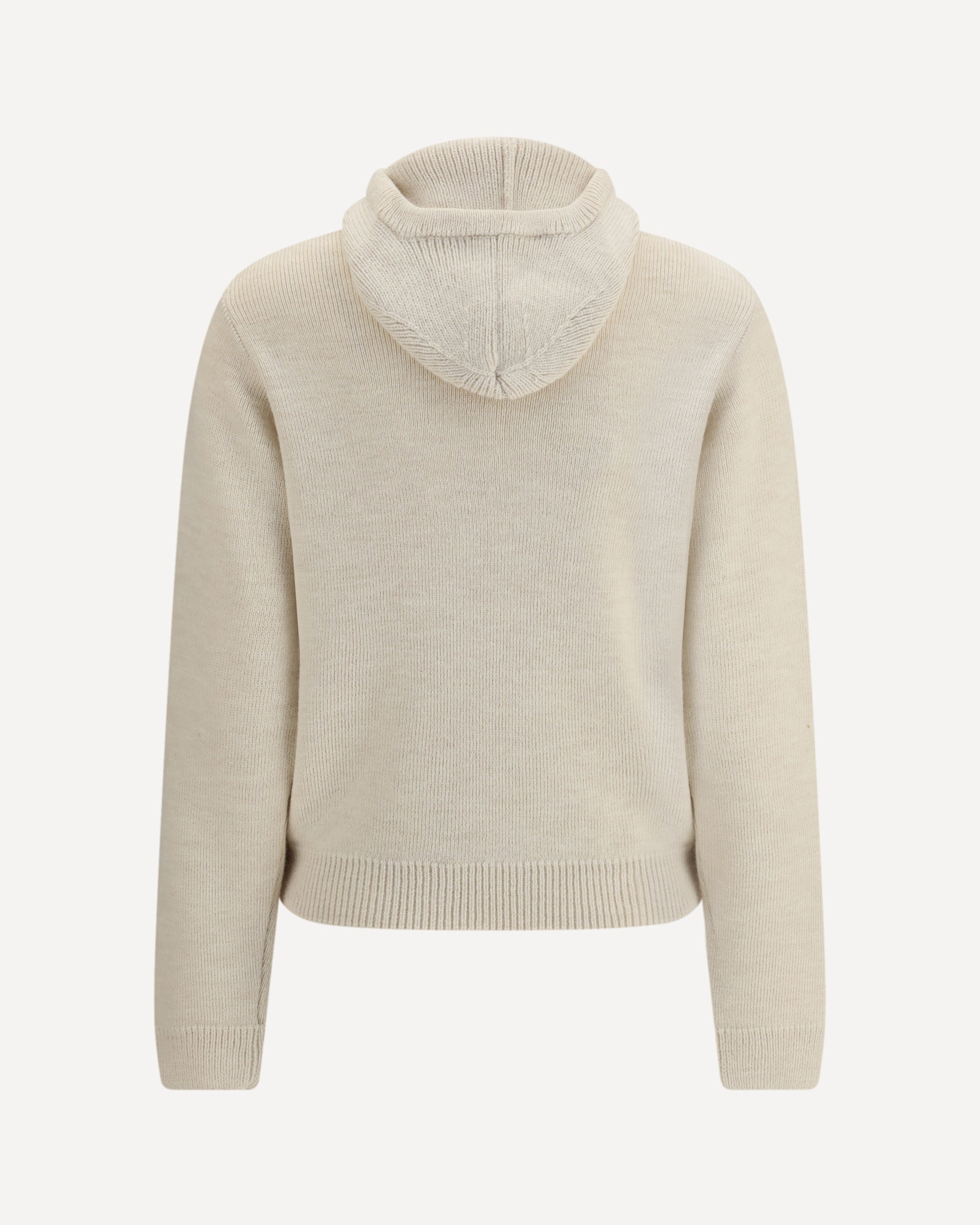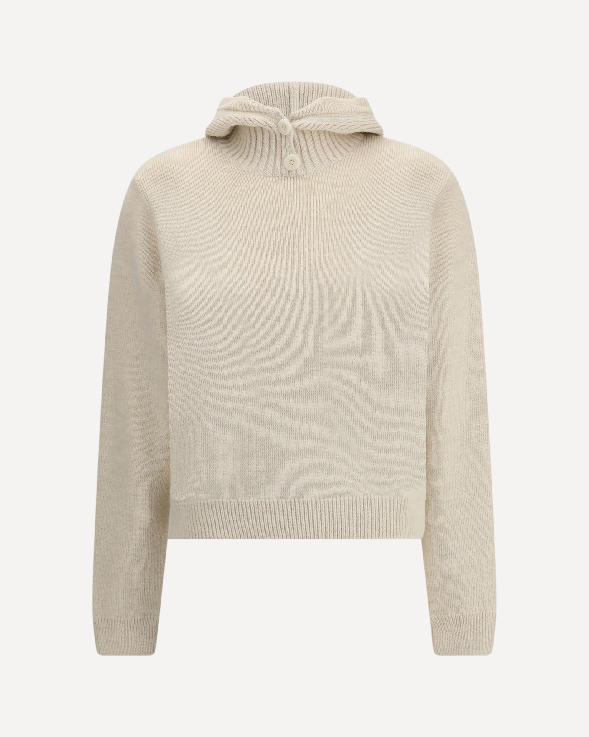The Hooded Sweater by Lemaire expresses the dialogue between comfort and refinement. Crafted from a wool and alpaca blend, it offers a soft, enveloping feel. The straight cut and buttoned front define a pure silhouette, while the ribbed hood adds structure and balance to a piece of quiet sophistication.