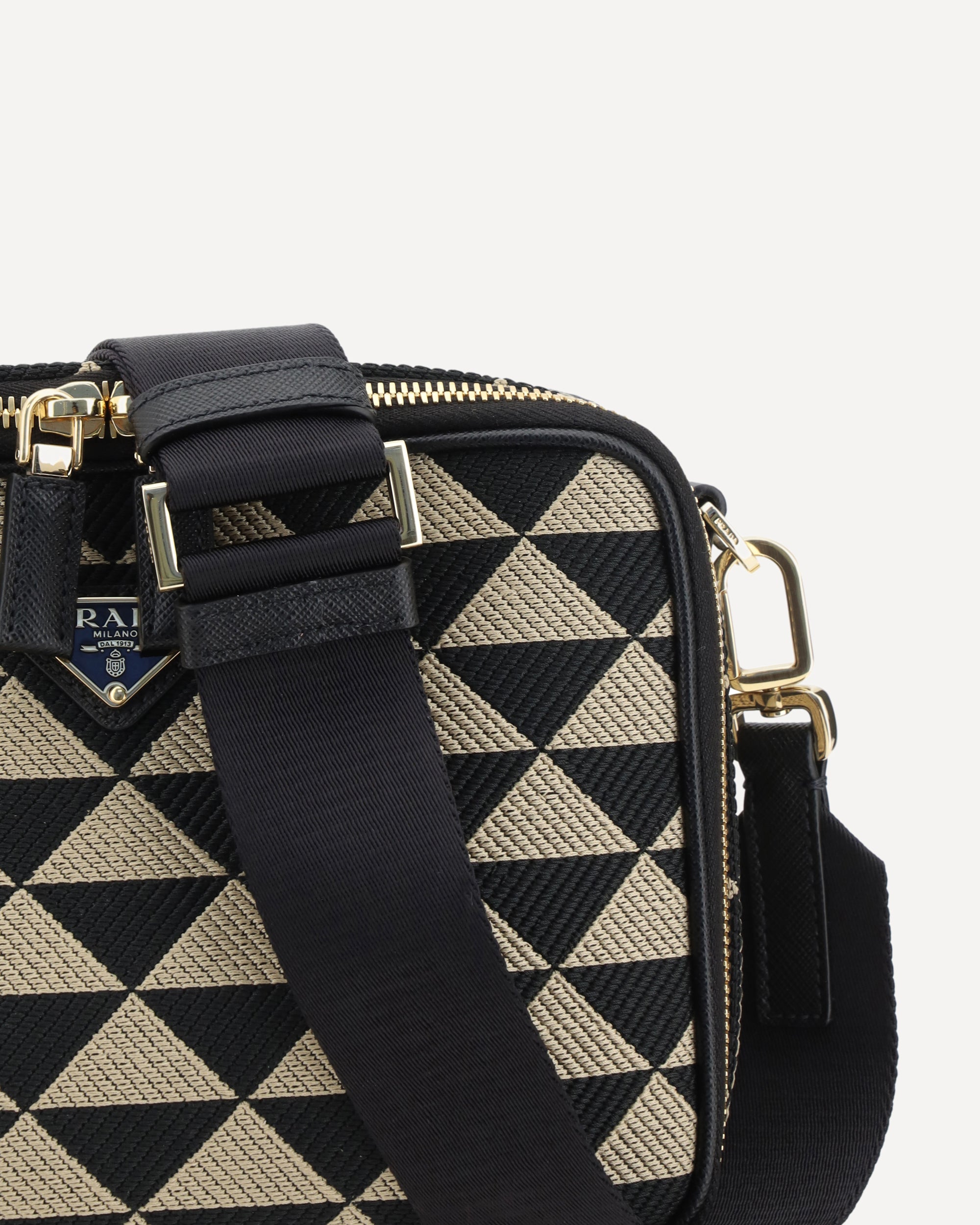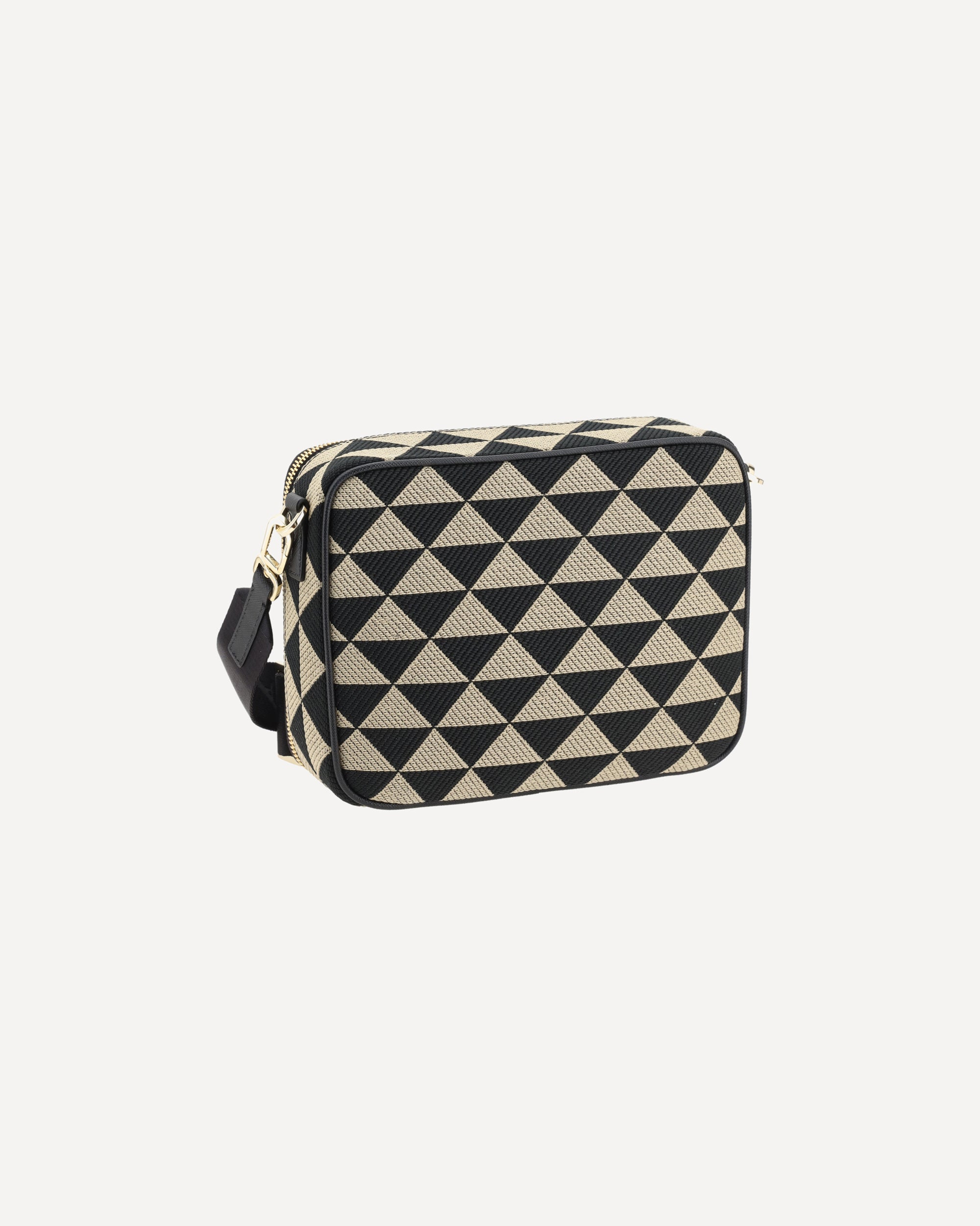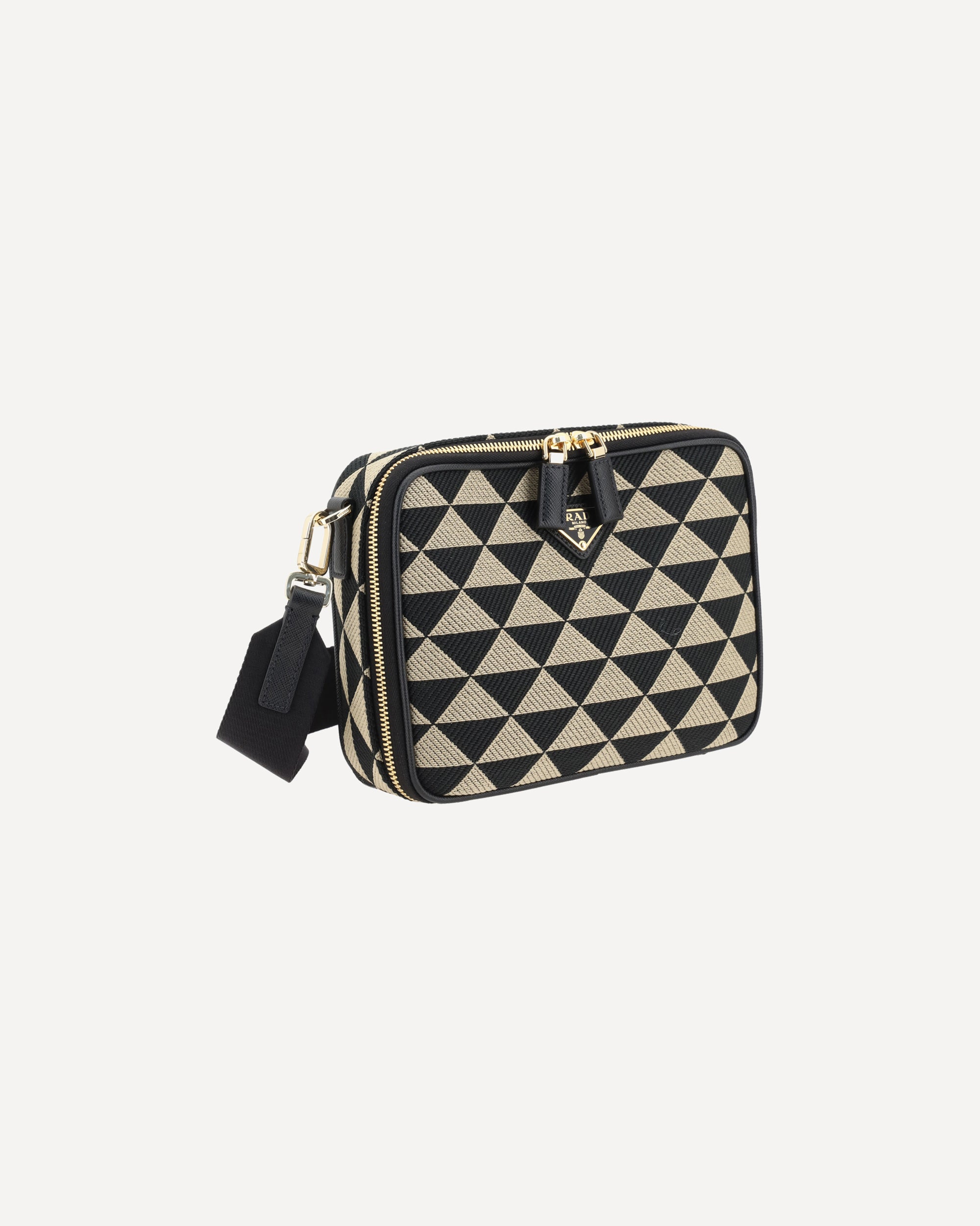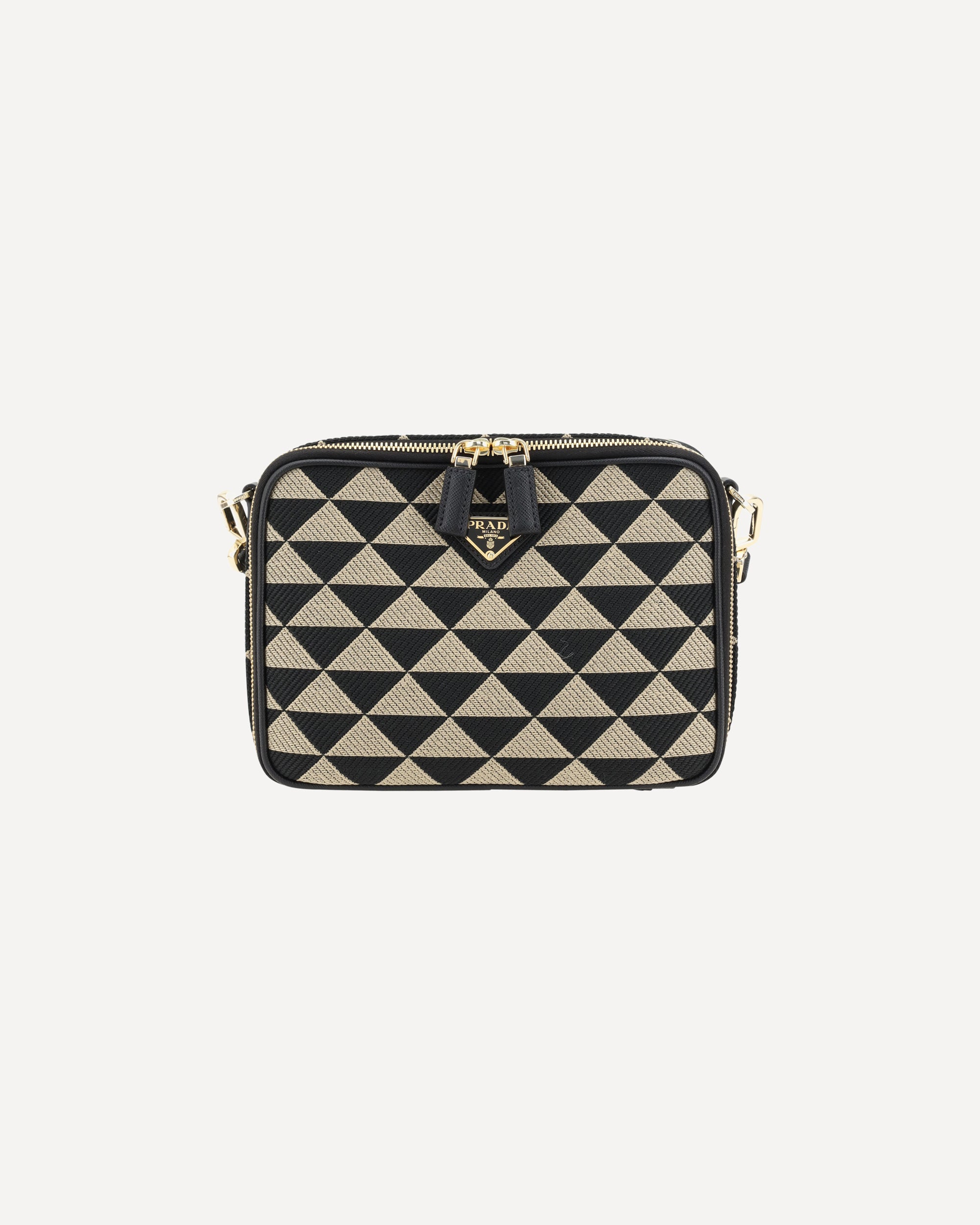 Prada's Symbole fabric Shoulder Bag is a modern and versatile accessory made of fine fabric. It features a top closure with a double-slider twist zipper, providing practicality and security. It has a single handle on top, perfect for carrying it by hand, and an adjustable and removable webbing shoulder strap, allowing you to adjust it to your style and comfort. On the front, the iconic triangular enameled plaque with the brand's logo stands out, a distinctive detail that adds elegance. Inside, the bag features an internal welt pocket and single internal compartment, ideal for keeping everything in order.
