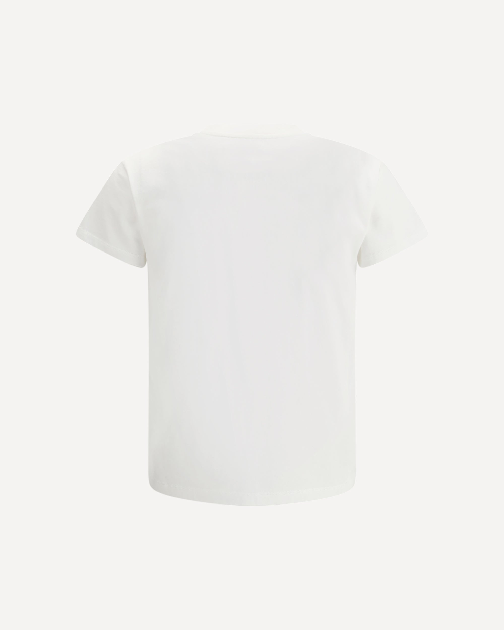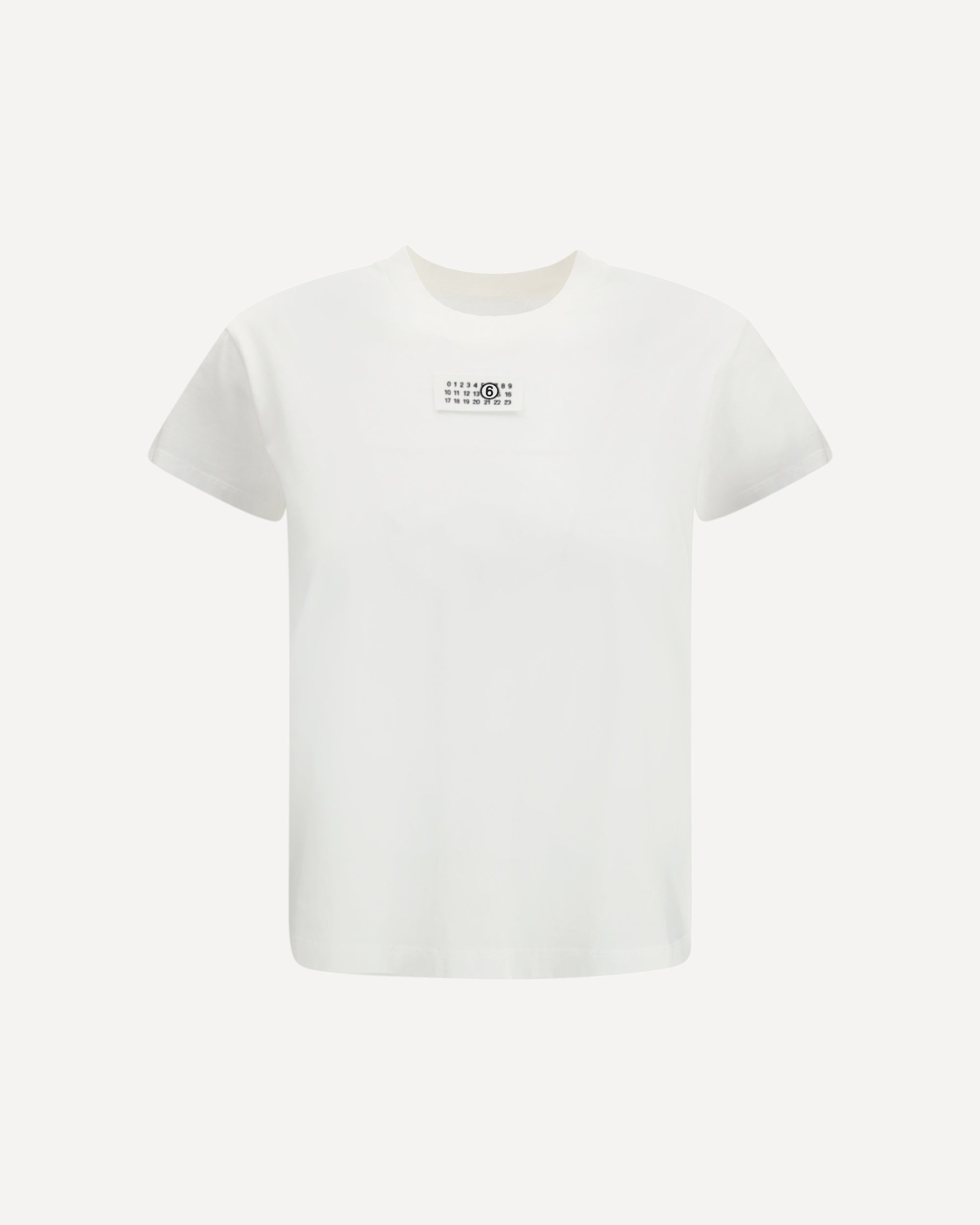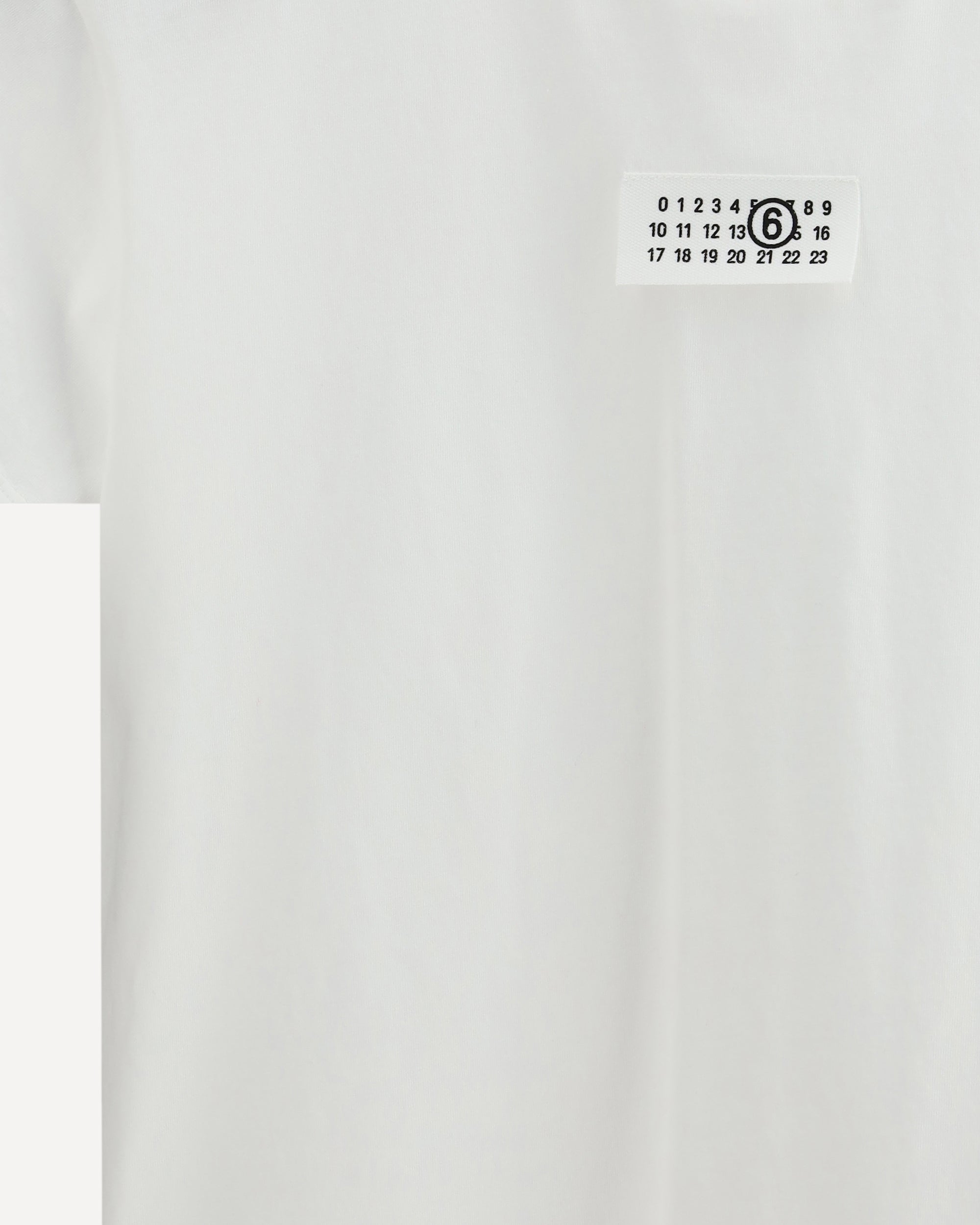 The cotton T-shirt by MM6 stands out for its essential yet refined style. Made of soft cotton, it features a ribbed crew neck that adds a touch of texture and structure to the garment. The minimalist design is enhanced by the logo patch sewn on the front, an iconic detail that expresses the brand's contemporary and recognizable aesthetic. Versatile and comfortable, this T-shirt is perfect for completing casual looks with an accent of understated elegance.