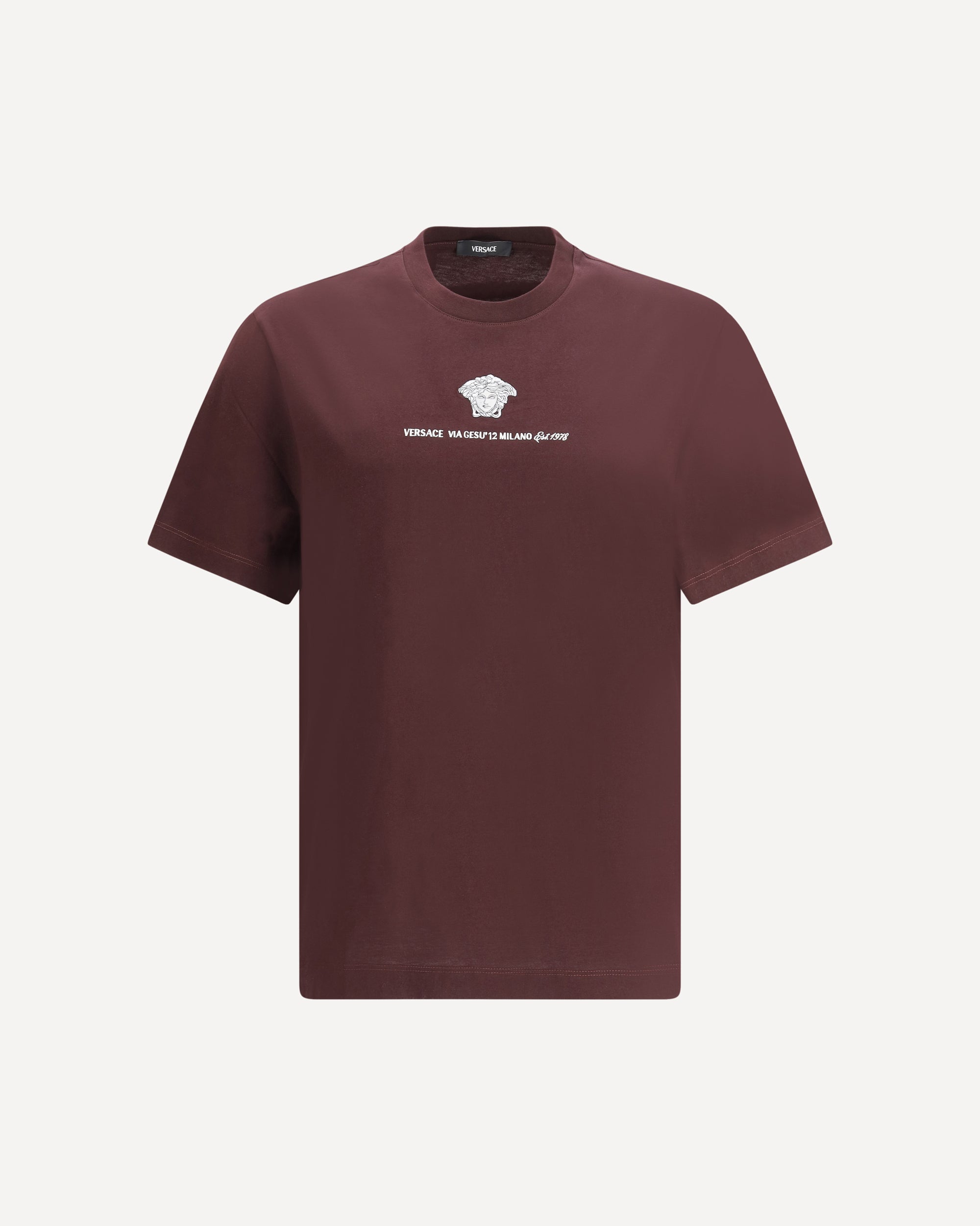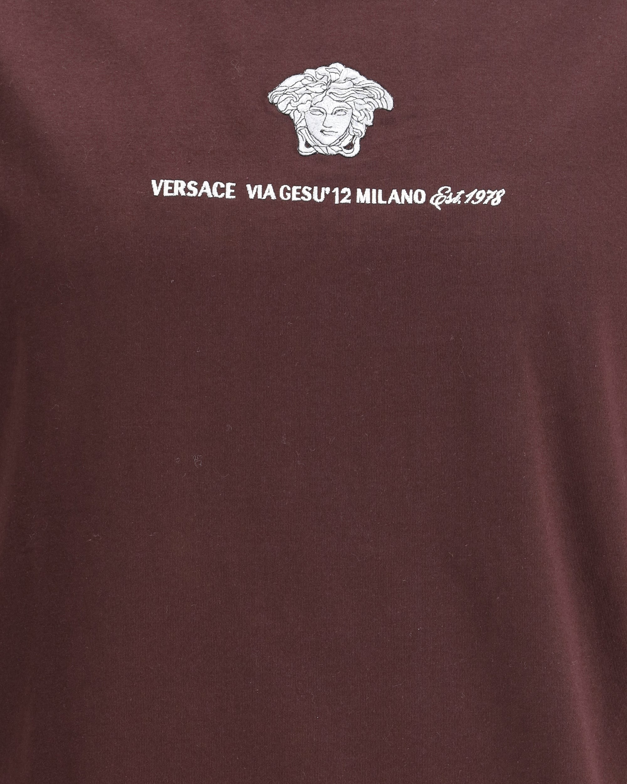 Cotton T-Shirt by Versace, ribbed crew neck, contrasting iconic brand monogram on front, monochrome pattern, regular fit.