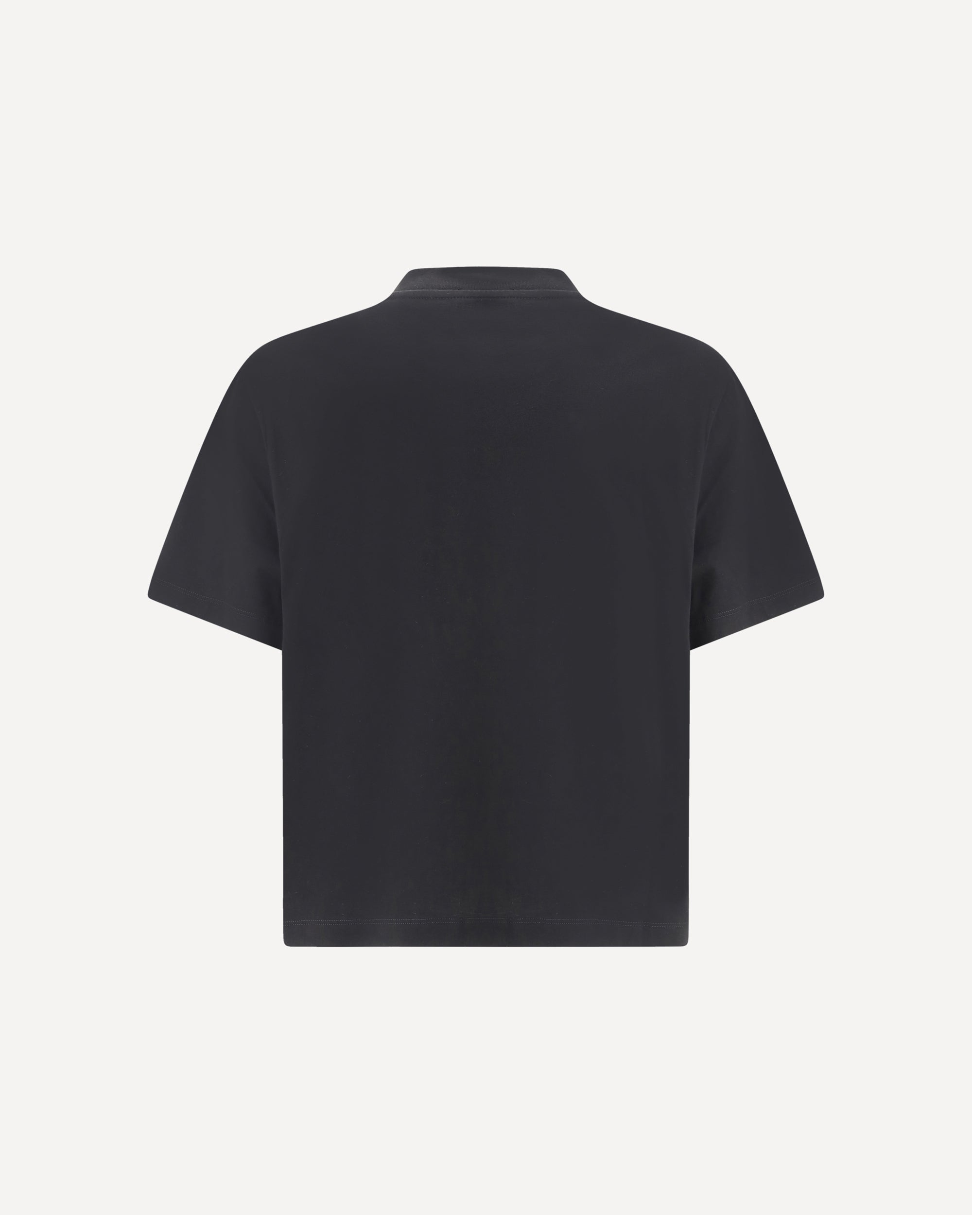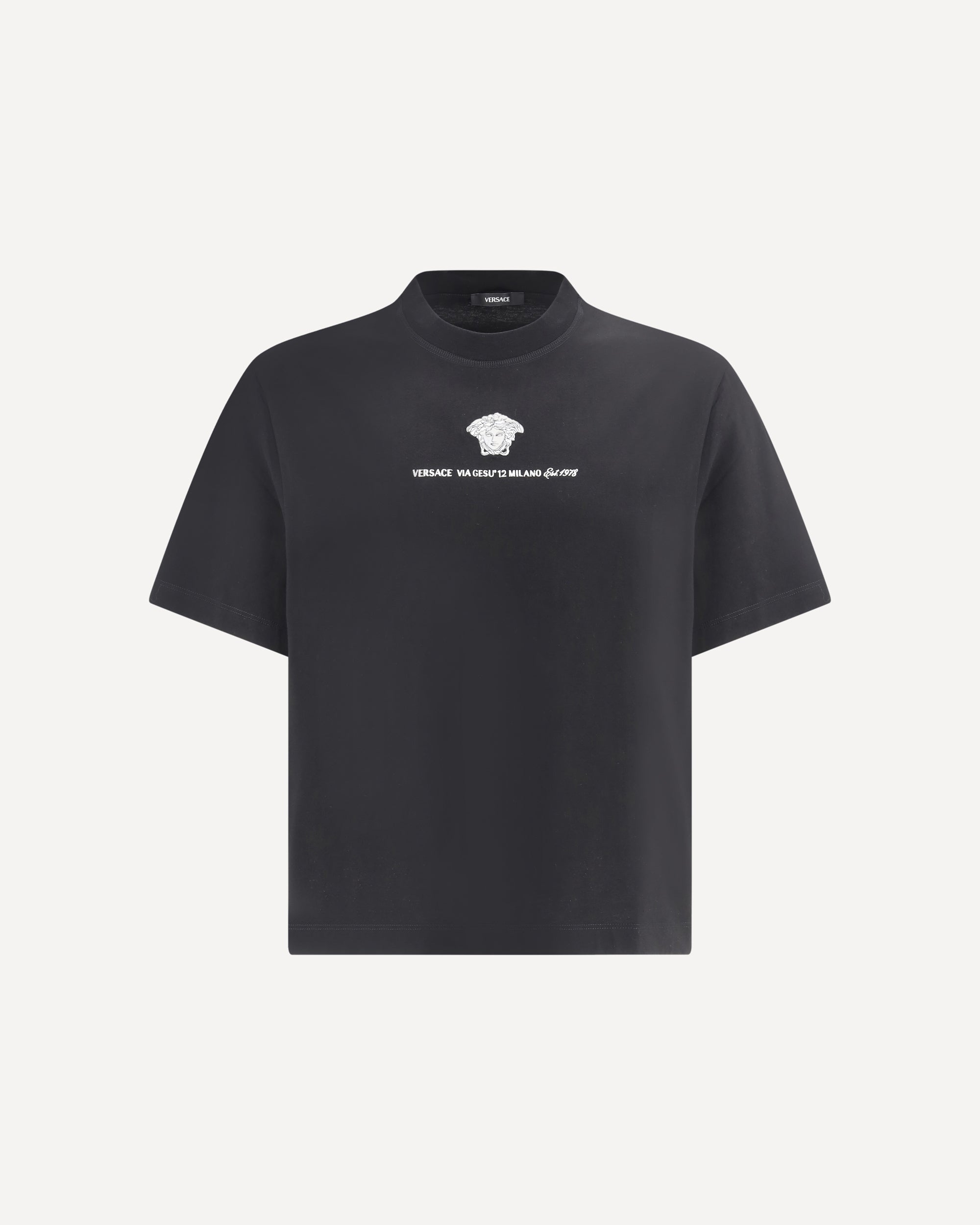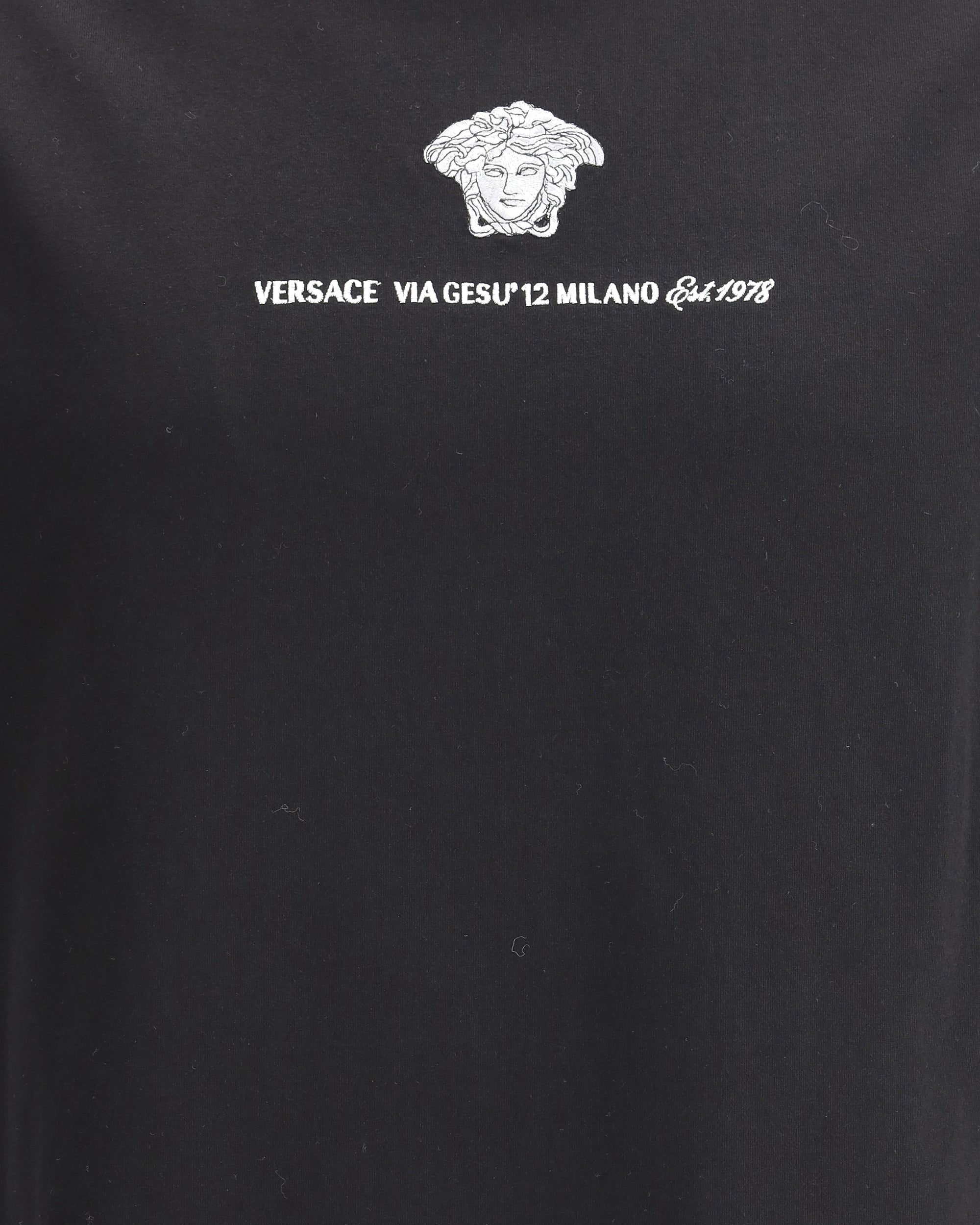 Cotton T-Shirt by Versace, ribbed crew neck, contrasting iconic brand monogram on front, monochrome pattern, regular fit.