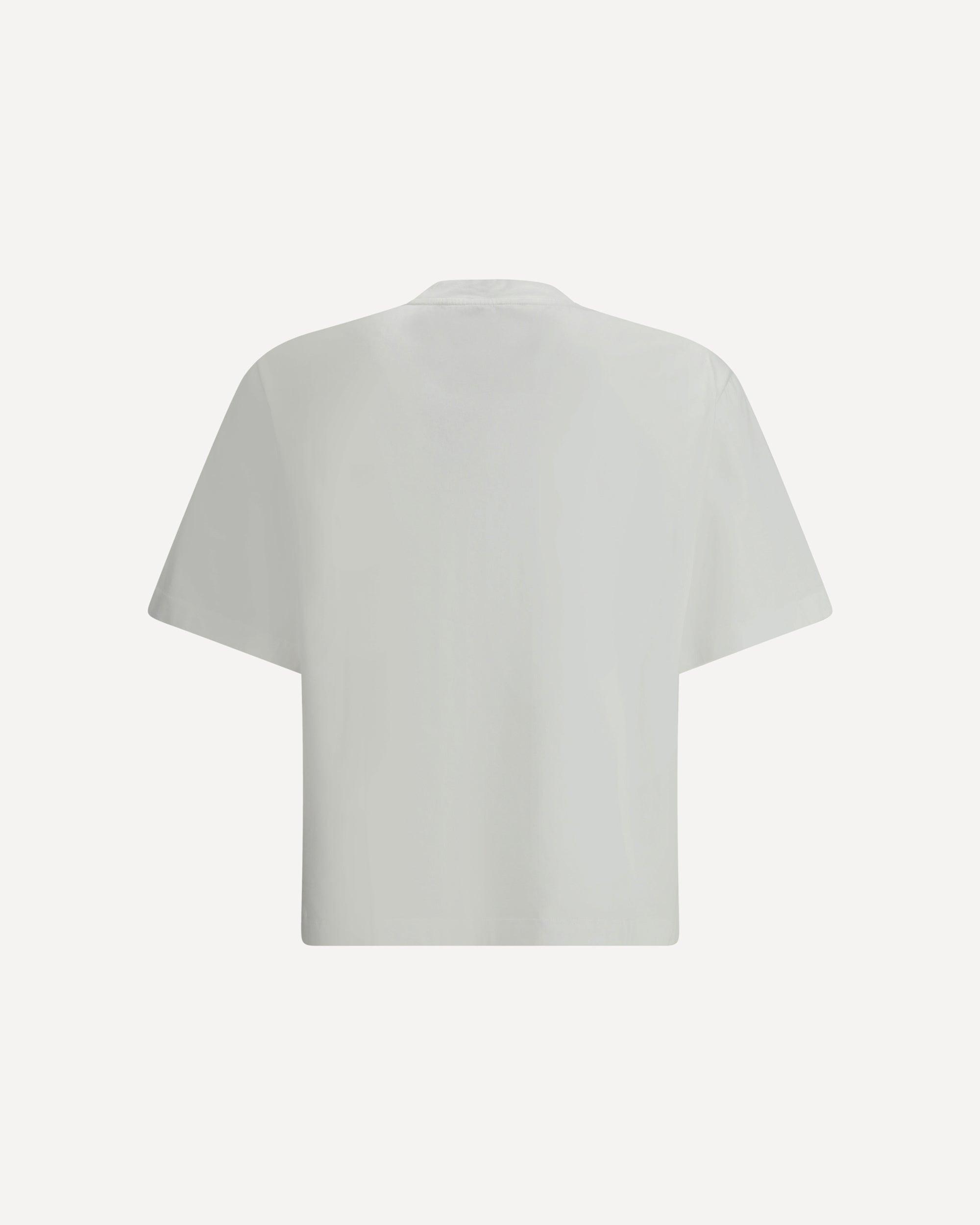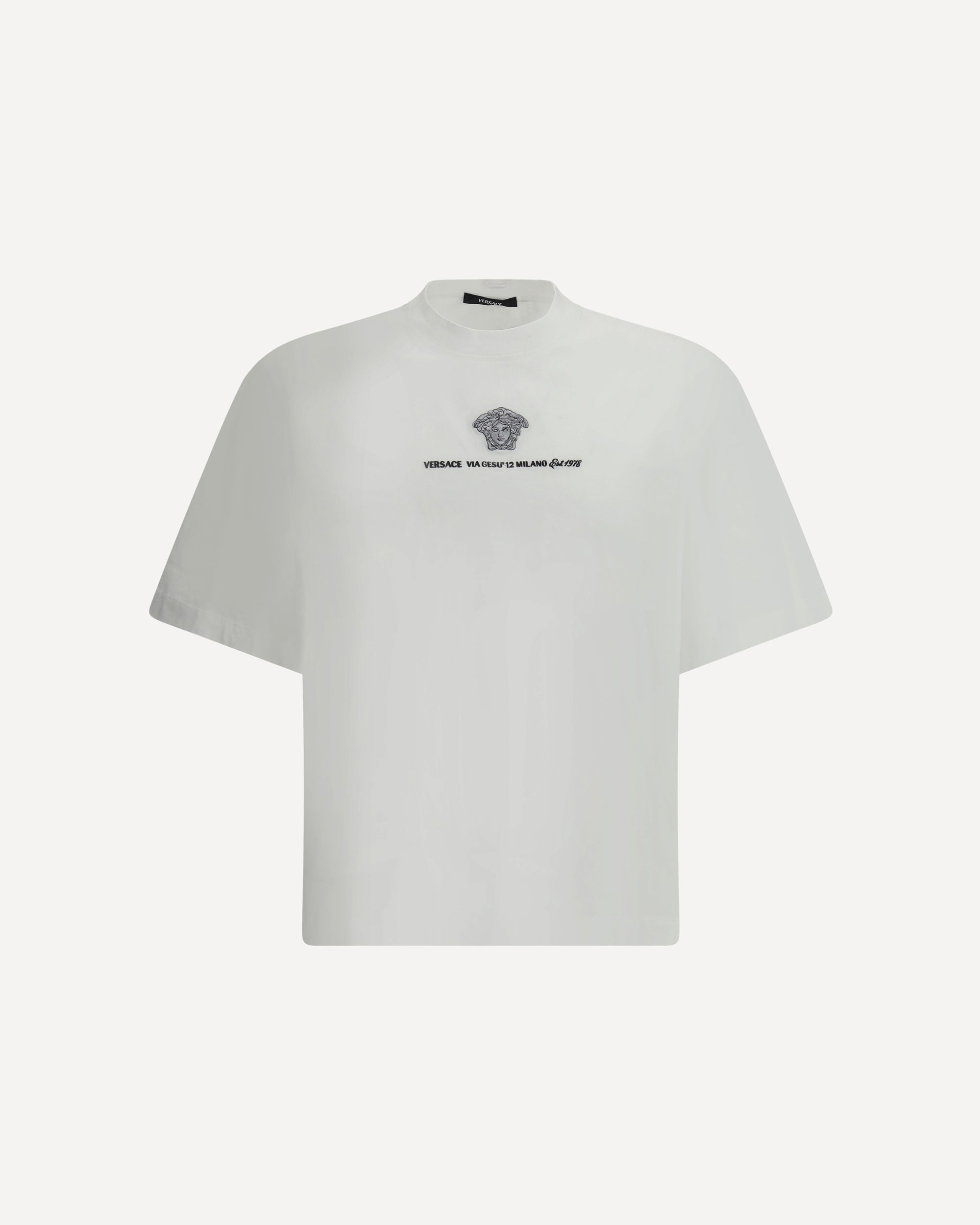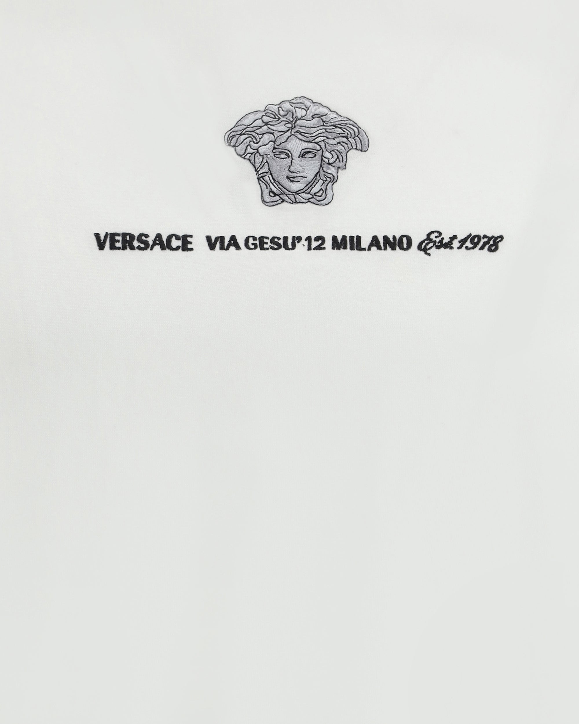 Cotton T-Shirt by Versace, ribbed crew neck, contrasting iconic brand monogram on front, monochrome pattern, regular fit.