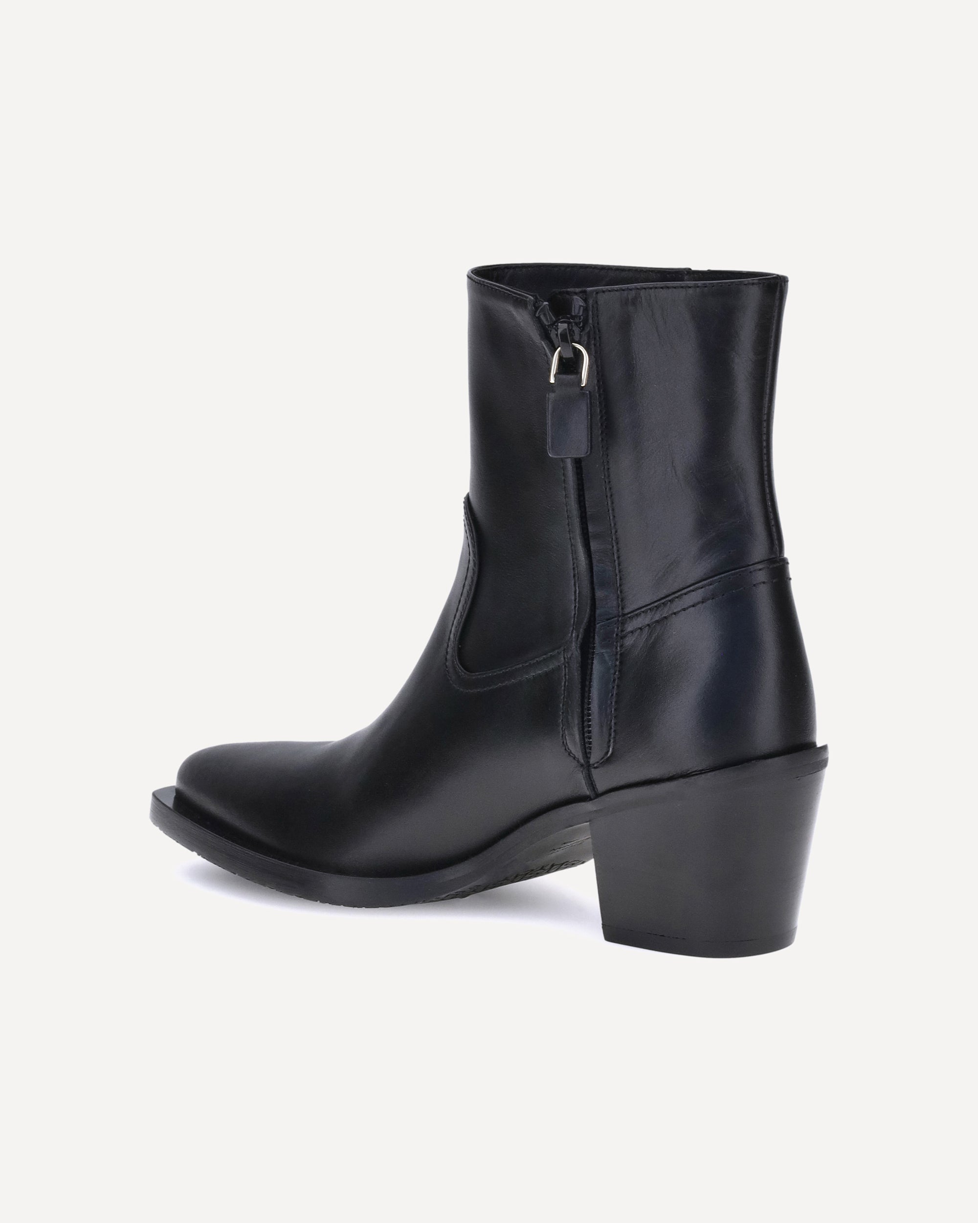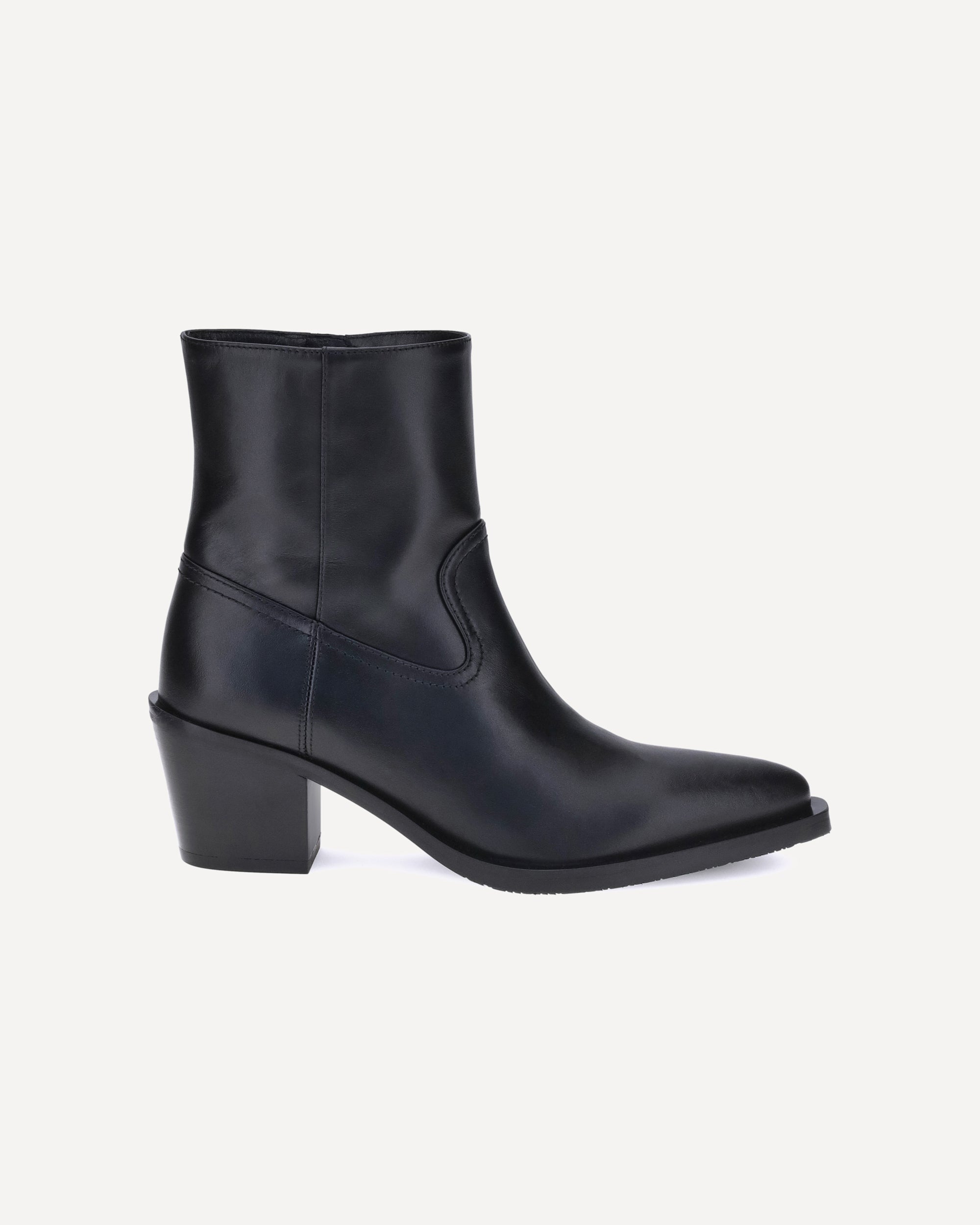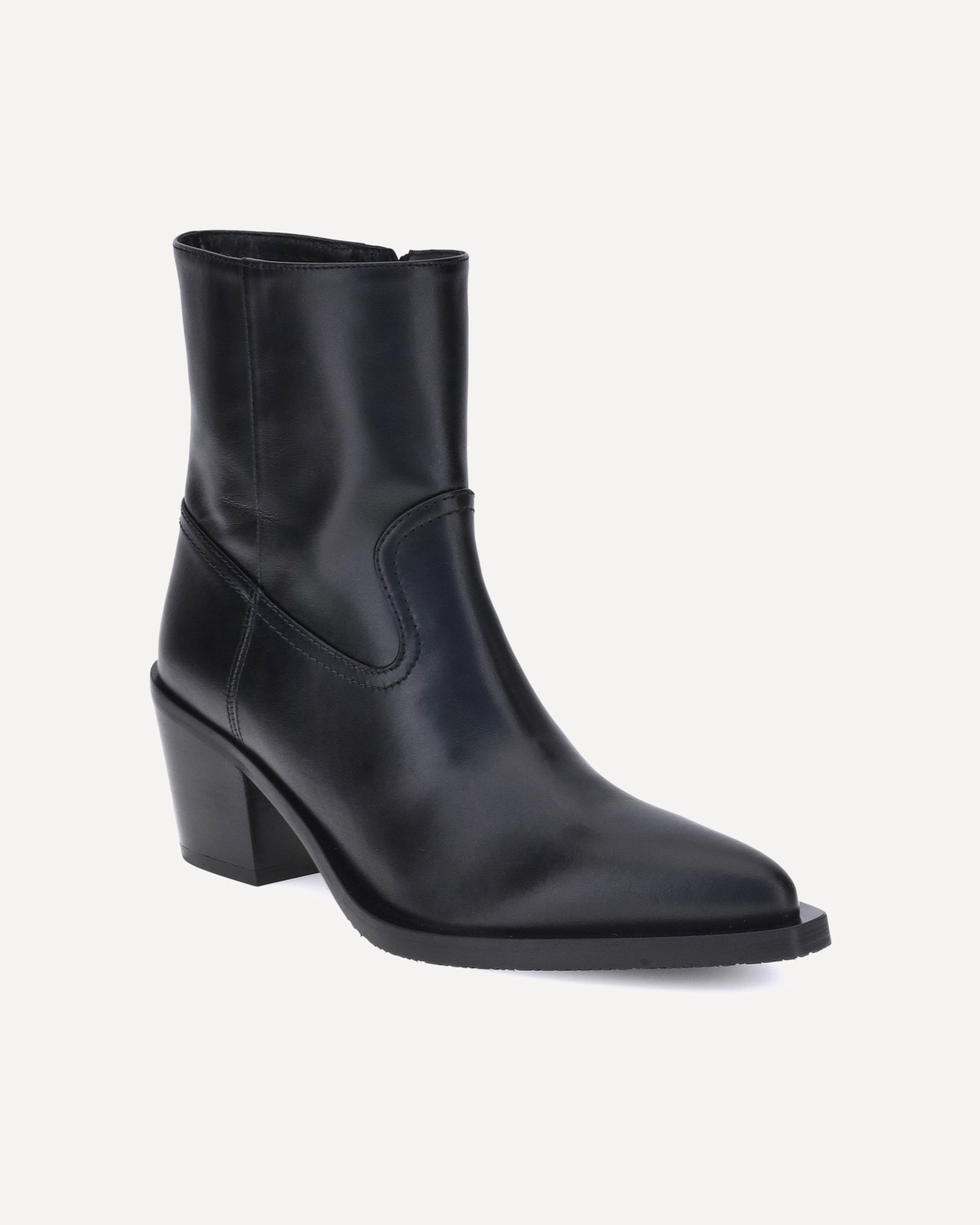 Stuart Weitzman's Tate Ankle Boots revisit the Texan style with a modern twist, featuring a pointed silhouette and a comfortable block heel. The side zipper closure ensures a practical fit, while the ankle height makes them versatile and easy to pair with casual or more sophisticated looks.