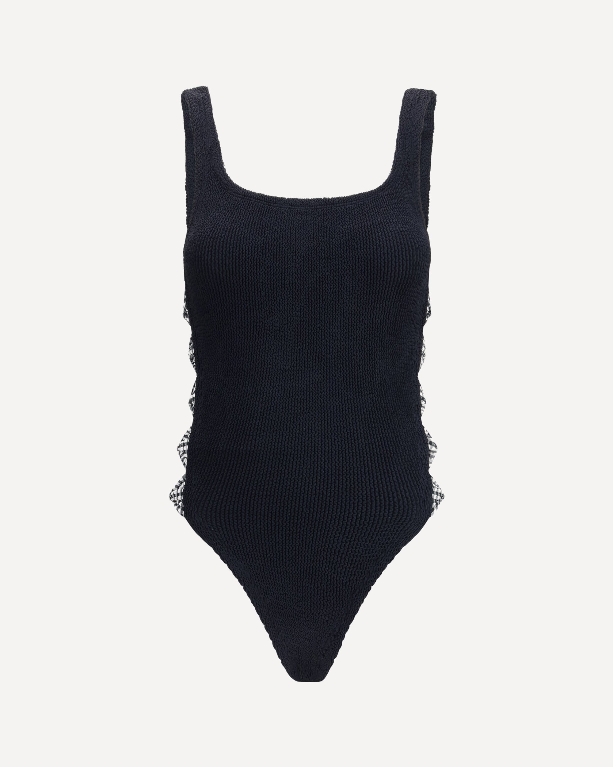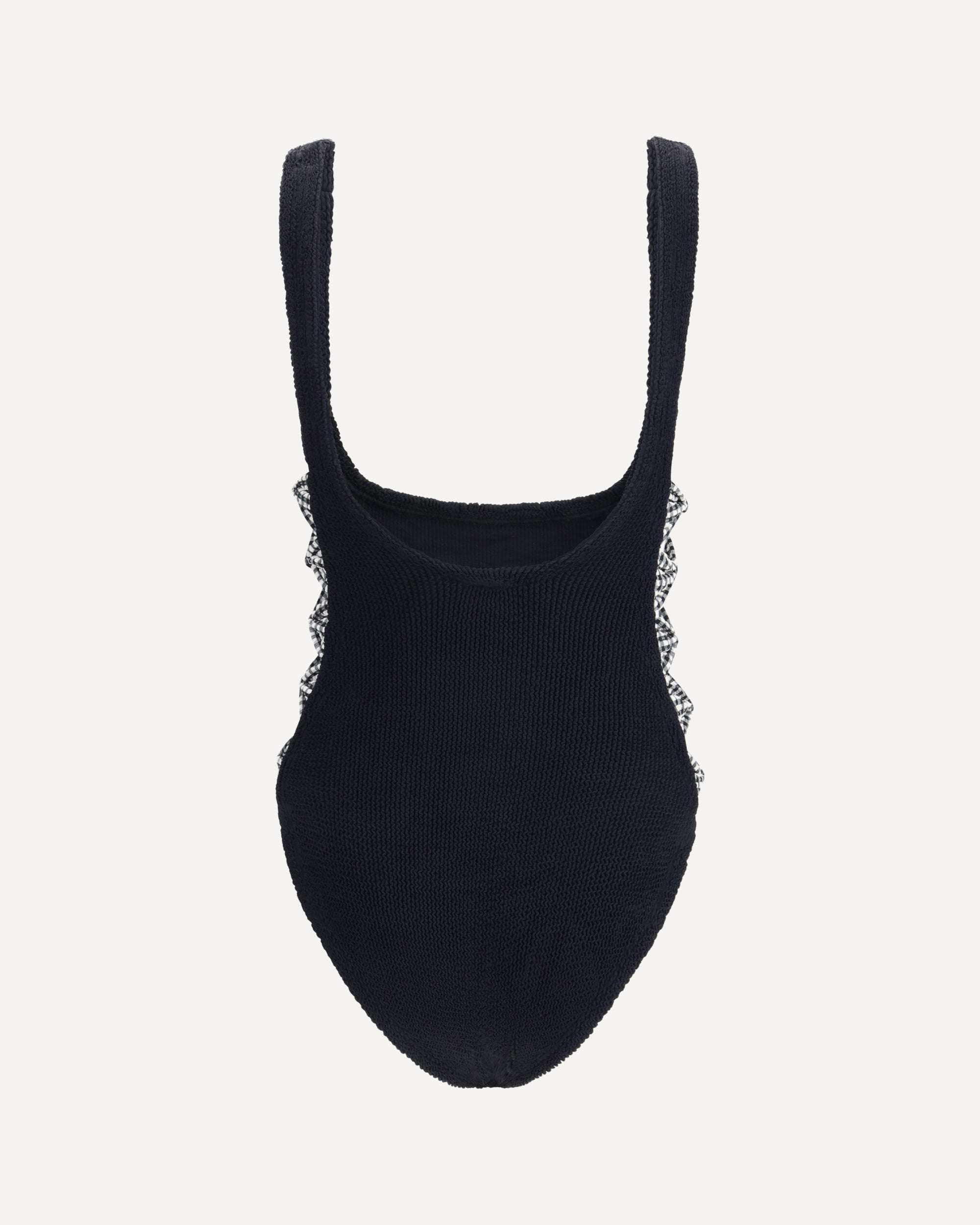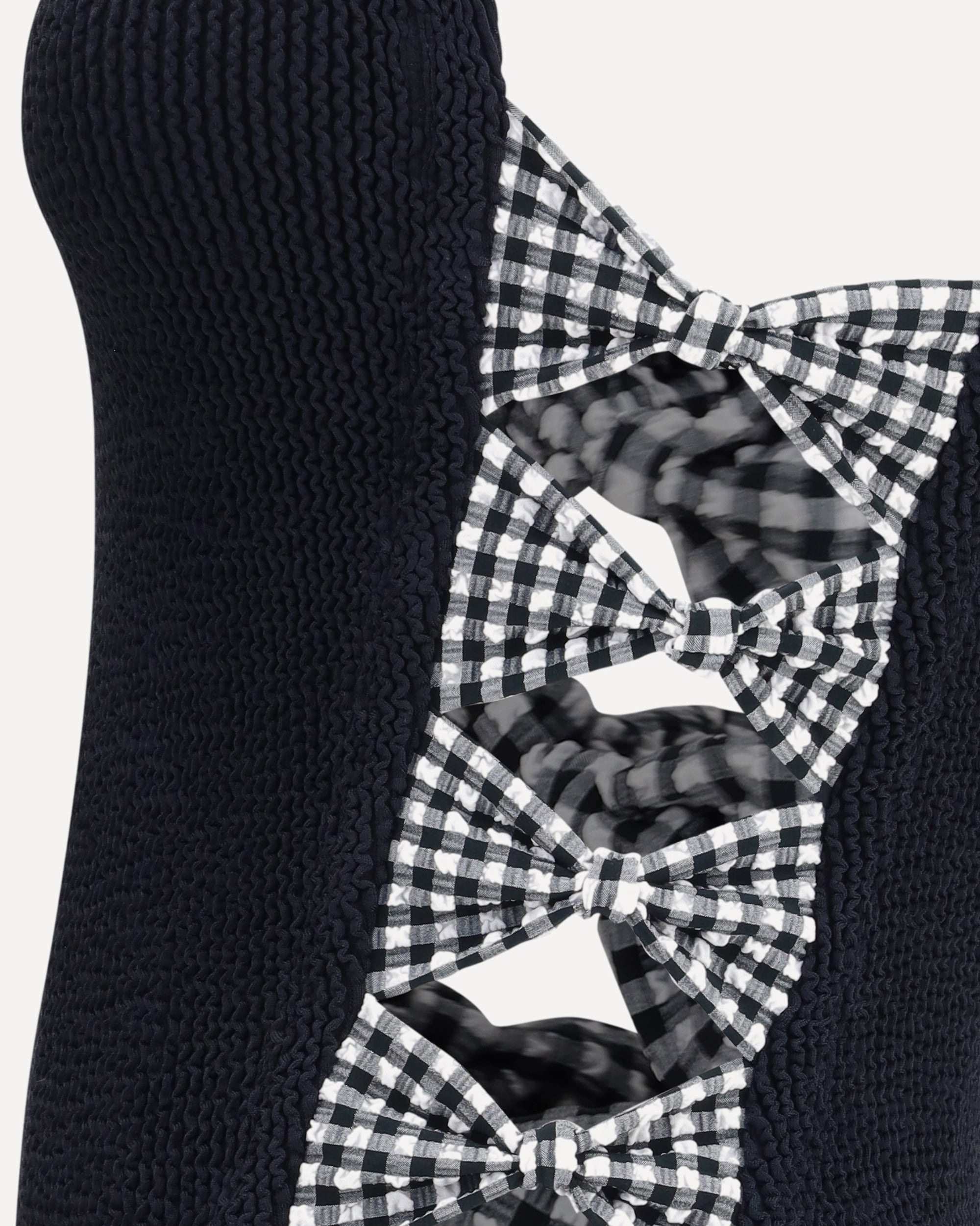 The Tiffany One-Piece Swimsuit by Hunza G combines elegance and comfort in a sporty design with a strong character. Featuring tone-on-tone straps and crossed cut-out details on the side panels, it is enriched by contrasting bows that add a sophisticated and dynamic touch. Made in the exclusive Original Crinkle fabric, it adapts perfectly to every body shape thanks to its ability to stretch, sculpt and support the shapes, ensuring a unique and versatile fit.