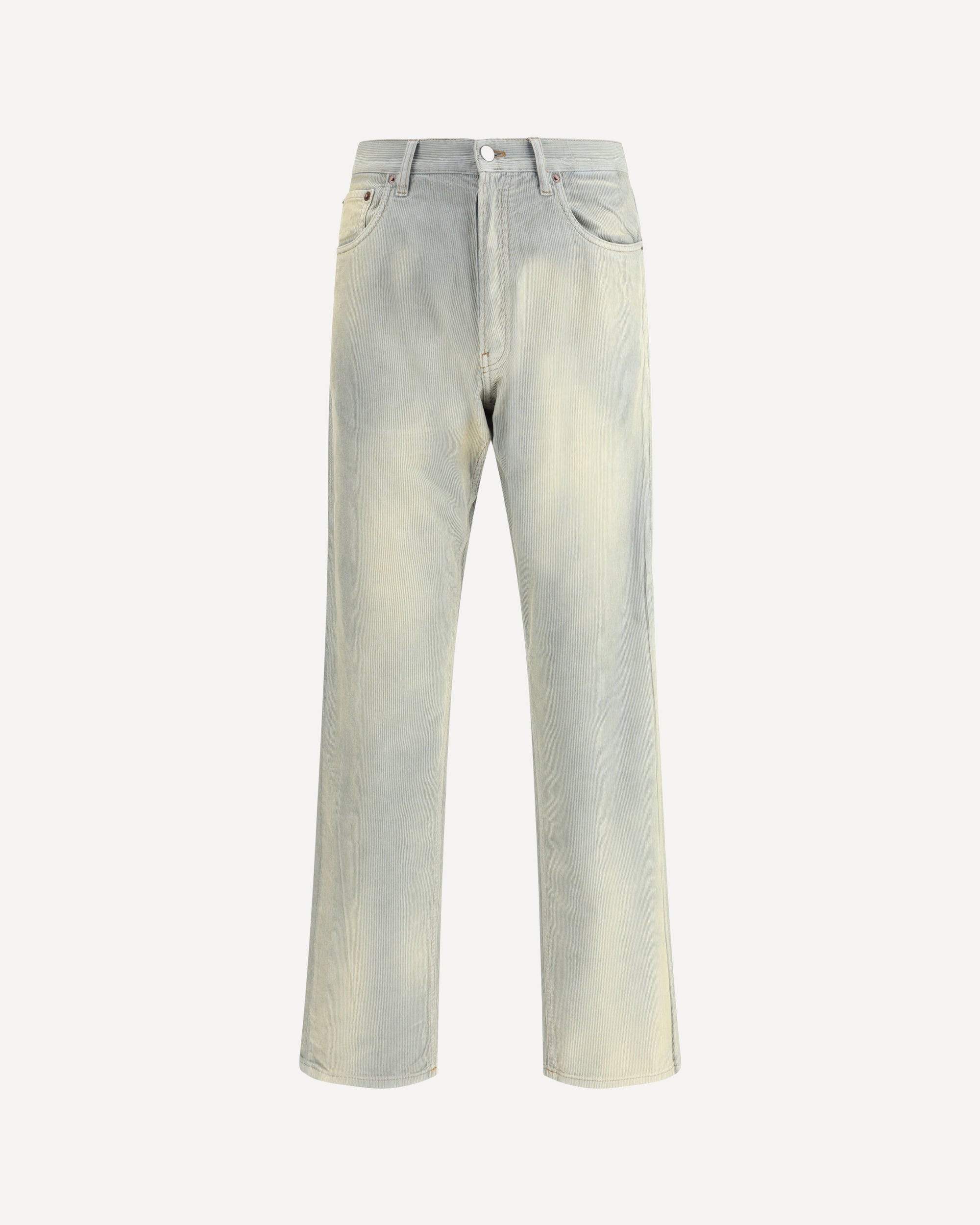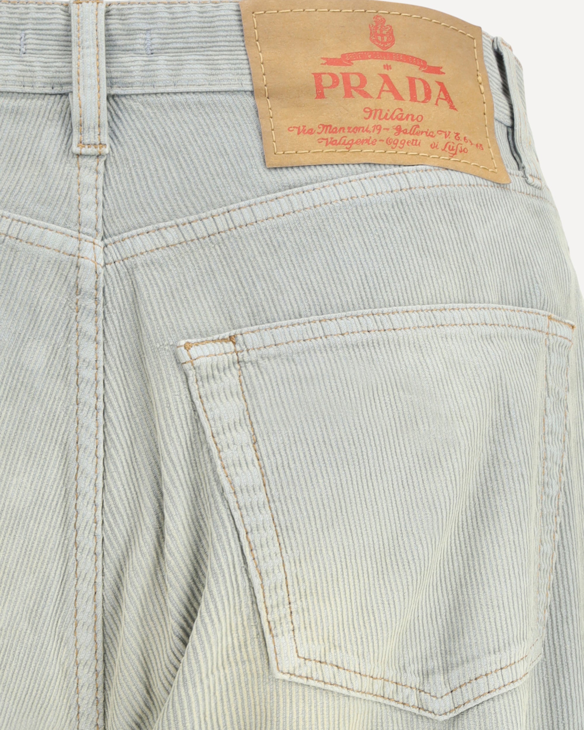 Five-pocket Pants in cotton with a corduroy effect by Prada. The model features a front button fastening, belt loops at the waist and a logo patch applied on the back. The faded finish design gives the garment a lived-in and contemporary character, perfect for casual looks with a sophisticated touch.