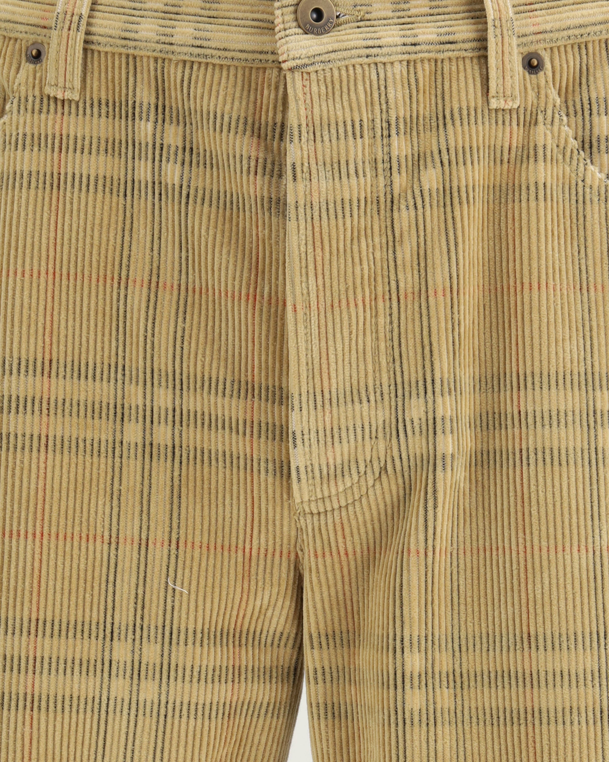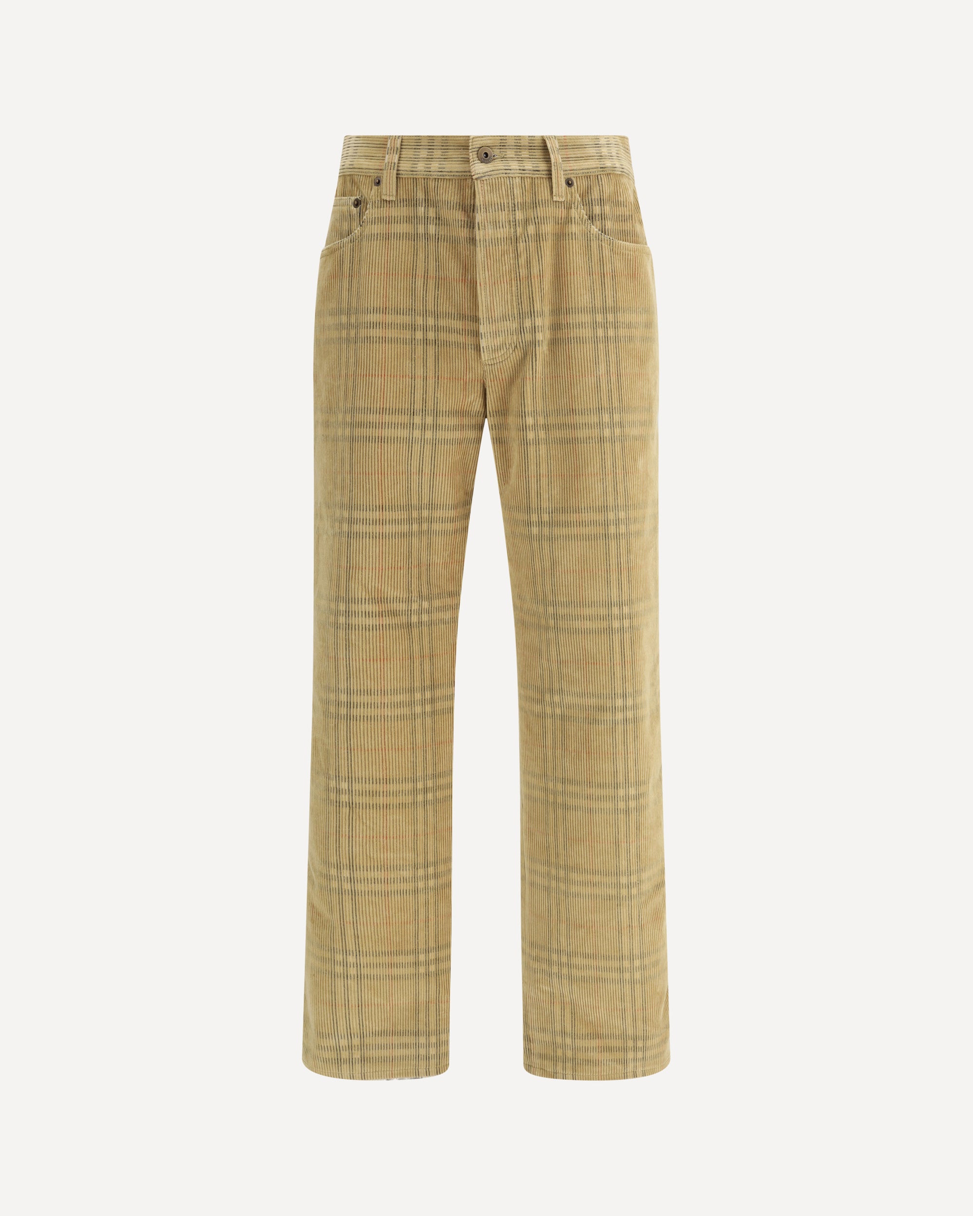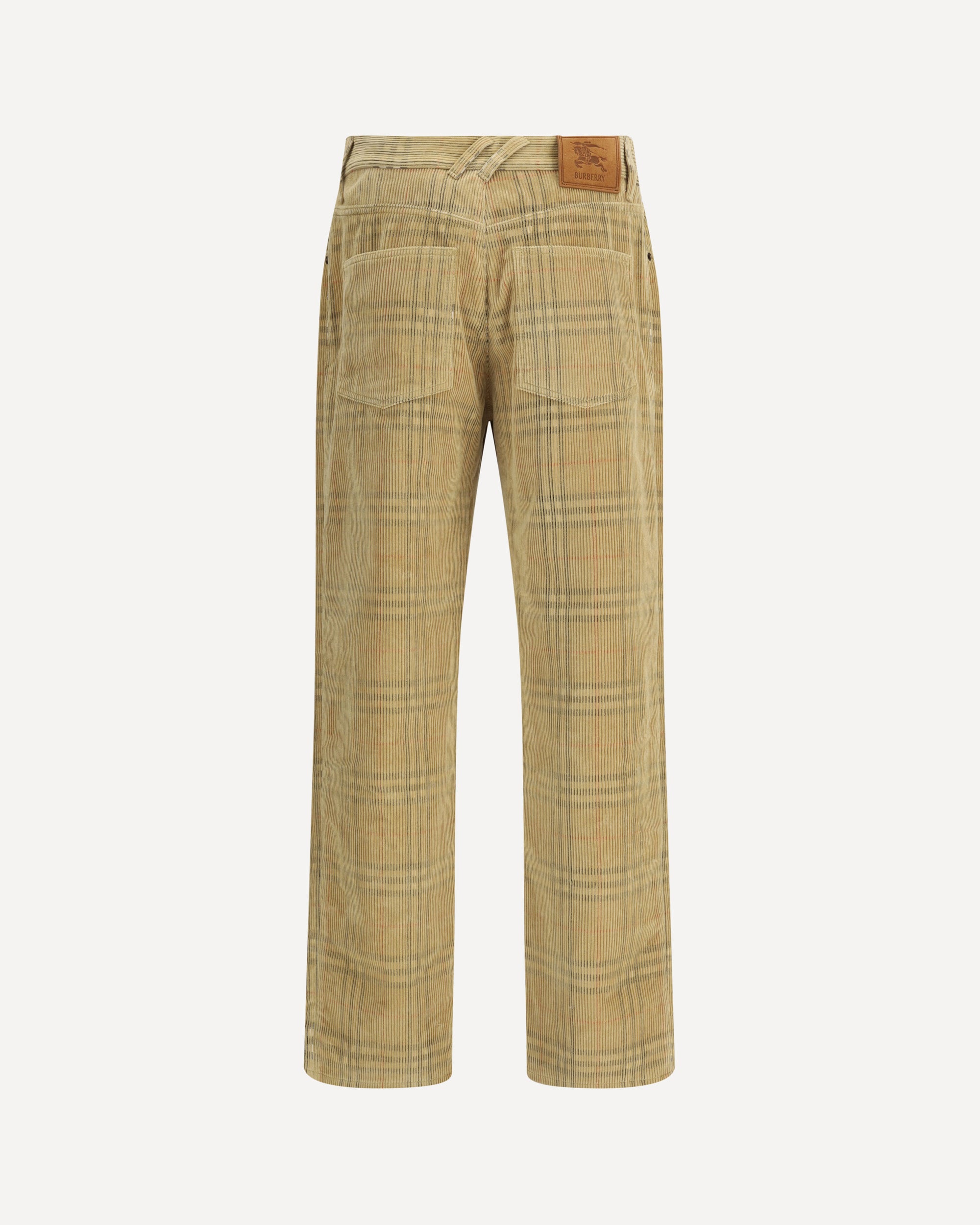 Burberry cotton Pants with a velvet ribbed design, embellished with the iconic Archivio Check motif. Five-pocket model, front button fastening and belt loops at the waist. The garment is completed by a logo leather patch applied on the back, a distinctive detail of the brand.