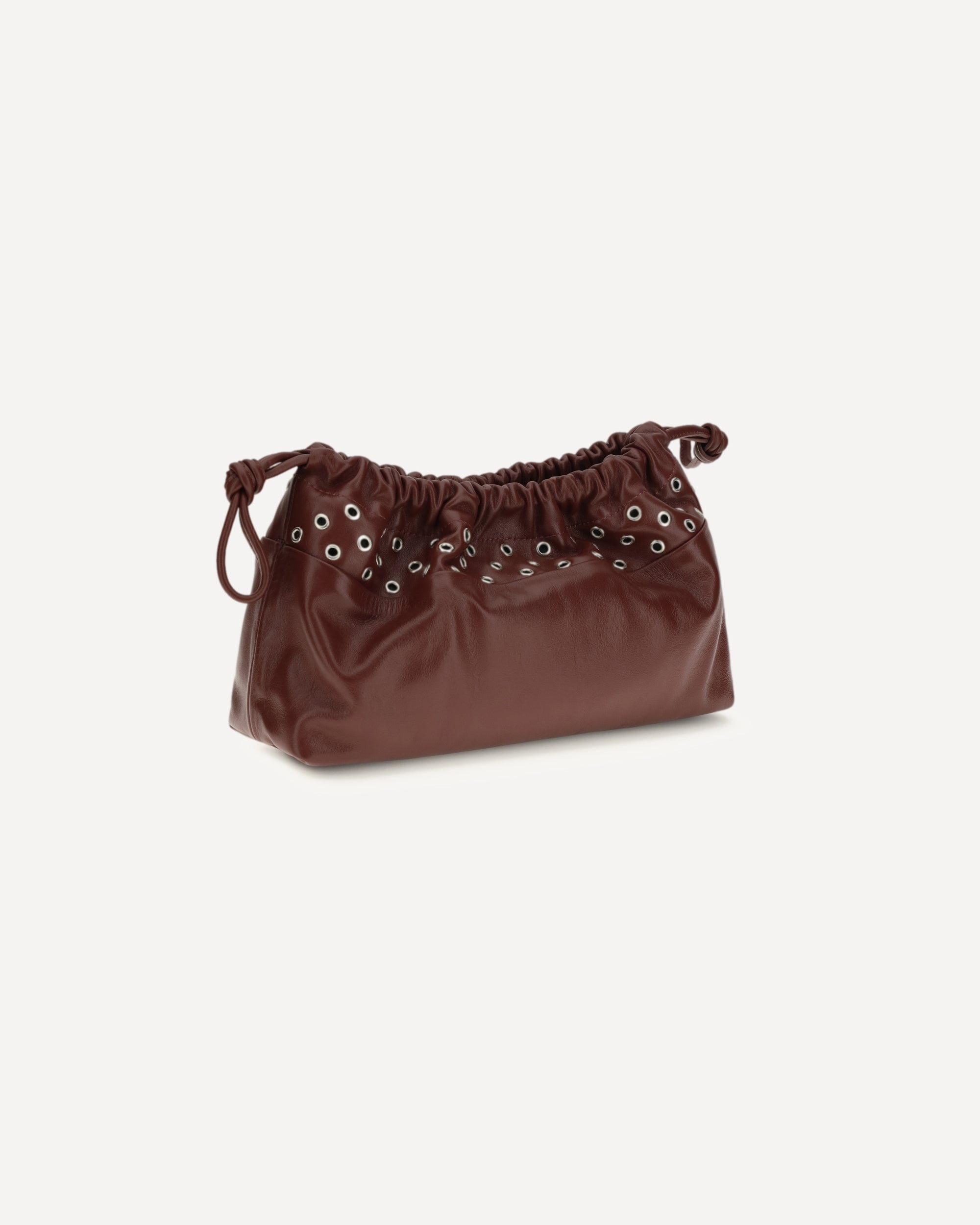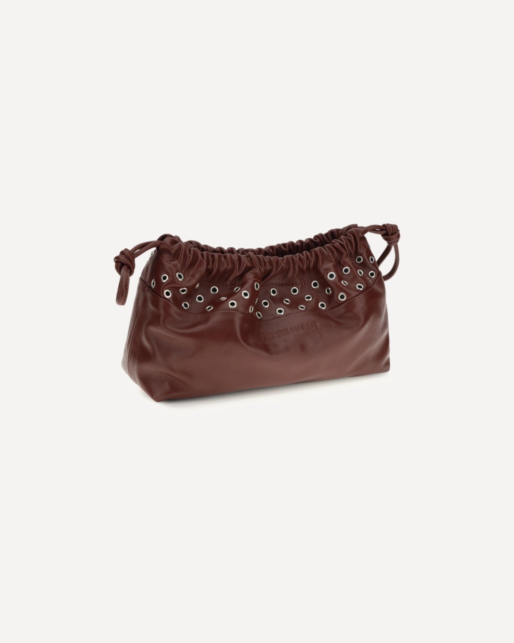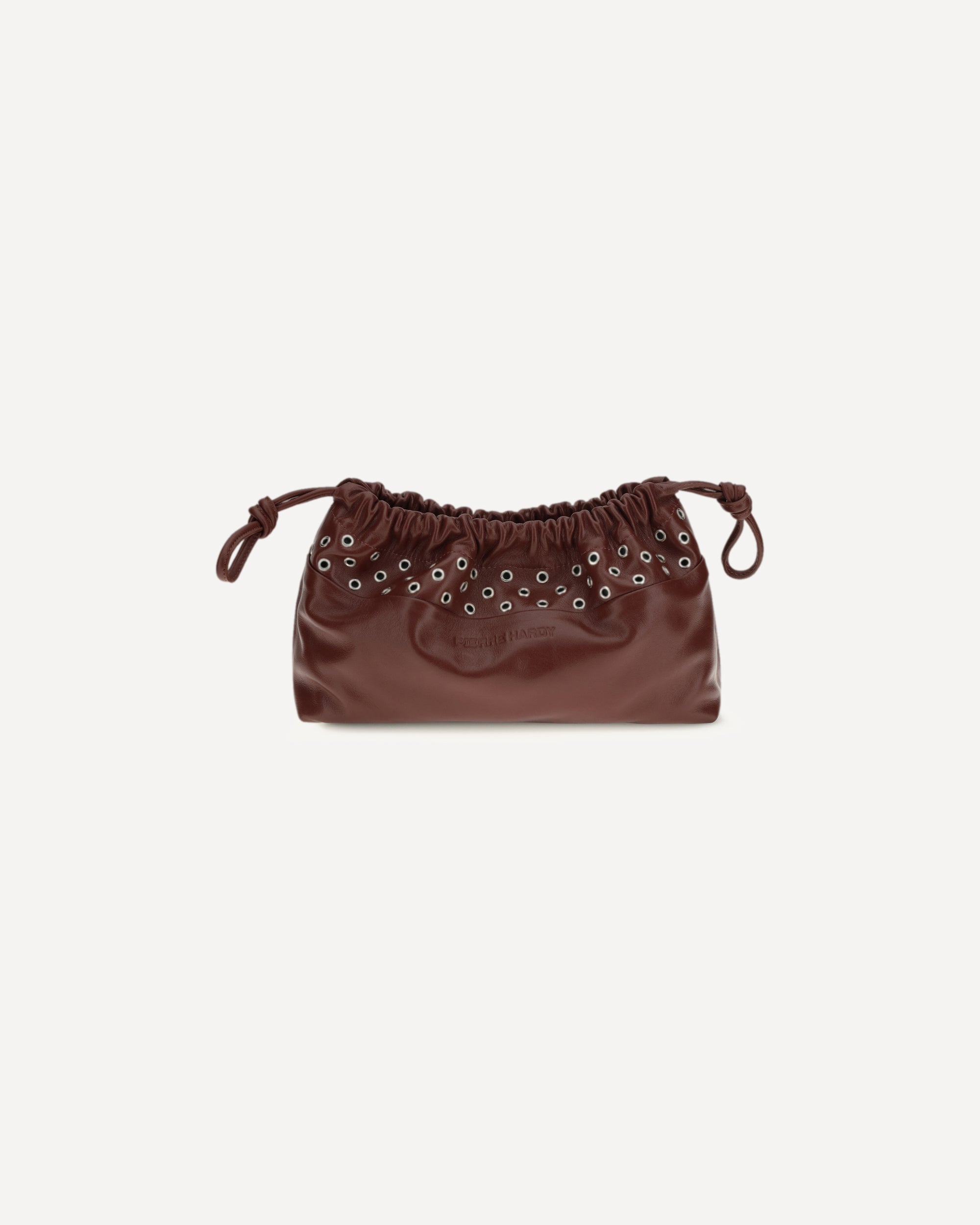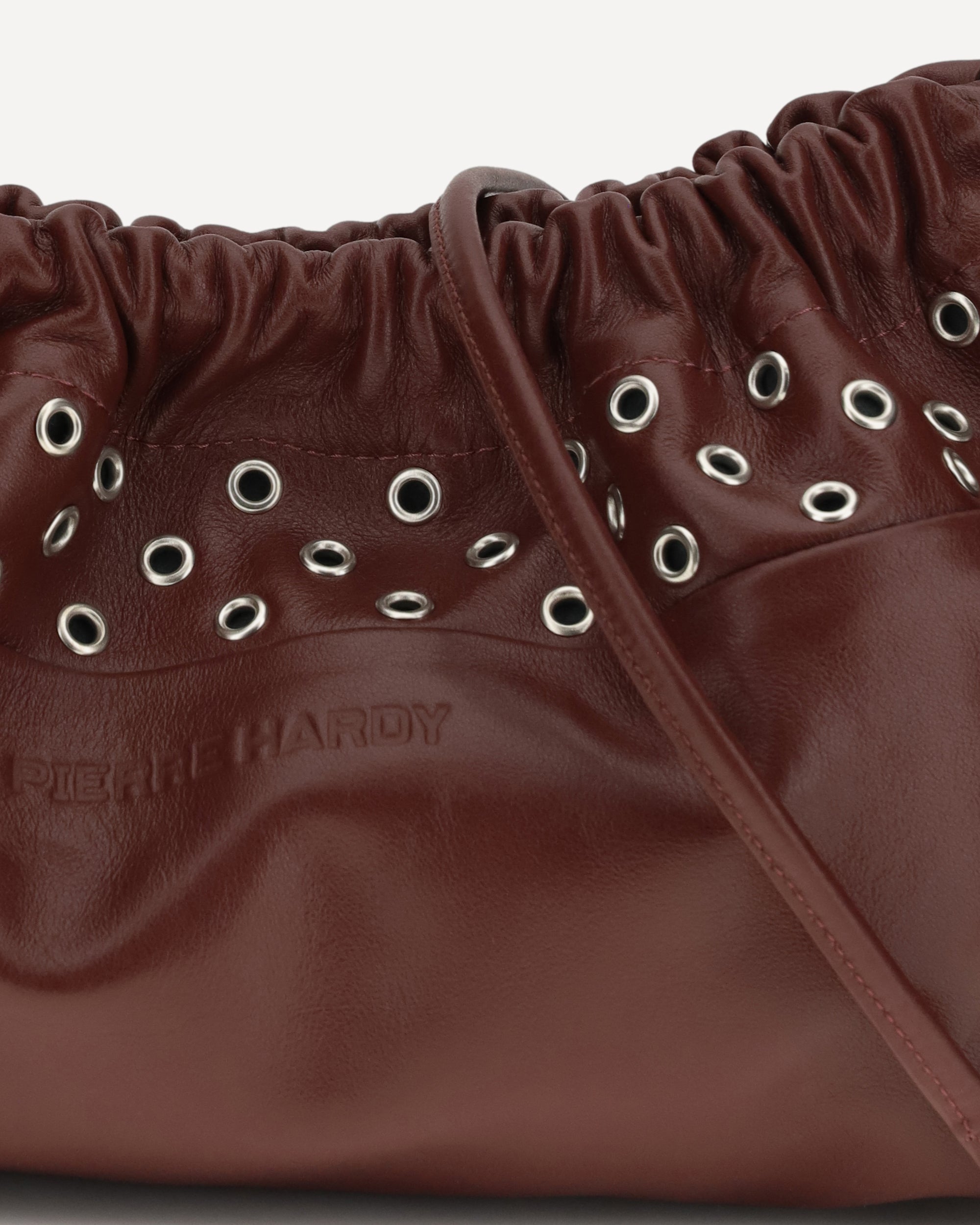 The Double Clutch with eyelets by by Pierre Hardy is crafted from calfskin leather and stands out for its panel decorated with bold metal eyelets. Featuring a leather drawstring closure, double magnetic closure, and detachable thin shoulder strap, it offers practicality and versatility. The embossed PIERRE HARDY logo and interior pocket complete the design with a distinctive and refined touch.
