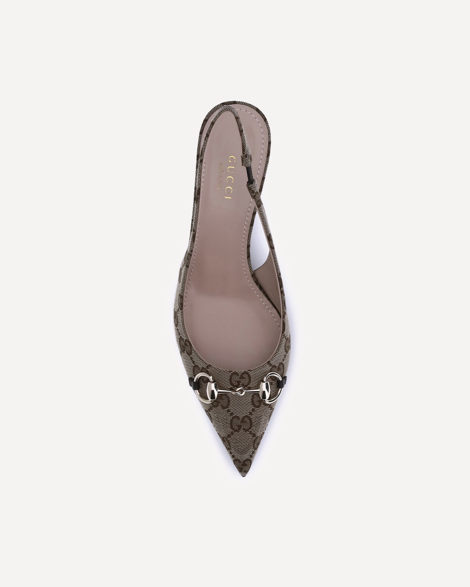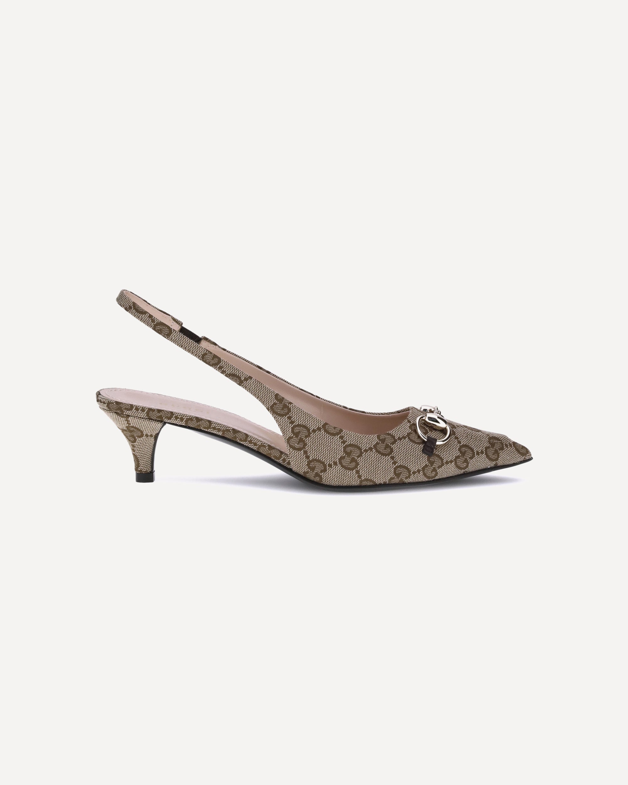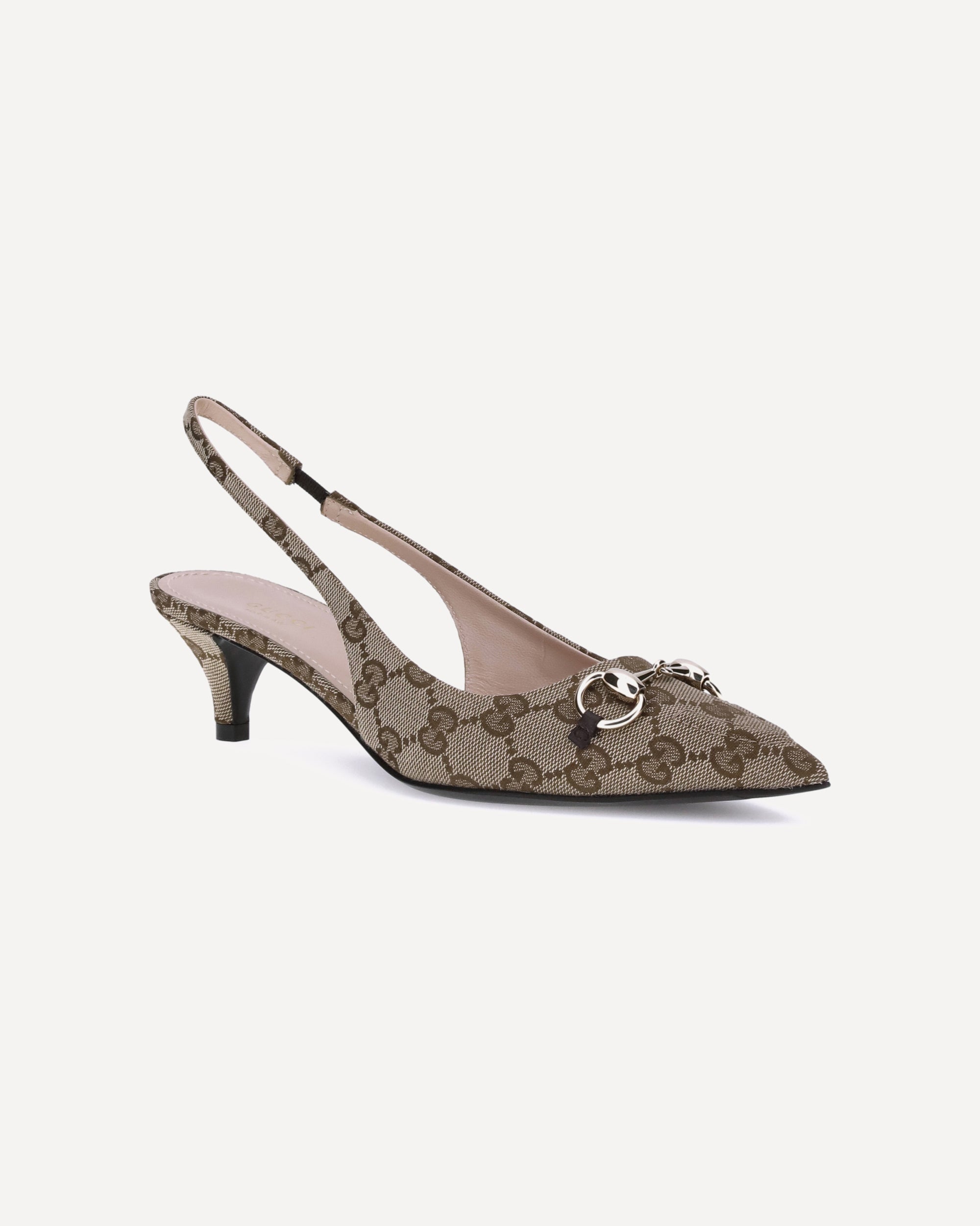 Gucci's slingback Pumps, part of the Gucci Lido line, evoke the summer spirit and relaxed atmosphere of beach clubs on the Italian coast. Made of Original GG fabric in beige and brown tones, they are enhanced by brown leather trim and light gold details. The pointed silhouette lends elegance, while the elastic strap and low heel ensure comfort and versatility, perfect for casual elegance on summer days.