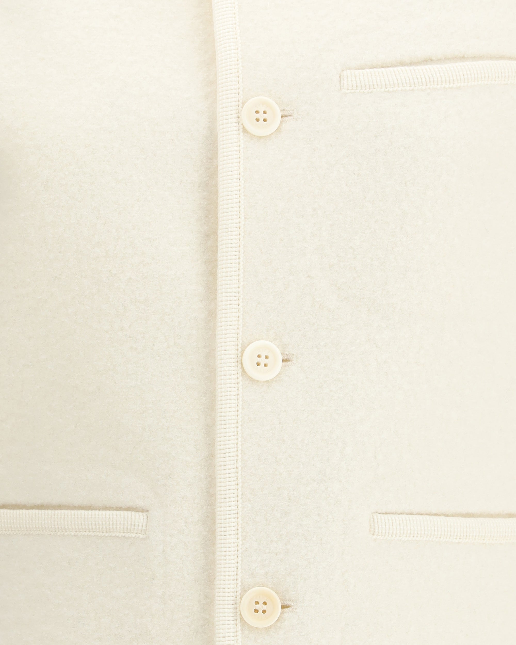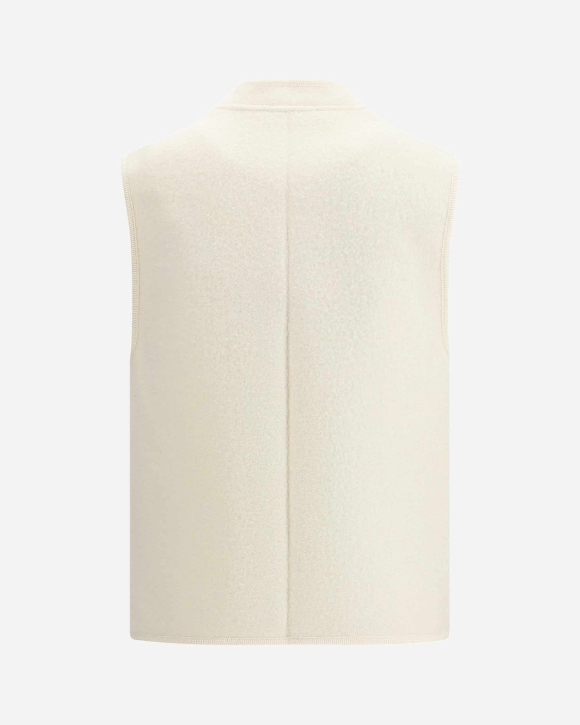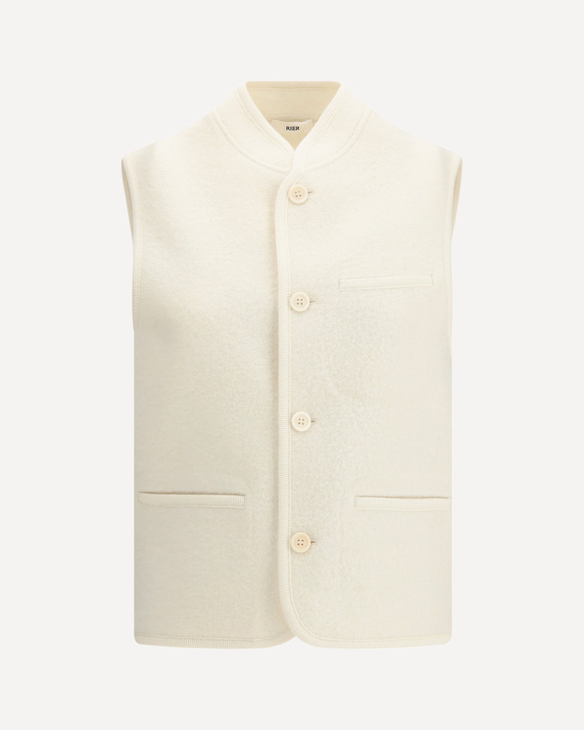 The Walker Boxy Vest by Rier is crafted from 100% wool, woven like a knit and felted like a Loden, ensuring lightness, natural stretch, and wrinkle resistance. Entirely unlined, it is framed with an authentic natural wool border woven in Austria and offers protection and temperature regulation throughout the seasons. It features two lower pockets, a chest pocket on the outside, and an internal patch pocket for small essentials. Inspired by medieval designs, the Walker stands as an icon of craftsmanship and modernity — sustainable, microplastic-free, and easy to maintain.