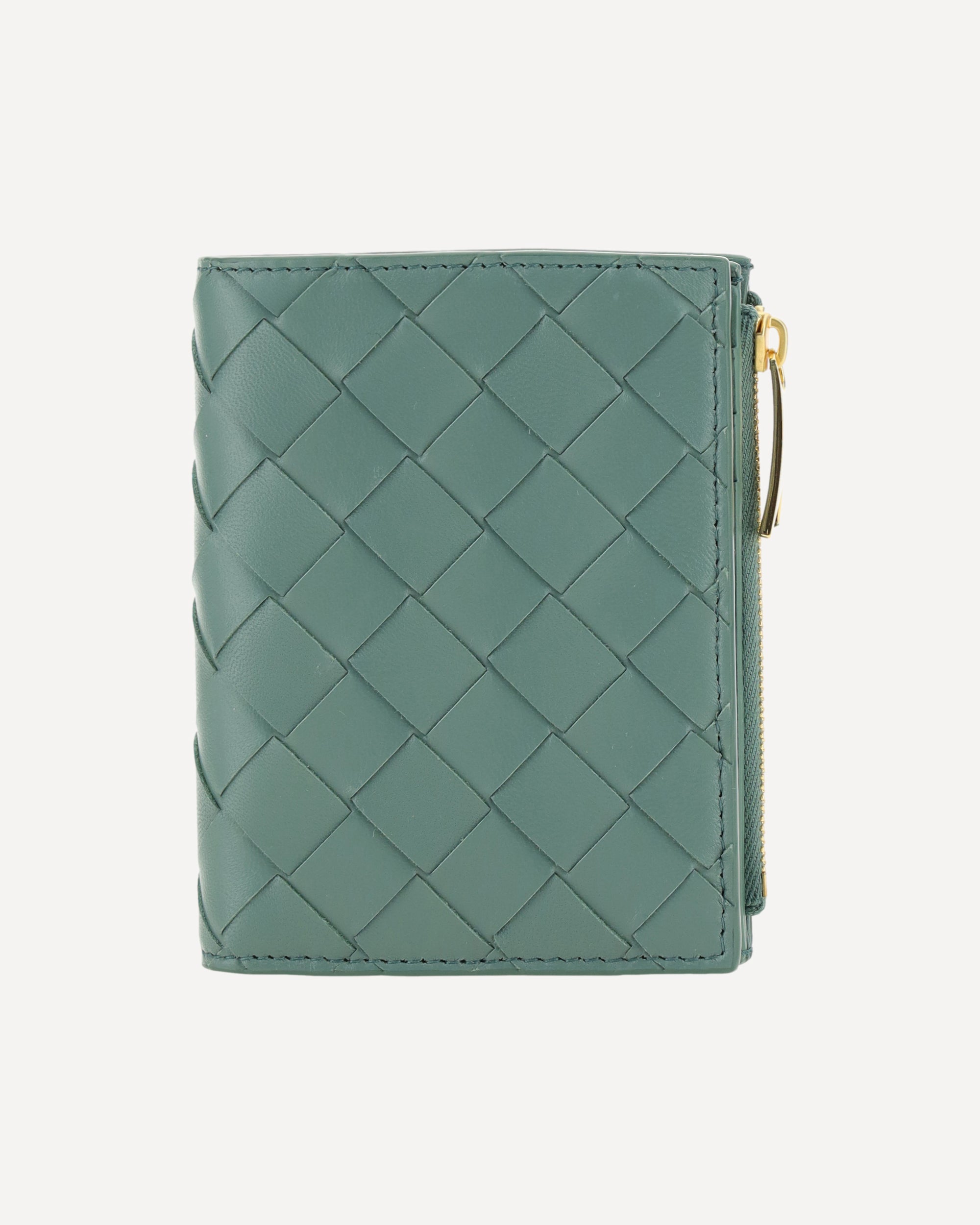 The lambskin Wallet by Bottega Veneta combines elegance and functionality with its iconic all-over intrecciato motif. Featuring a double card slot, a bill compartment and a zipped coin pocket, it features a snap button closure and the brand's monogram printed inside. A compact and sophisticated accessory, perfect for those seeking style and practicality.