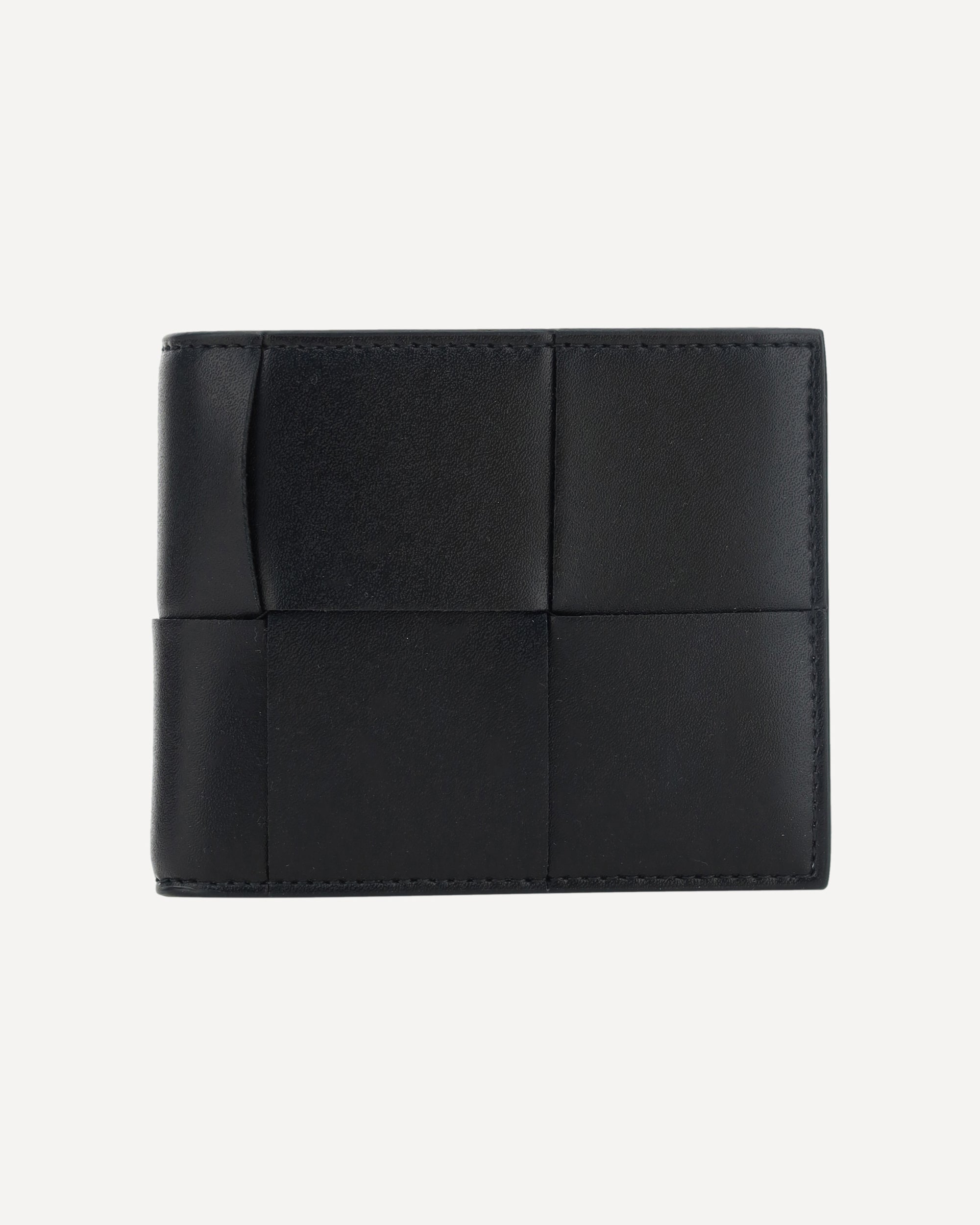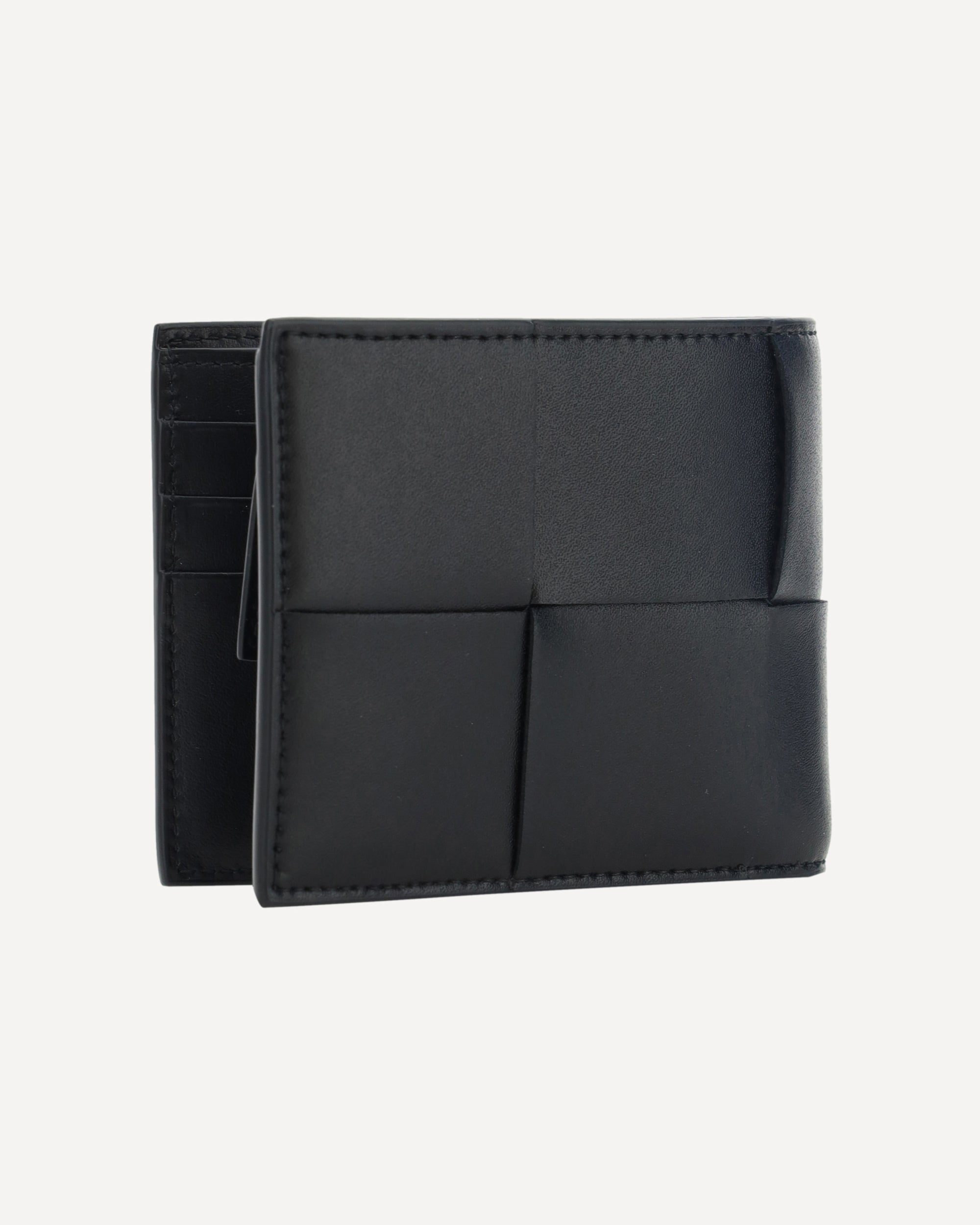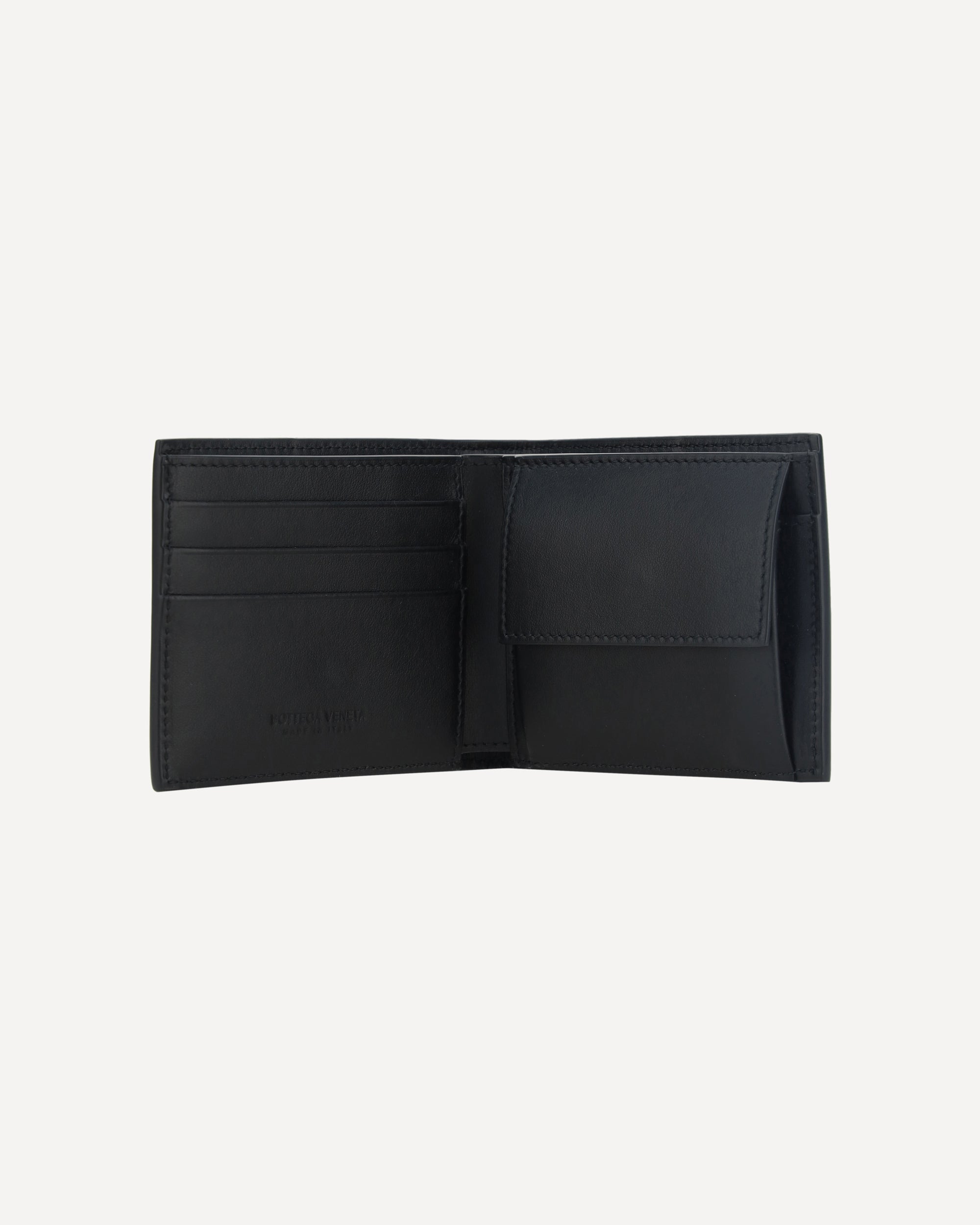 Lambskin Wallet by Bottega Veneta, billfold model, iconic all-over repeated brand woven design, card slots inside, coin compartment with snap-button closure, billfold compartment, iconic brand monogram press-stamped inside.