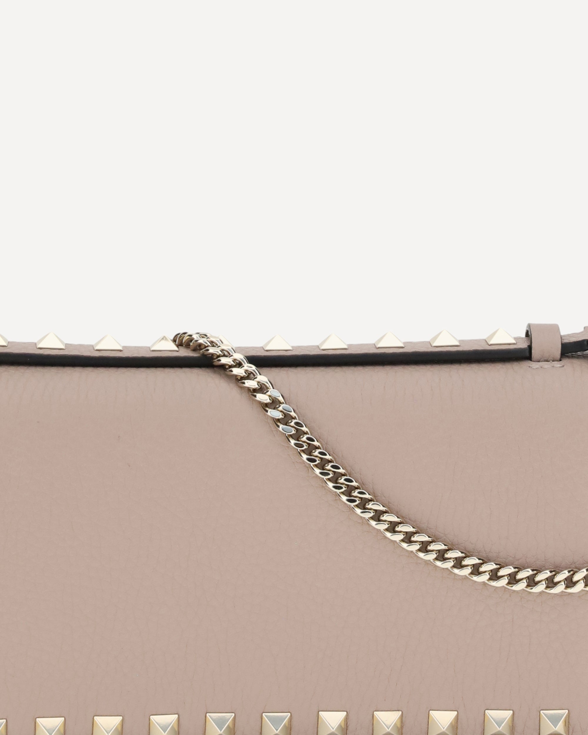The Rockstud chain Wallet by Valentino Garavani is a sophisticated and versatile accessory made of garnet calfskin and embellished with the iconic Rockstud studs with platinum finish. It can be worn by hand, on the shoulder or cross-body thanks to the leather handle and removable chain. The magnetic button closure ensures practicality, while the interior is organized with a zippered wall pocket and a card compartment, perfect for having the essentials with you at all times, with a touch of decisive elegance.