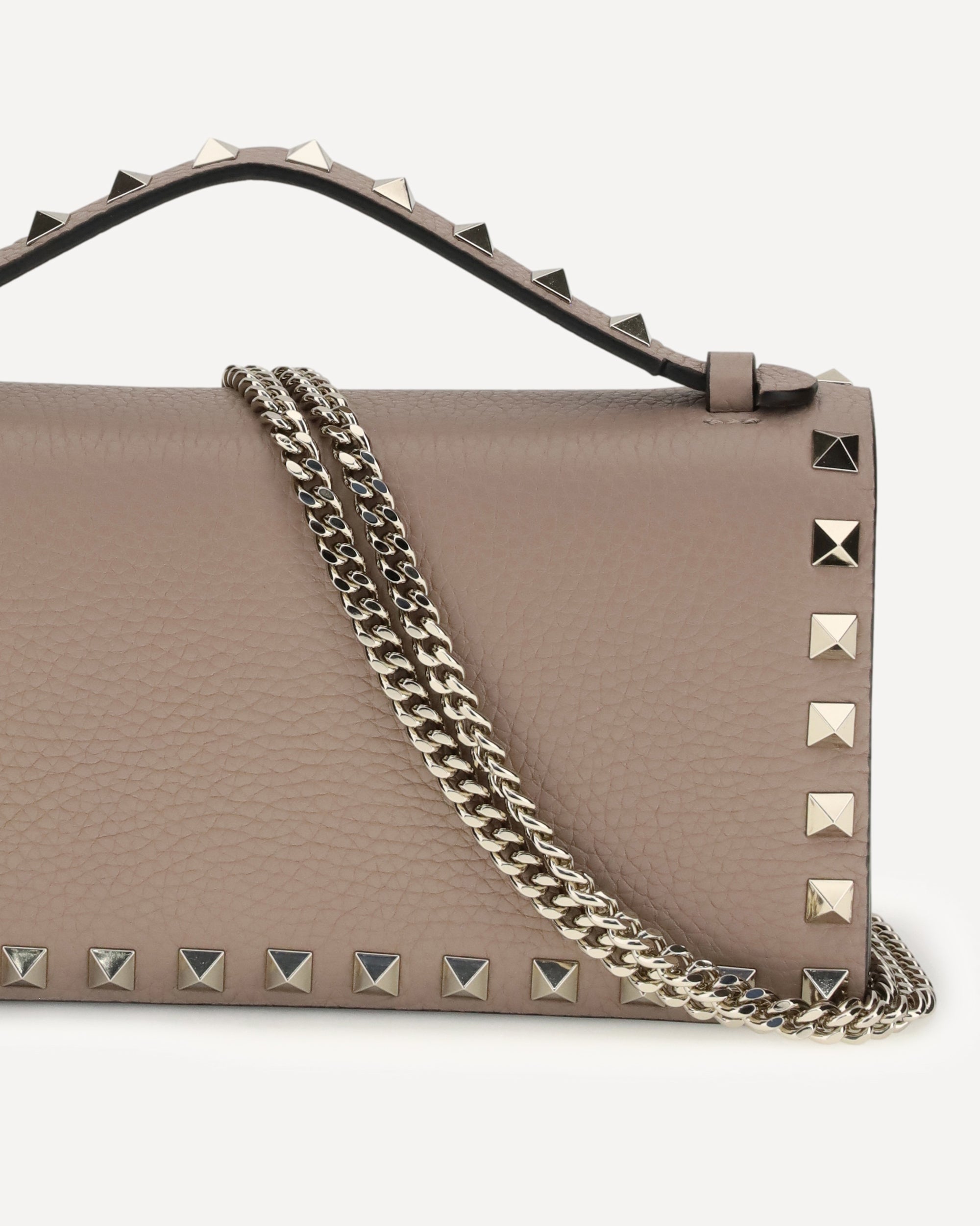 The Rockstud chain Wallet by Valentino Garavani combines practicality and iconic style thanks to the studs and metallic parts with Platinum finish, which enhance its distinctive character. The magnetic button closure ensures easy and immediate opening, while the interior offers a zippered wall pocket and card compartment, ideal for organizing essentials. Nappa leather lining adds a touch of softness and luxury, making this an elegant and functional accessory for any occasion.